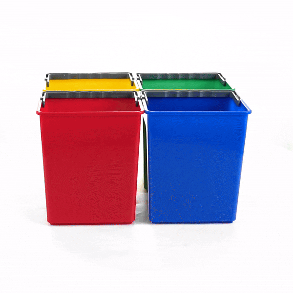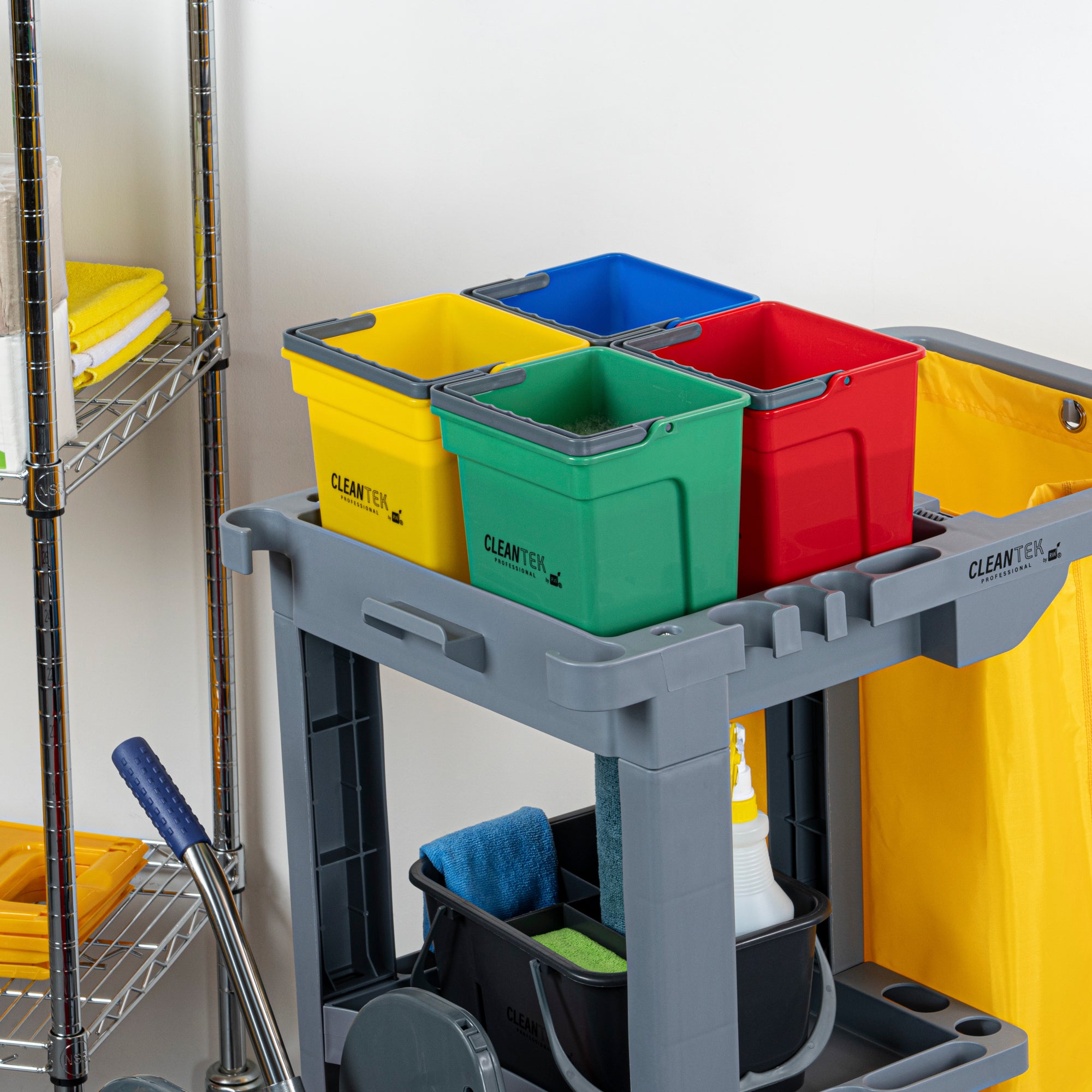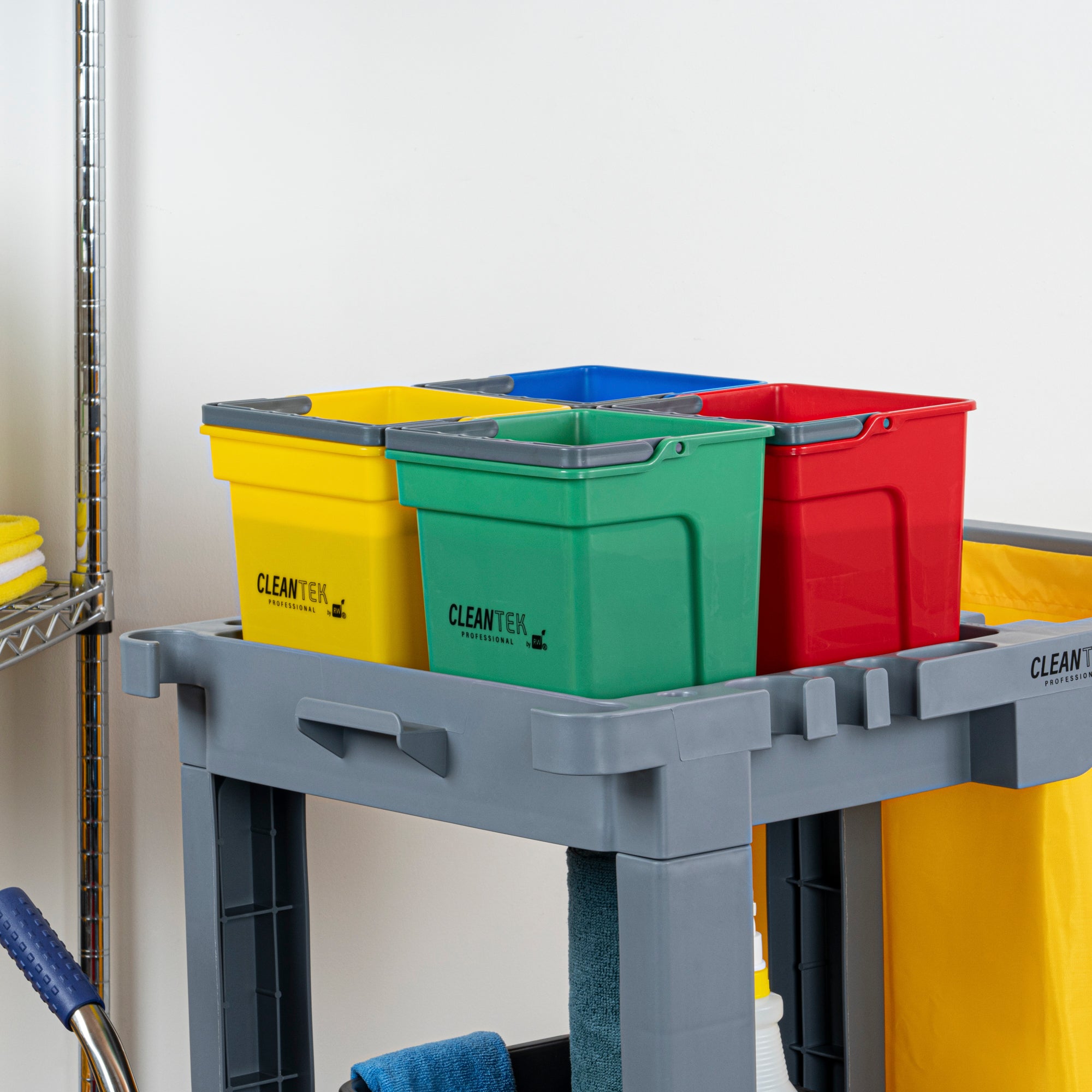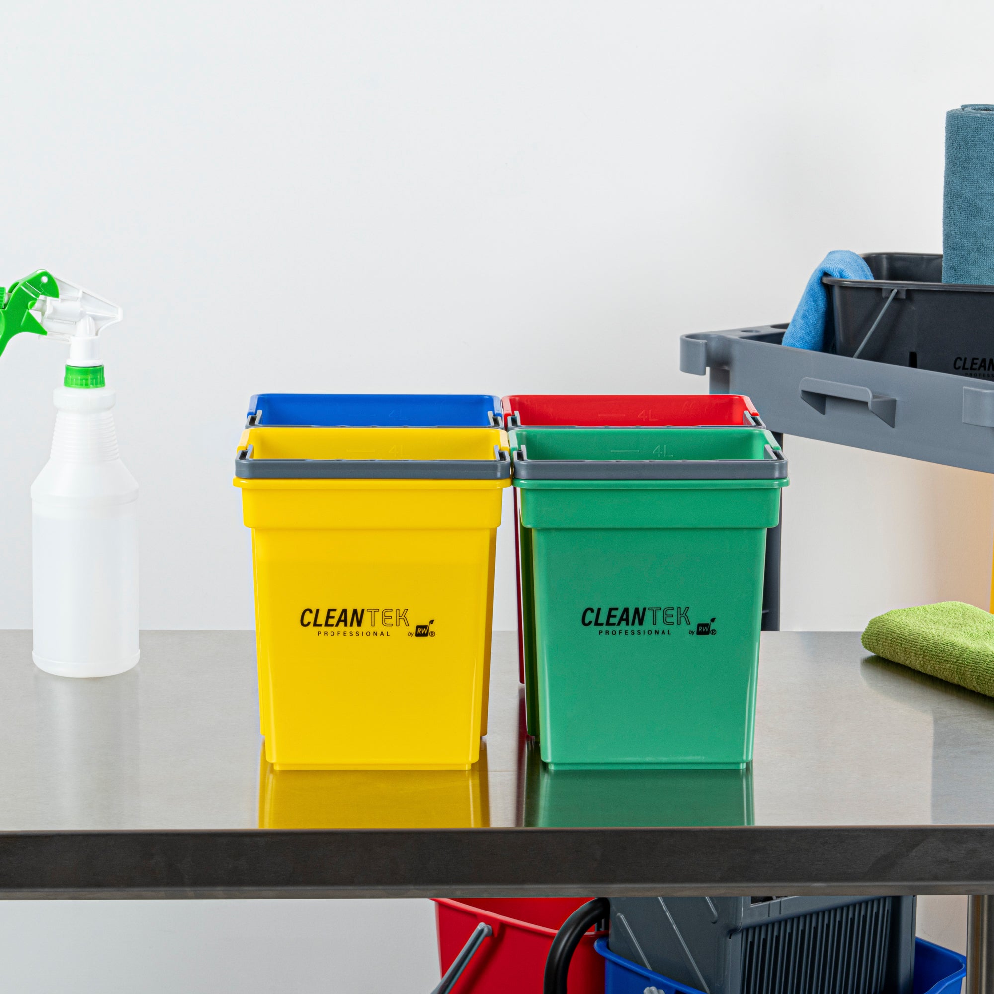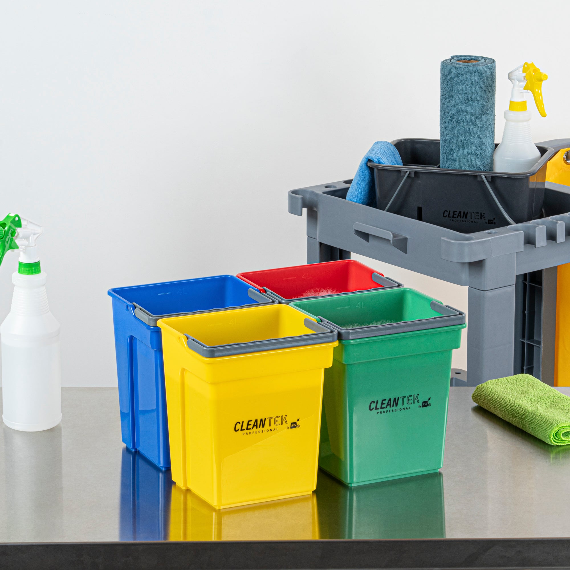 4 QT GREEN, BLUE, RED AND YELLOW CLEANING BUCKETS