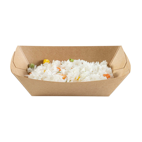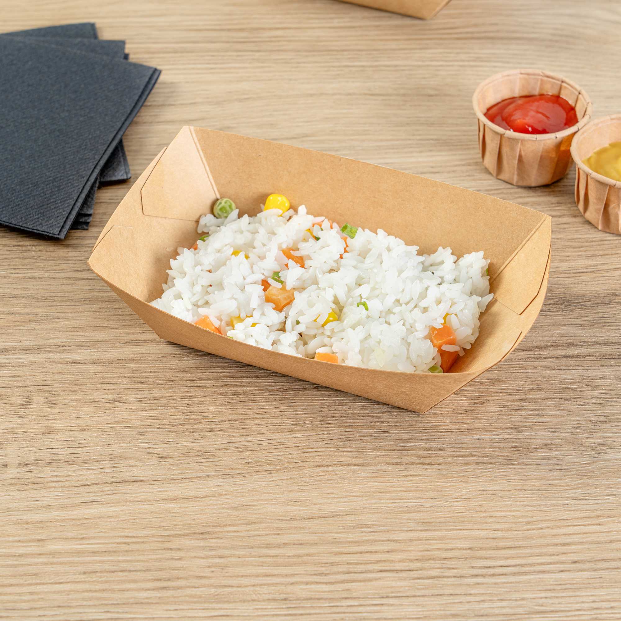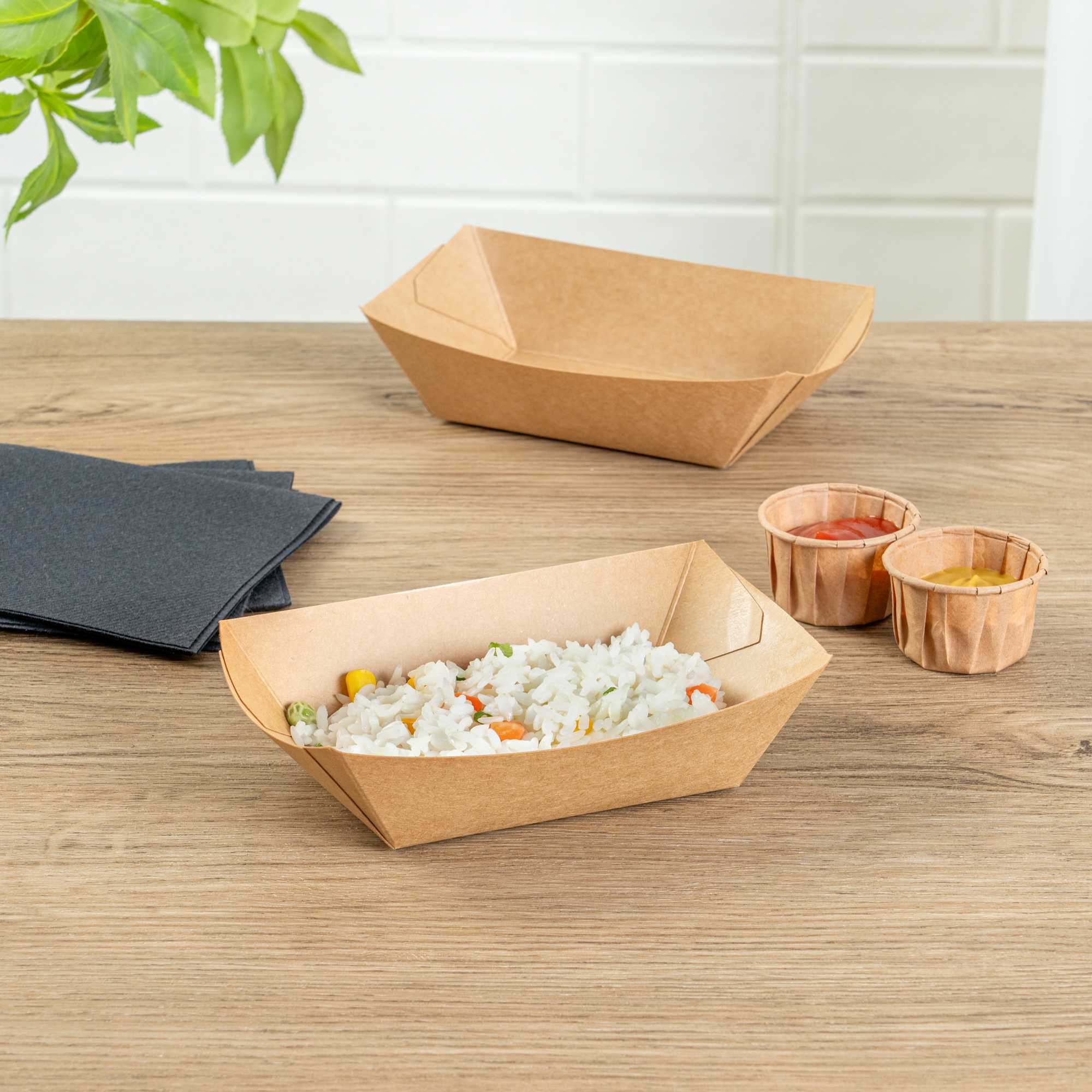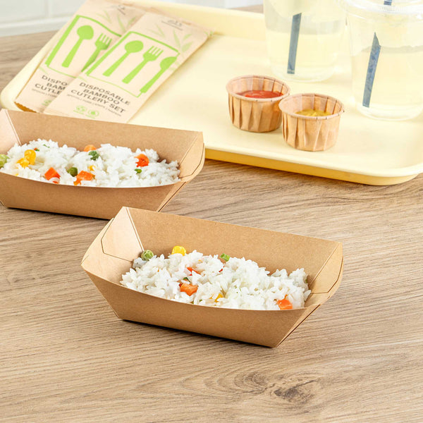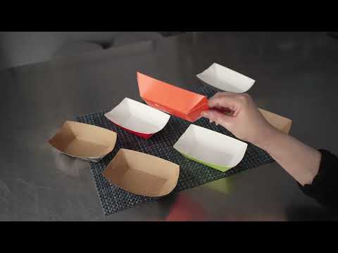 These paper food boat trays have an ultra-portable design to easily serve meals. Ideal for food trucks, family parties, and catering companies!