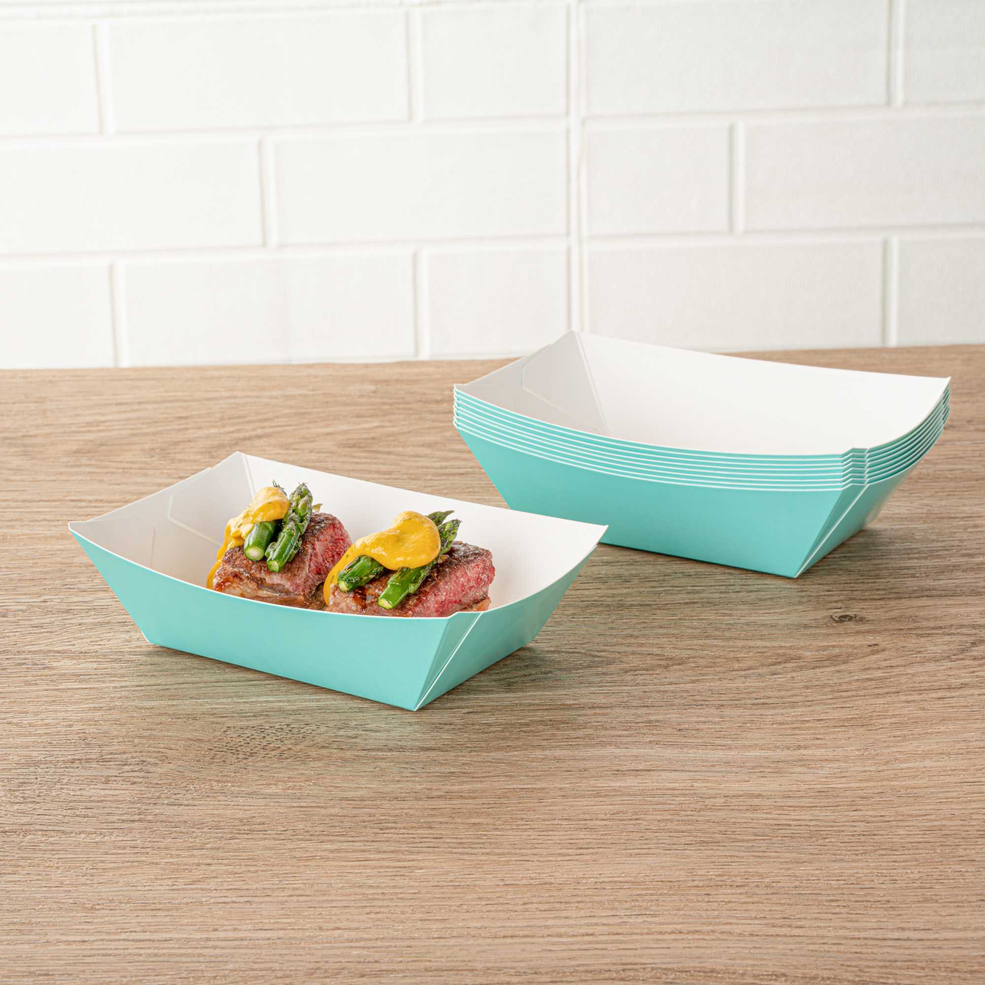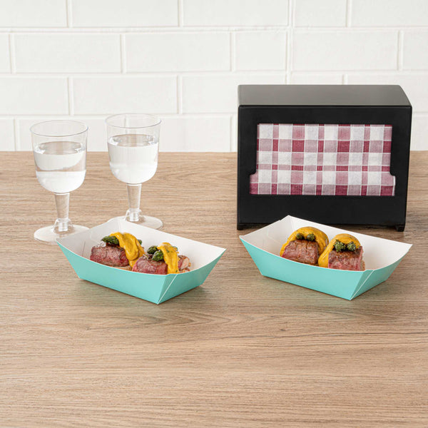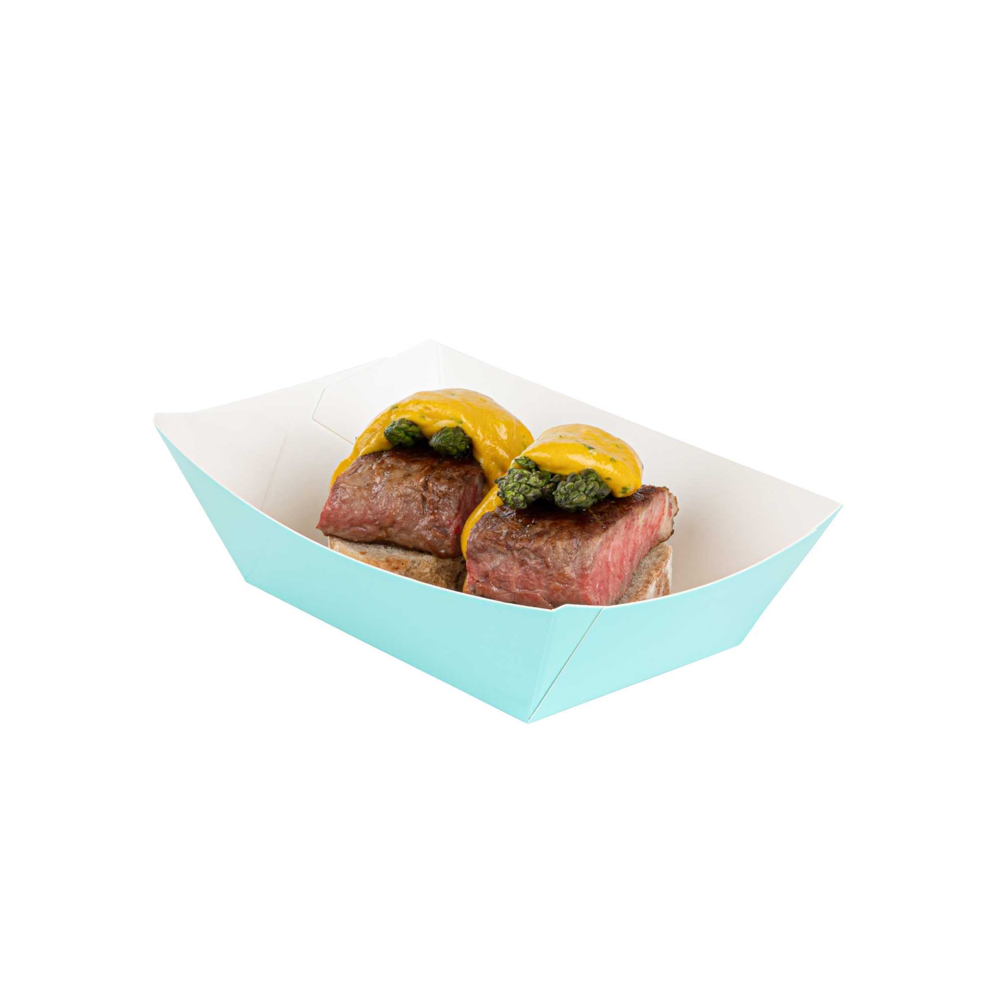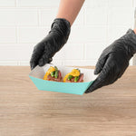 Transform your dining experience with our Bio Tek 0.5-pound Turquoise Paper #50 Food Tray / Boats. Created from sustainable paper, these 0.5-pound turquoise food trays bring an air of sophistication to your culinary presentations. Engineered to hold substantial portions, these sturdy trays are an excellent fit for hearty appetites. Enhanced with a greaseproof lining, they're tailor-made for dishes enriched with oil or moisture. From gourmet burgers to delectable lobster rolls and crispy Caesar salads and chicken wings, these #50 paper food trays redefine convenience for takeaway orders. Each tray measures 4.25 inches long by 2.75 inches wide at the base and 7 inches long by 4 inches wide at the top. Sold in a 400 count box.