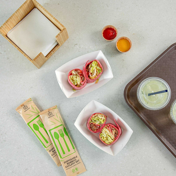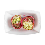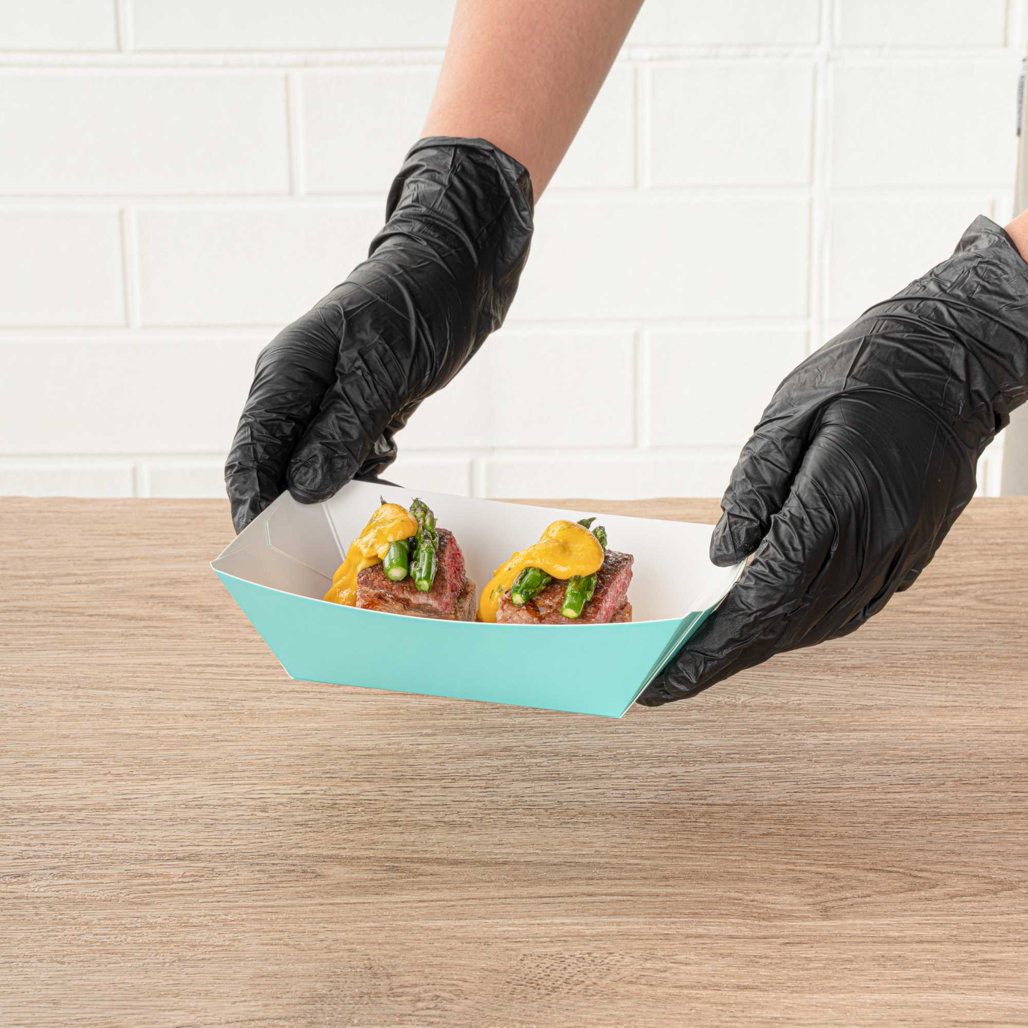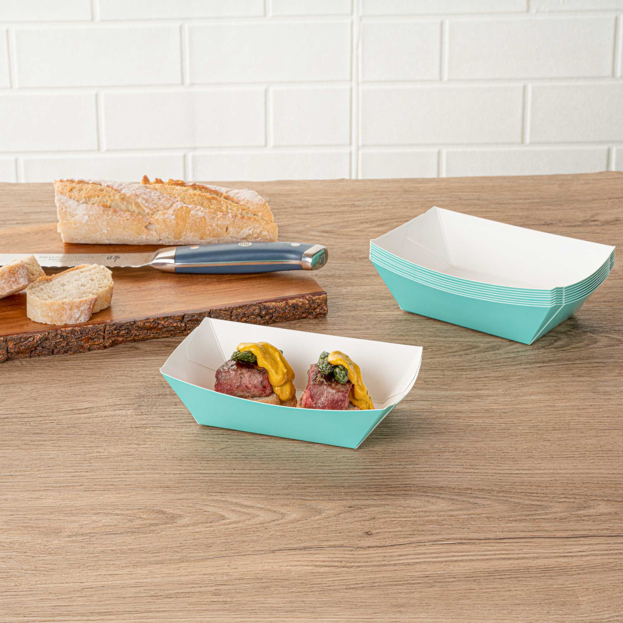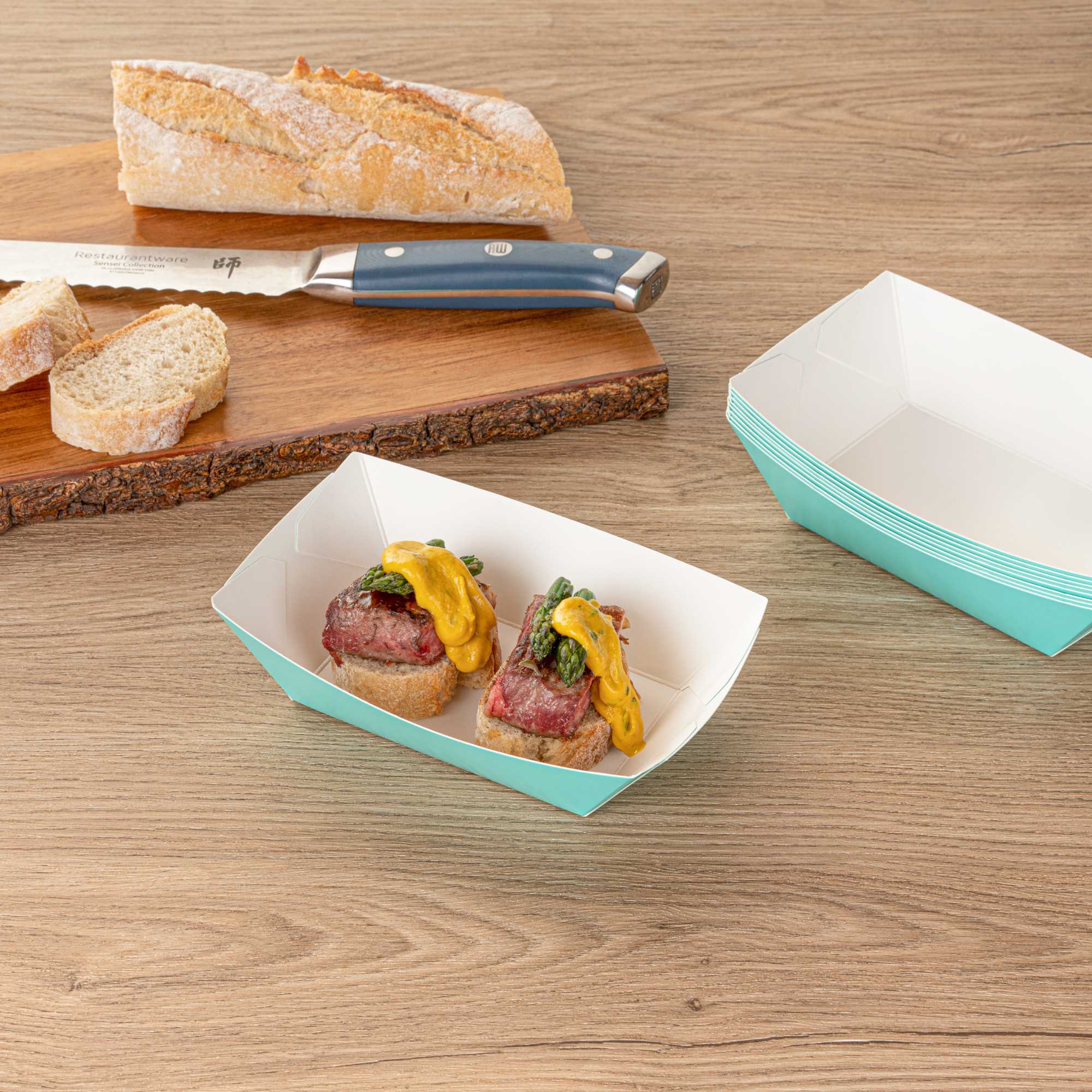 Transform your dining experience with our Bio Tek 0.5-pound Turquoise Paper #50 Food Tray / Boats. Created from sustainable paper, these 0.5-pound turquoise food trays bring an air of sophistication to your culinary presentations. Engineered to hold substantial portions, these sturdy trays are an excellent fit for hearty appetites. Enhanced with a greaseproof lining, they're tailor-made for dishes enriched with oil or moisture. From gourmet burgers to delectable lobster rolls and crispy Caesar salads and chicken wings, these #50 paper food trays redefine convenience for takeaway orders. Each tray measures 4.25 inches long by 2.75 inches wide at the base and 7 inches long by 4 inches wide at the top. Sold in a 400 count box.