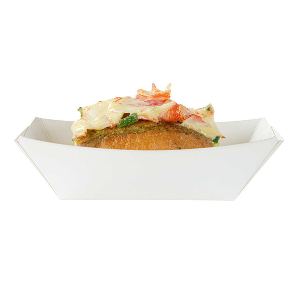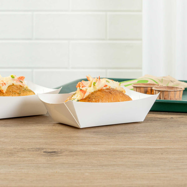These paper food boat trays have an ultra-portable design to easily serve meals. Ideal for food trucks, family parties, and catering companies!