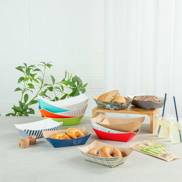 With numerous options to choose from, these paper food trays come in multiple colors to complement all kinds of food service establishments. Pick the paper boat that best fits your aesthetic!