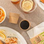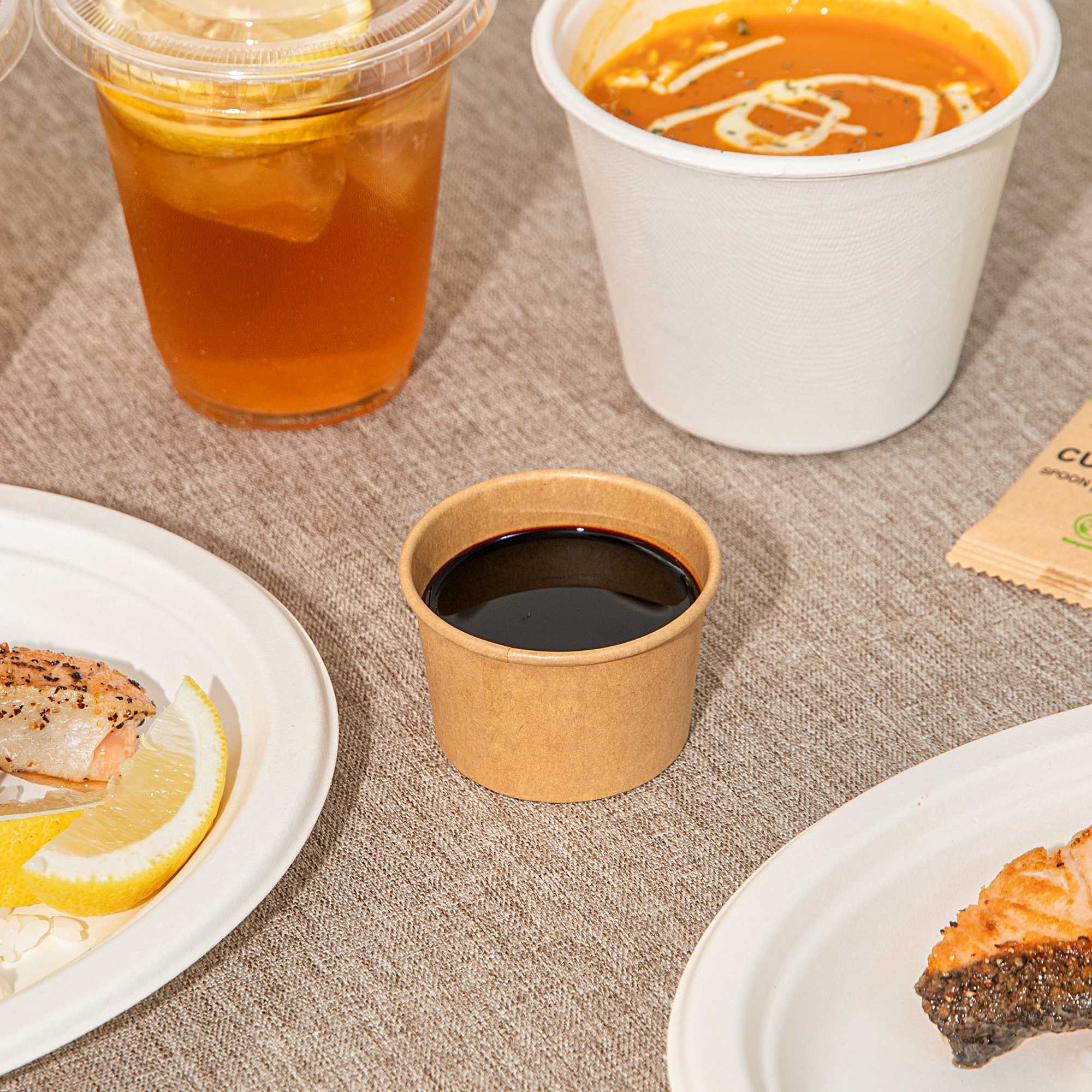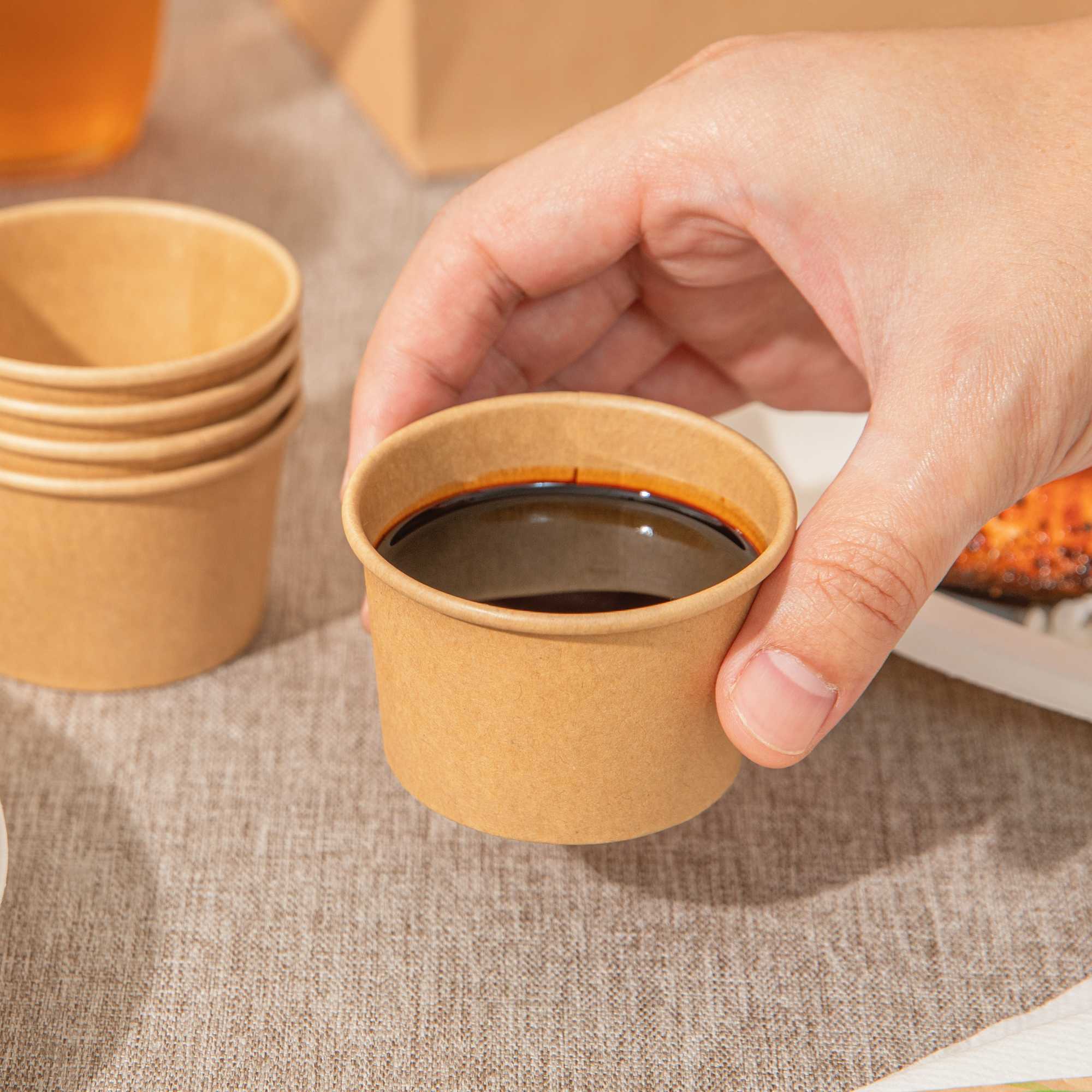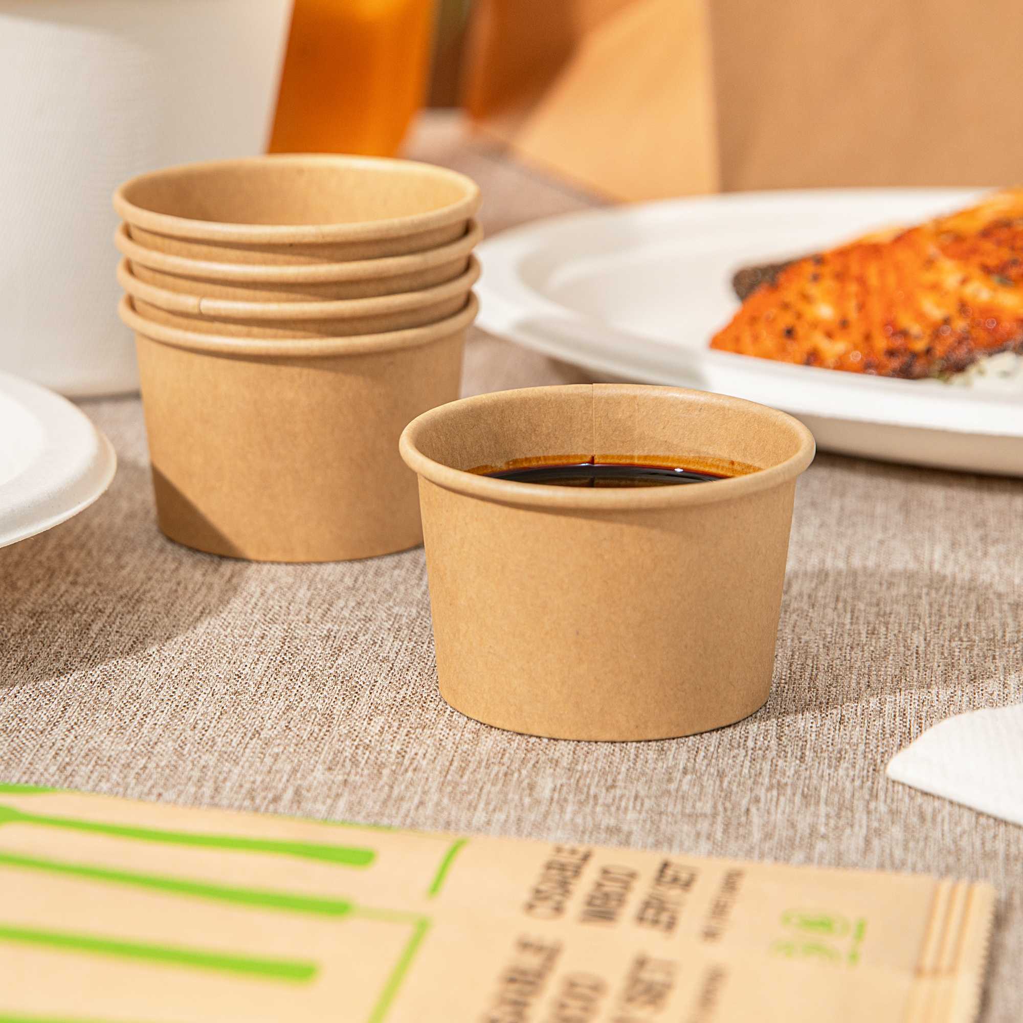 Ensure flawless sauce presentation with our Bio Tek 1 oz Kraft Poly-Coated Paper Portion Cup. This disposable sauce cup, crafted from 210gsm kraft paper with a PE coating, features a greaseproof, leak-proof, and moisture-resistant design that prevents messy spills during service, making it an indispensable tool for busy kitchens. Its freezer-safe construction is perfect for storing desserts, keeping them fresh and ready for plating. Measuring 2.44 inches in diameter by 1.58 inches in width with capacity of 1 ounce, this small sauce container is ideal for both hot and cold foods, offering versatile use across diverse menu offerings. The recyclable nature of this kraft paper sauce cup underscores your commitment to sustainability while providing practical benefits. Elevate your food presentation and streamline operations with the reliability of our sauce cups. Each order includes 2000 Bio Tek 1 oz Kraft Poly-Coated Paper Portion Cups.