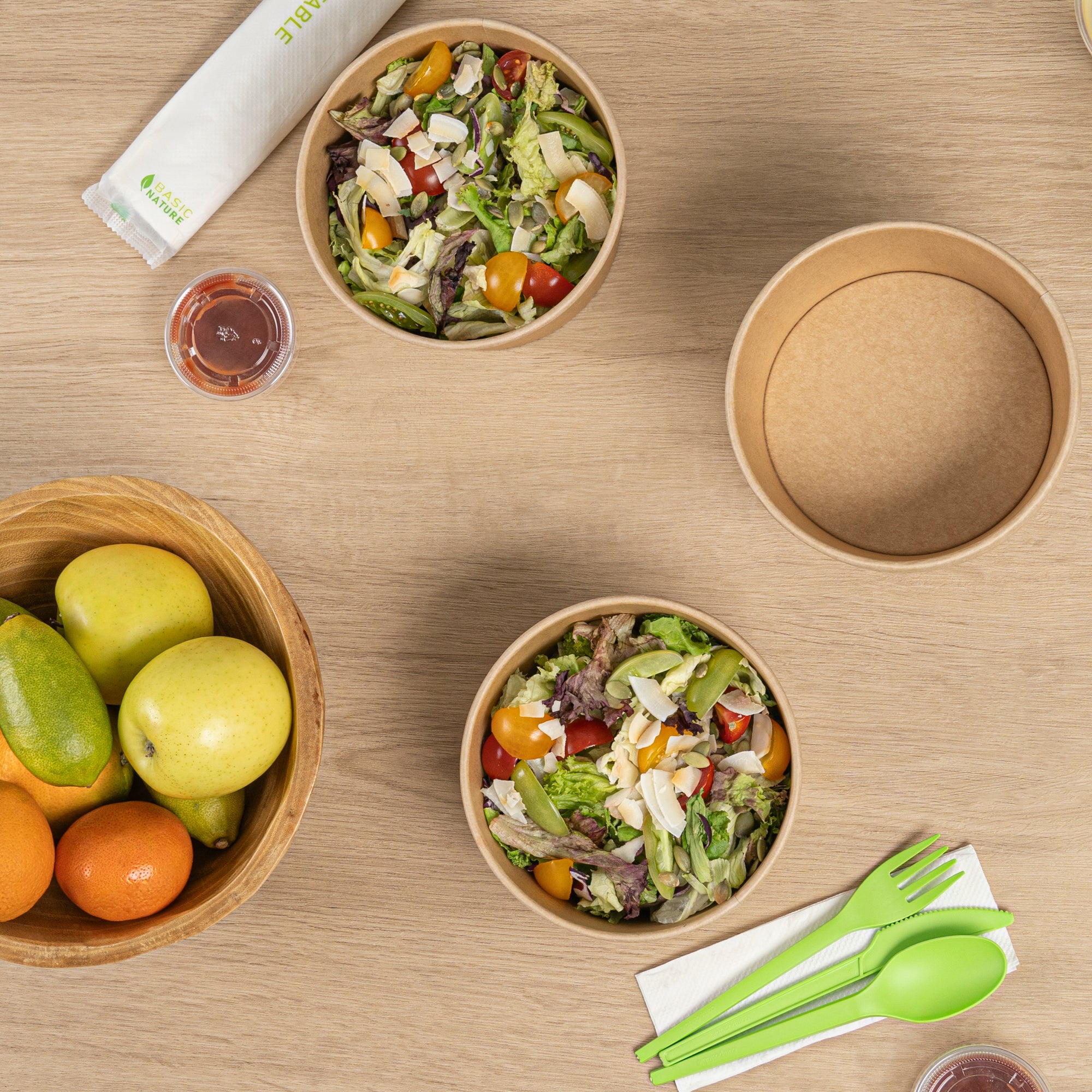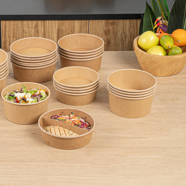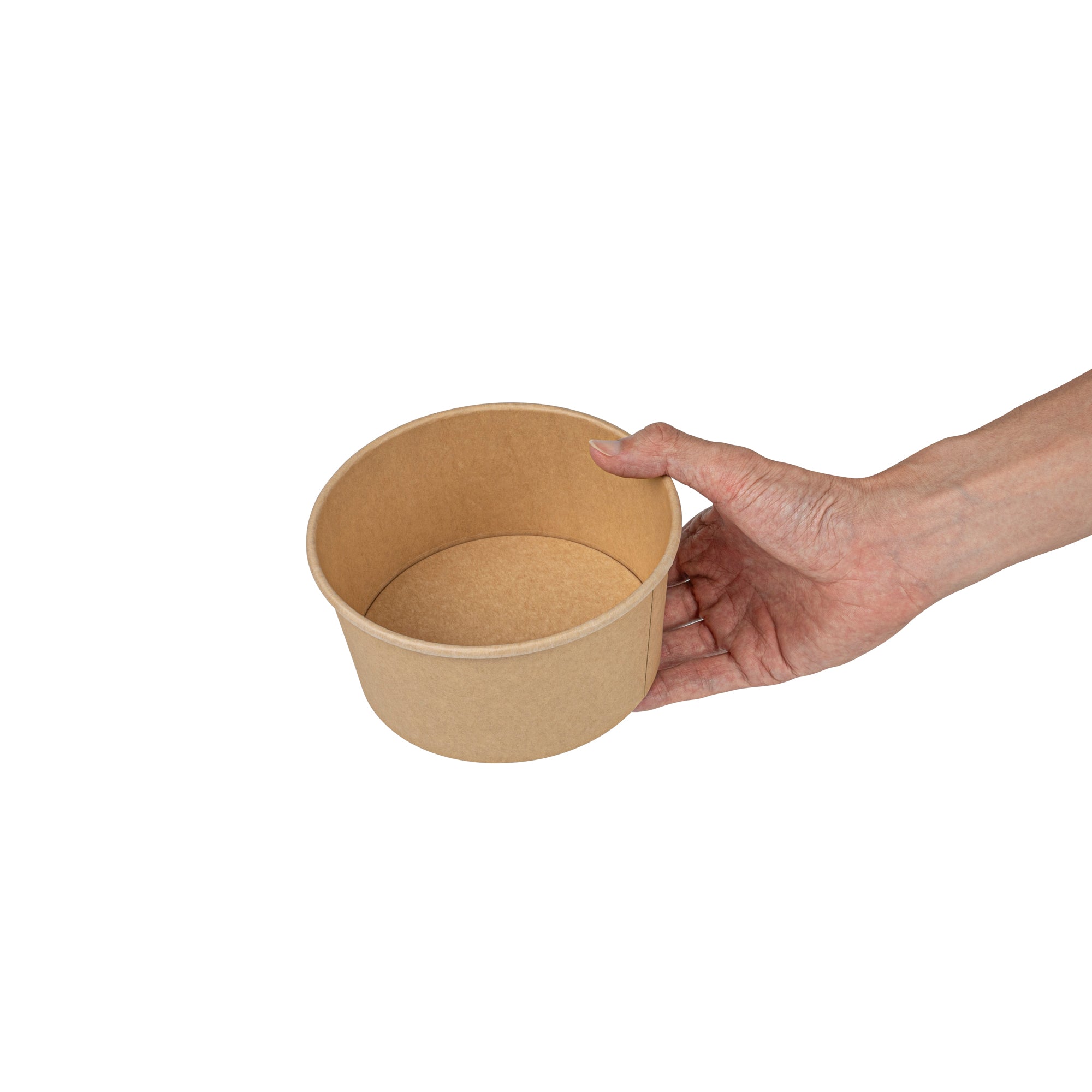 Pack you to go food orders with our Bio Tek 34-ounce Round Kraft Paper Take Out Containers. These takeaway containers pair perfectly with coordinating plastic lids (SKU: RWA1437C) to keep your culinary creations intact during transit. Featuring a grease-resistant design these take out boxes prevent sauces from soaking through and ensure a neat food presentation. These to go containers have a PP lining, making them microwave-safe and can withstand high temperatures up to 248F. Made from thick kraft paper, these carry out containers are suitable for holding various hot and cold food items. The rustic kraft finish of these take out food containers creates a charming look for your take out orders. These disposable food containers are recyclable and help minimize your carbon footprint, ideal for showcasing your eco-conscious practices to your patrons. To simplify your post-meal cleanup, these paper take out containers are disposable and can be easily discarded. Measuring 6 inches in diameter by 3 inches in height, these kraft paper containers can hold up to 34 ounces. Sold in a 200 count box. Lids are available and sold separately.