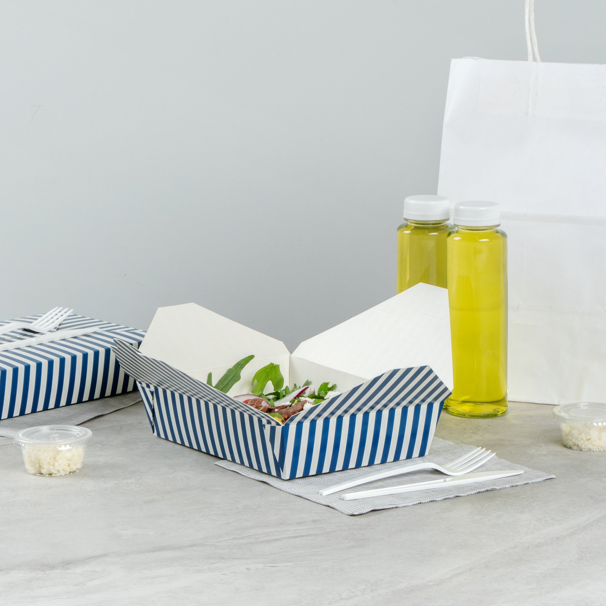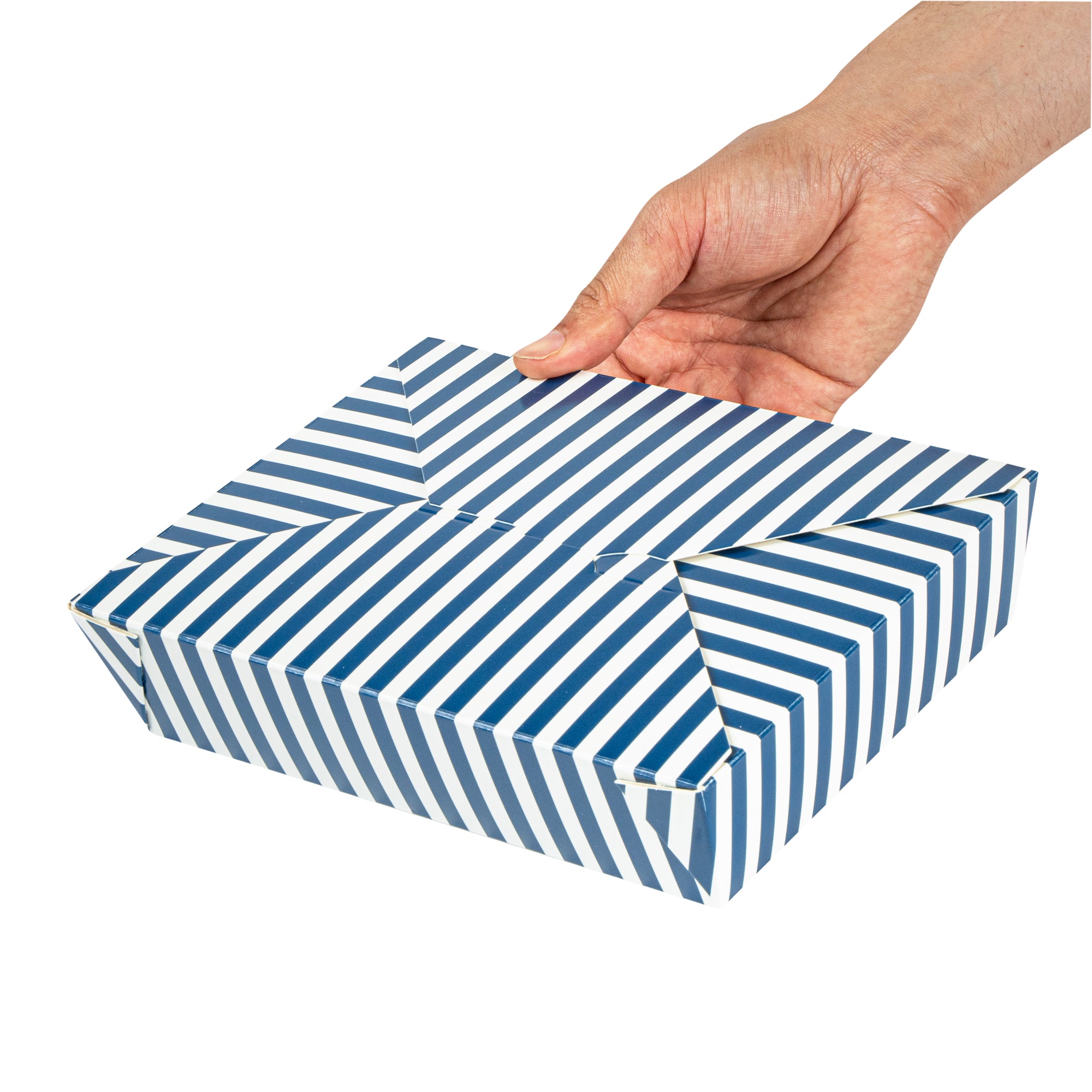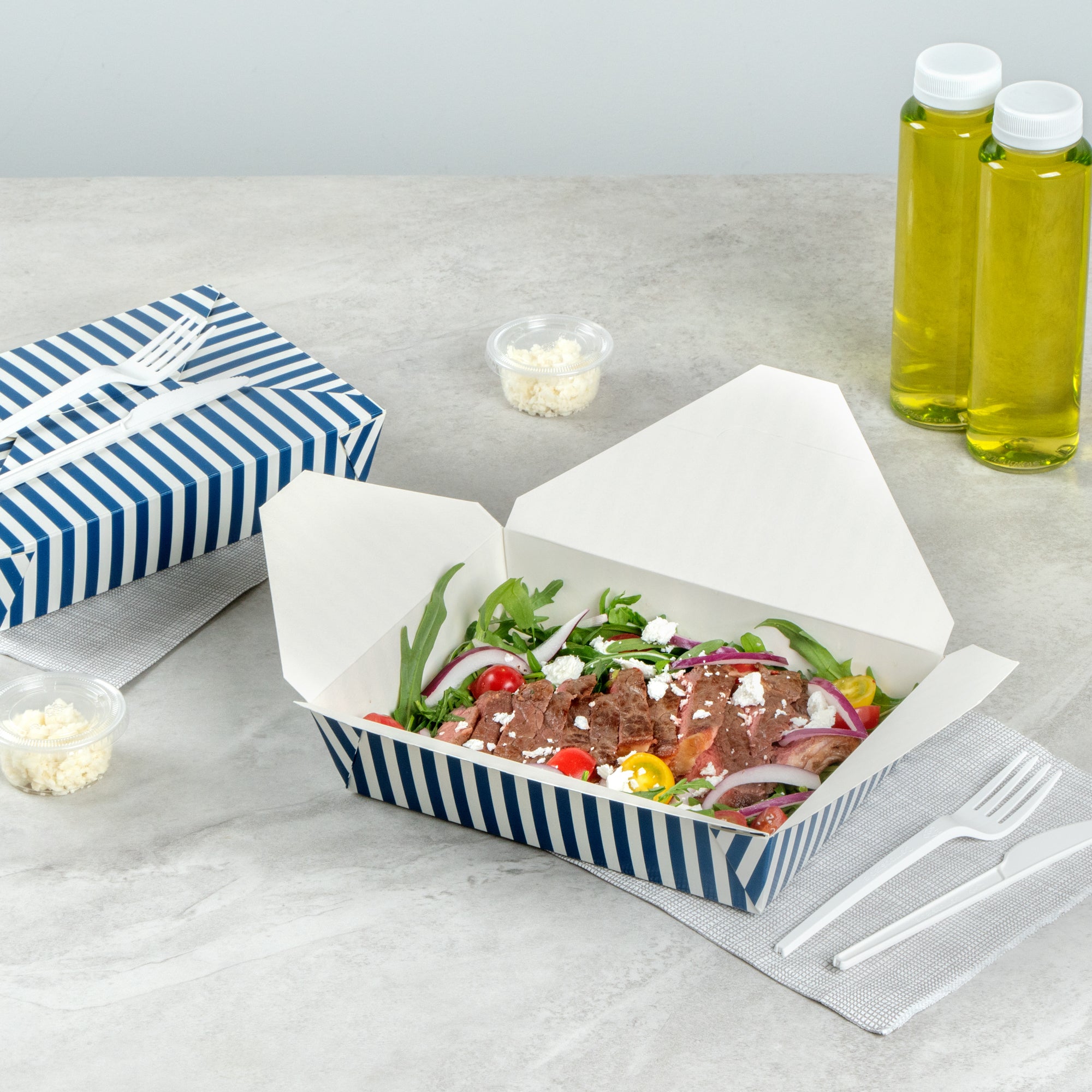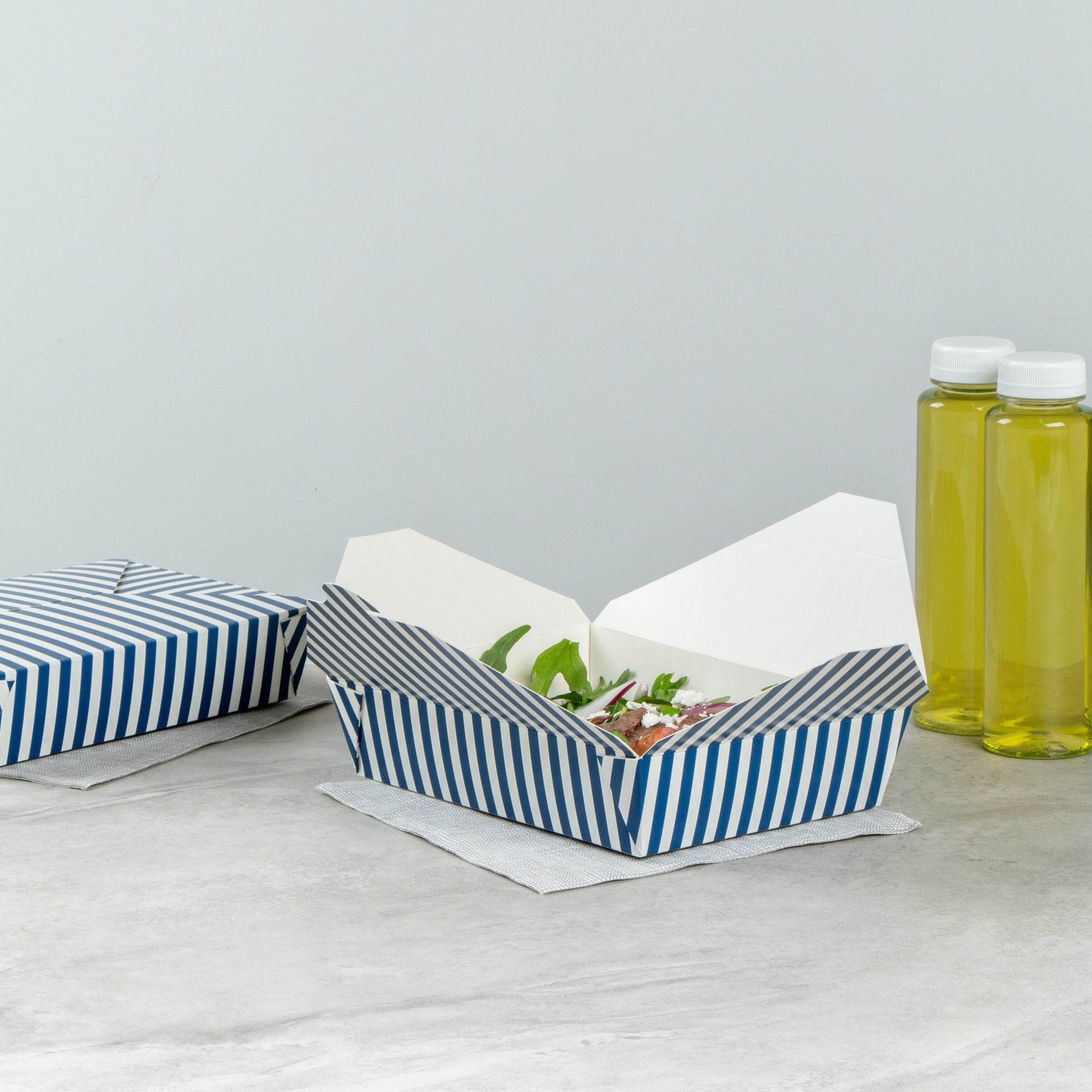 49 OZ BLUE AND WHITE STRIPE PAPER #2 BIO BOX TAKE OUT CONTAINER