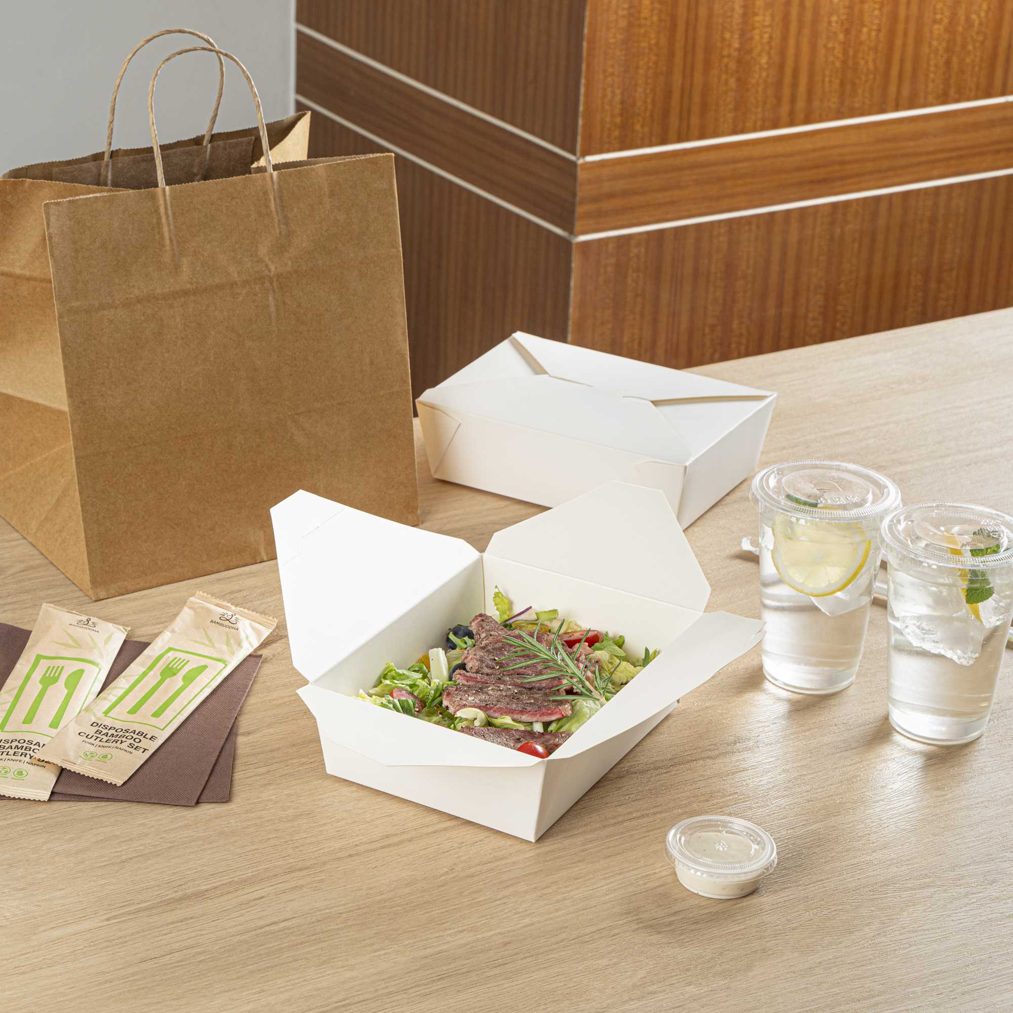 Providing an unmatched level of ease and portability, these bio boxes ensure a secure lock with their built-in tab lock, making for durable take out boxes. Their uniquely foldable design allows for easy storage, on-the-go functionality, and a minimalistic approach.