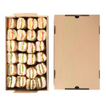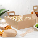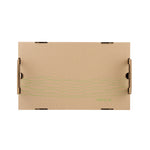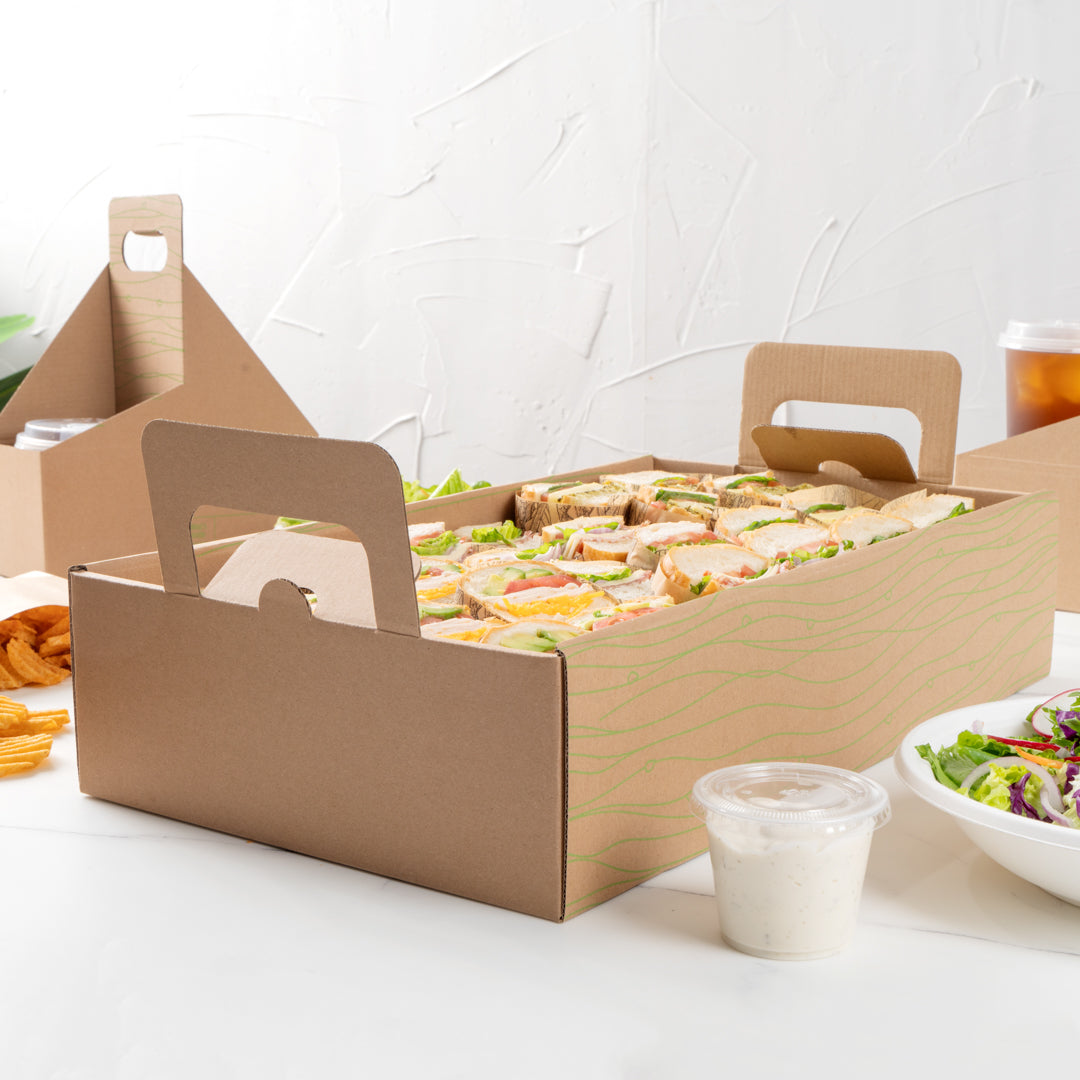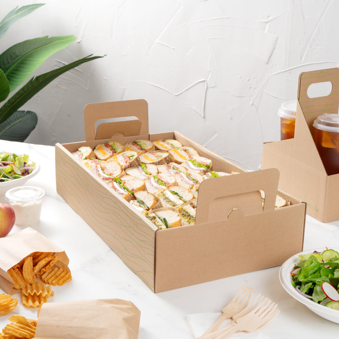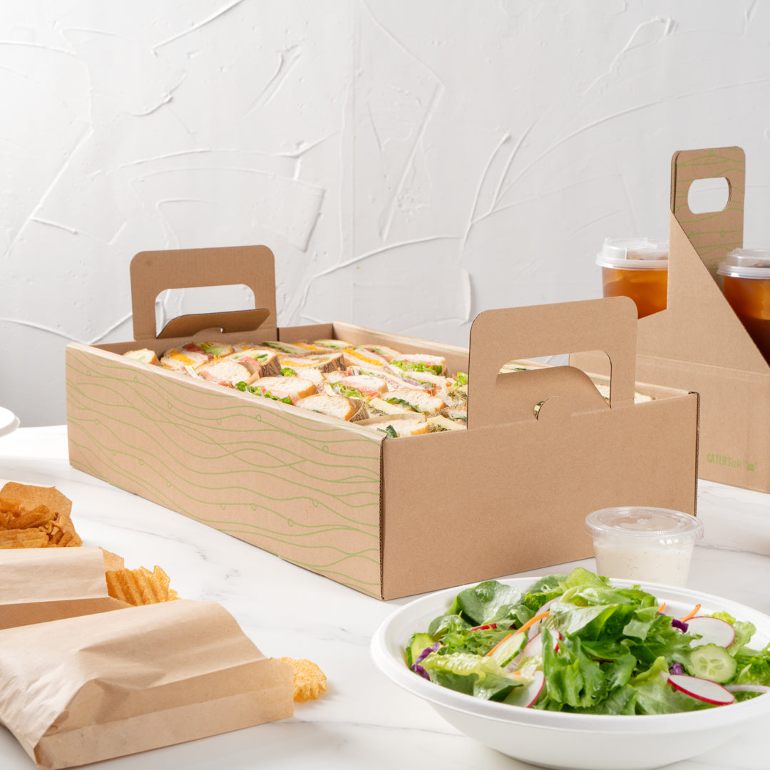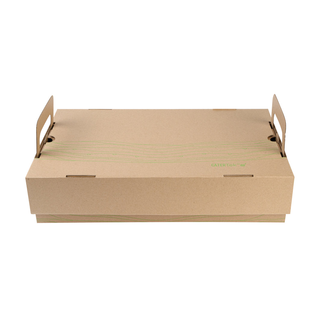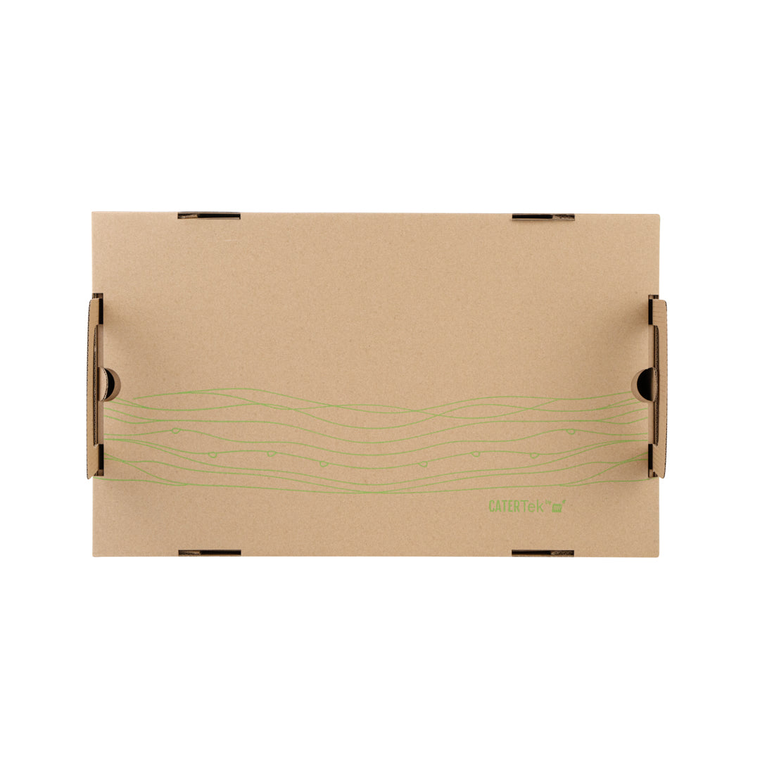 Effortlessly enhance your catering efficiency with secure transport solutions. The Cater Tek Kraft Paper Disposable Catering Tray's included cover slides over the tray to securely package to-go meals, minimizing spills and maintaining presentation quality. This disposable catering tray is constructed from sturdy kraft paper, providing a reliable base for your dishes while being fully recyclable. Built-in ergonomic handles ensure comfortable carrying, allowing staff to transport meals safely, enhancing the convenience of your catering operations. Additionally, the removable tray design aids in quickly arranging catering displays at events, streamlining your setup process and maximizing efficiency. With a generous length of 19.7 inches, this catering platter tray accommodates various meal sizes, ensuring adaptability for diverse menu offerings. Invest in this kraft paper serving tray and experience the benefits of efficient meal presentation and transport. Each order includes 10 Kraft Paper Disposable Catering Trays.