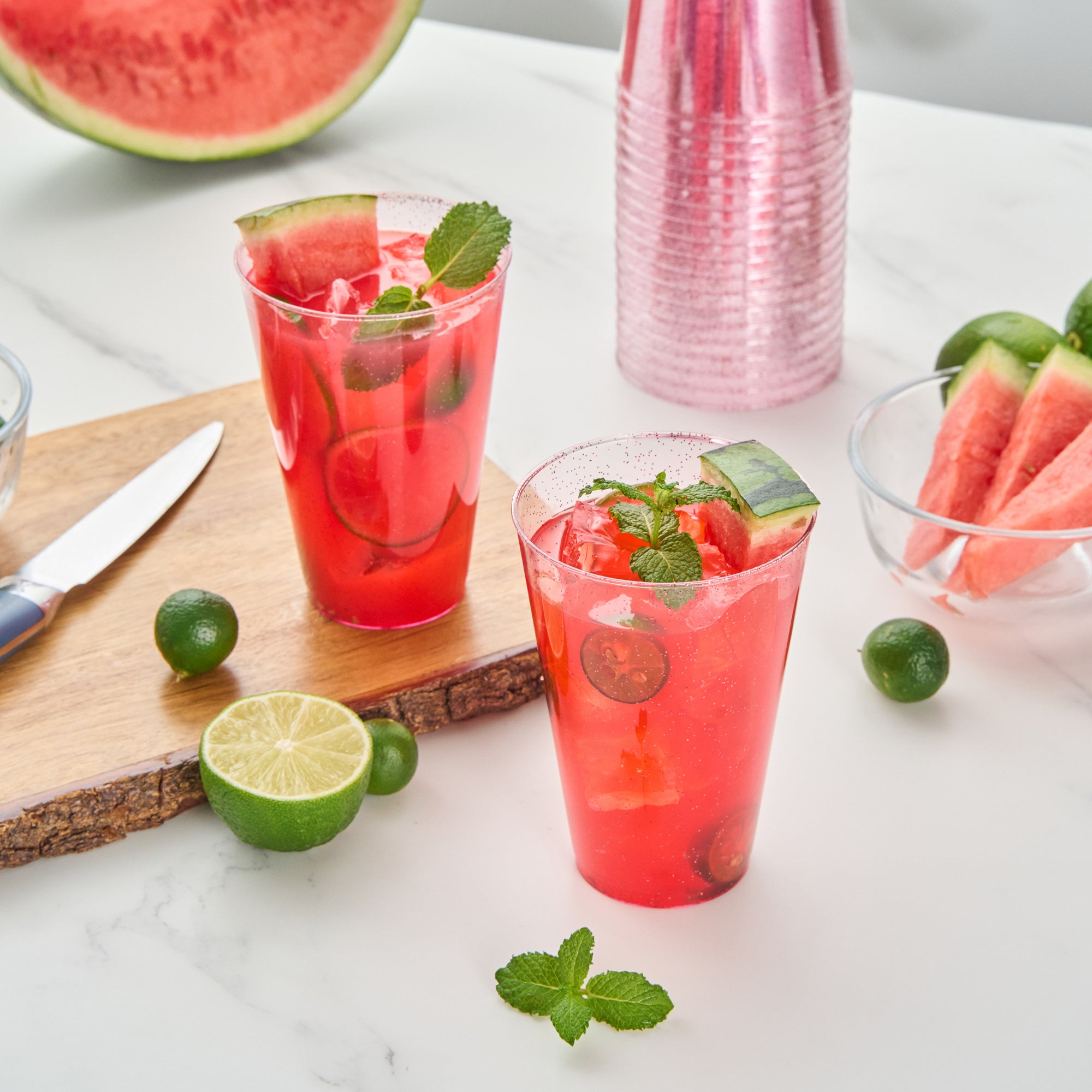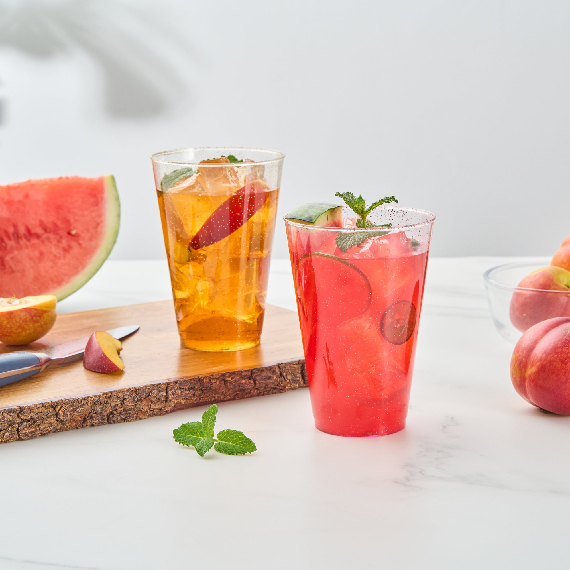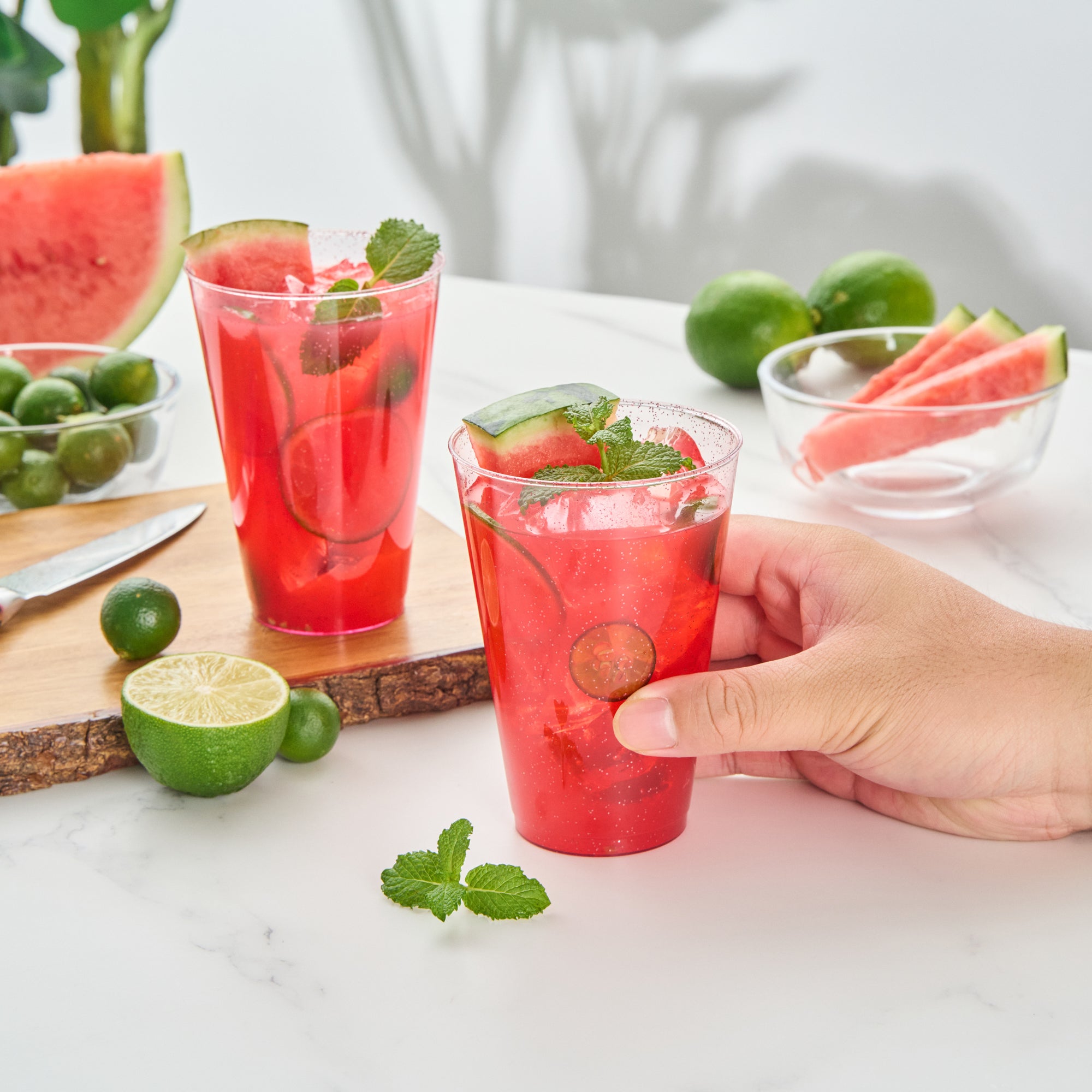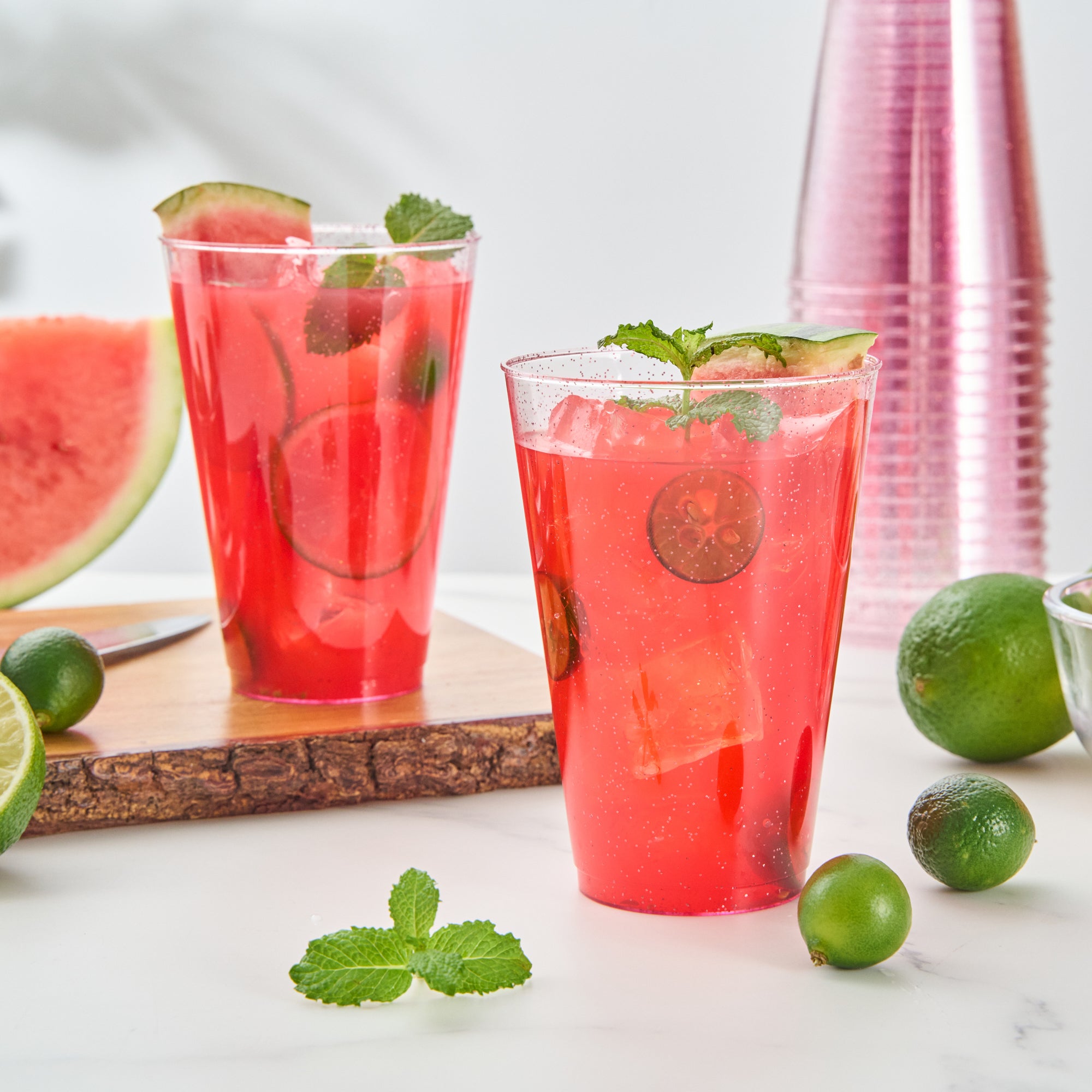 Add sparkle to your party ambiance with our Chef 101 14-ounce Pink Glitter Plastic Tumblers. These party cups feature a pink glitter design that elevates holiday party decor confidently. Made from durable PS plastic, these pink disposable cups are ideal for busy events, fitting neatly on crowded tables to serve cocktails or sodas stylishly. Designed to be disposable, these glitter finish cups are perfect for quick-cleanup at your busy venues. The cold food-friendly form of these cocktail cups ensures reliable performance during service. Plus, the recyclable nature of these attractive cups supports eco-conscious operations easily. Perfect for weddings, birthdays, or family reunions, these versatile disposable cocktail glasses add a refined touch to any occasion. Embrace an enchanting presentation with these 14-ounce glitter plastic cups that measure 3.3 inches in diameter and 4.8 inches in height. Sold in a 500 count box.