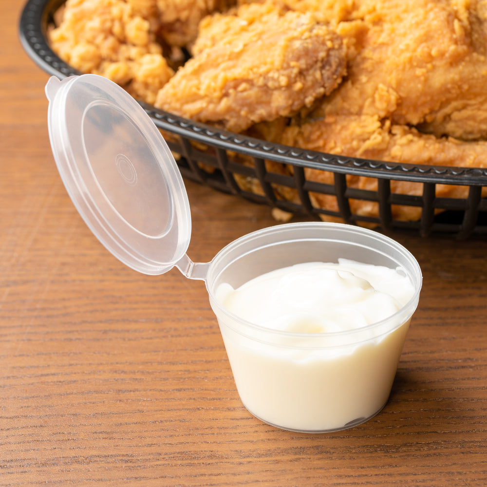 Ensure secure and convenient sauce transportation with our Chef 102 Portion Cup With Lid. This portion cup with lid features a hinged design that tightly seals to prevent spills during delivery, perfect for maintaining the integrity of sauces and dressings. Its microwavable design allows quick reheating of leftover condiments, enhancing kitchen efficiency in fast-paced environments. Made from durable plastic, this plastic dipping cup guarantees reliable use while being recyclable to lessen environmental impact, aligning with eco-conscious practices. The clear finish offers a sneak peek of the contents, making it an ideal clear sauce container for showcasing dips and toppings in quick-service restaurants. With dimensions of 2.87 inches in length, it is stackable to facilitate space-saving storage, crucial for busy kitchens handling takeout and delivery. Optimize your foodservice operations with these versatile portion cups. Each order includes 2000 Chef 102 Portion Cup With Lid.