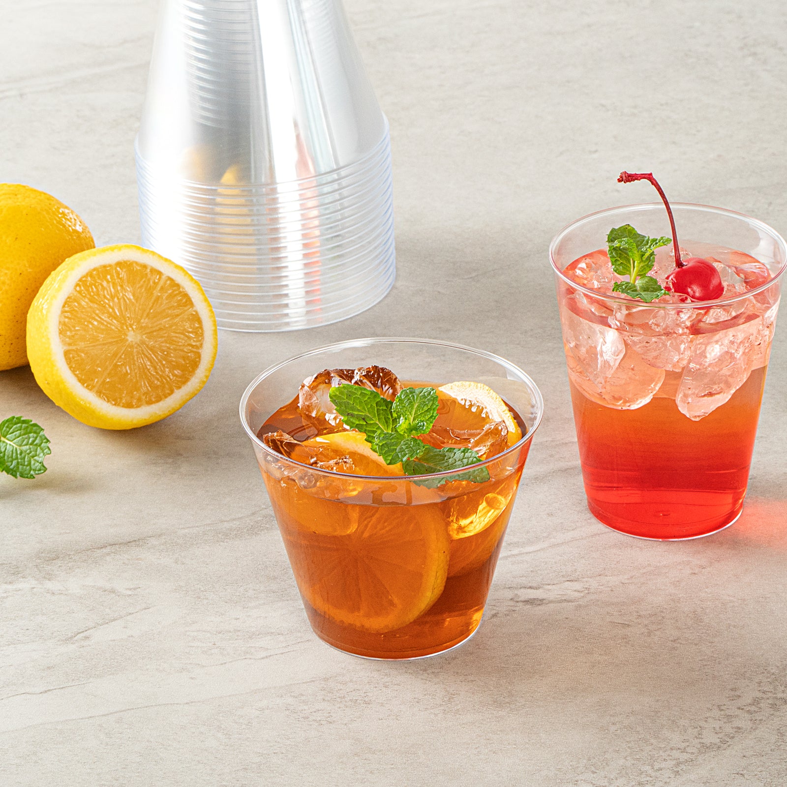 The durable PS plastic construction of these clear plastic disposable cups provides a sturdy drinking experience without any worry of breakage. Manufactured with rolled rims for additional strength.