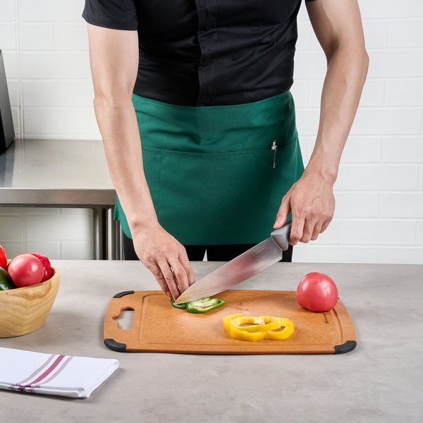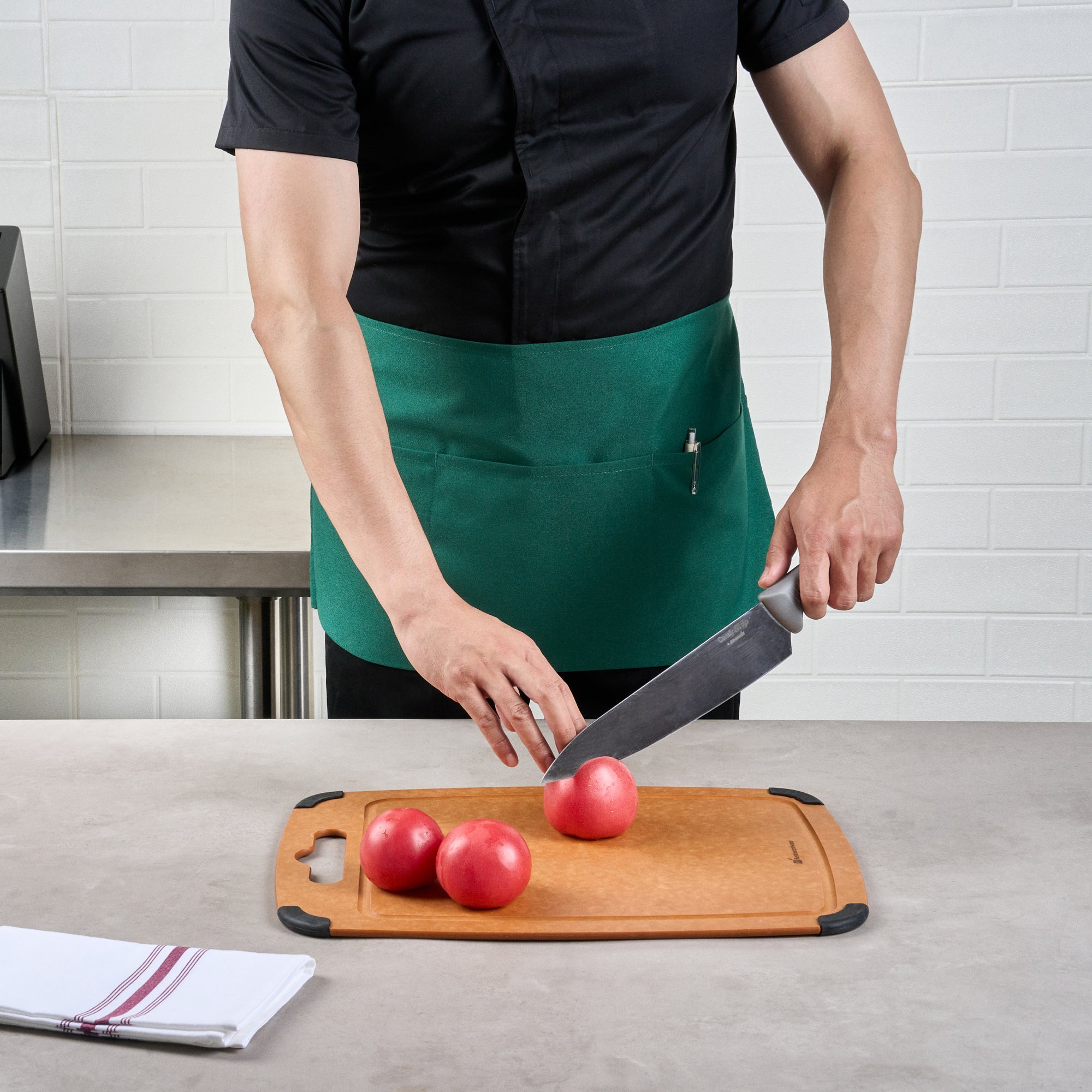 Enhance your staff's appearance and functionality with our Chef 101 Green Standard Waist Aprons. Designed with three spacious front patch pockets, this work apron is ideal for holding all service or kitchen supplies. The quick ties of this apron with pockets allow for effortless wear and removal, saving time in busy environments. Designed with a shortened length, this server apron ensures convenient coverage while providing greater freedom of movement. Made from a durable poly-cotton blend, this waist apron retains shape and resists wrinkles through multiple washings. The back ties of this bartender apron offer a customizable fit, keeping the apron securely in place with easy adjustments. Machine washable for hassle-free maintenance, this green apron stands up to frequent laundering while maintaining its color and shape. The vibrant green color of this waitress apron adds a fresh, fun look, making it perfect for front and back-of-the-house use. Measuring 24 inches in length by 12 inches in width, this waiter apron provides ample coverage without sacrificing comfort. Sold in a 1 count box.