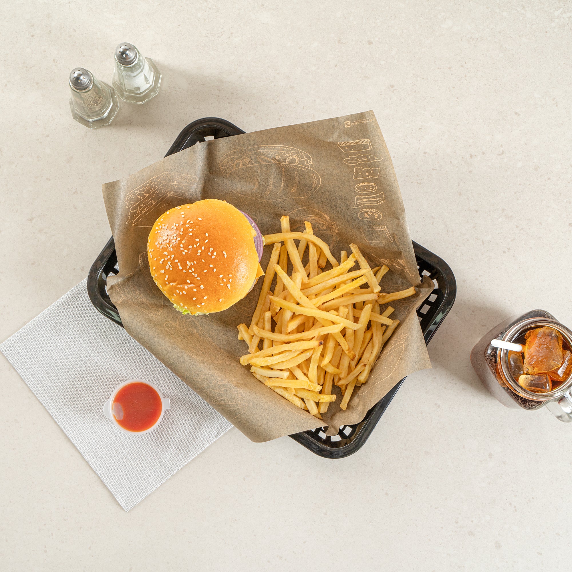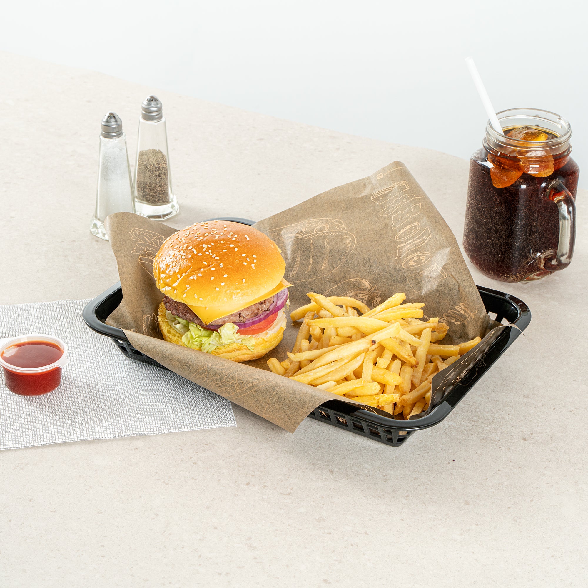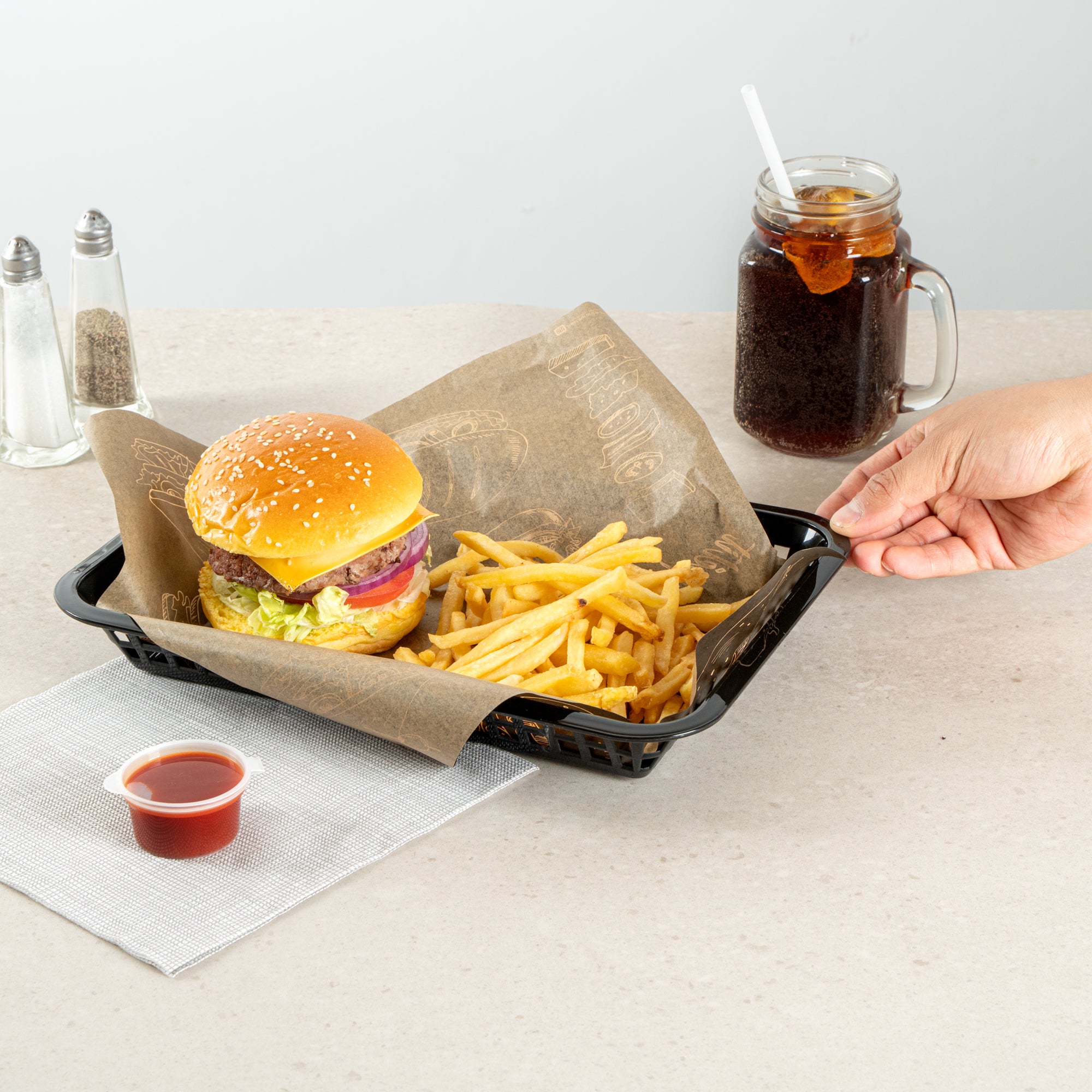 Elevate your dining experience with our Chef 101 Rectangle Black Plastic Fast Food Serving Baskets. Lightweight and easy to transport, these food baskets are apt for serving fried foods, wings, or appetizers, making them a must-have for any bustling eatery. With their ability to be used in the microwave, these snack trays allow for quick reheating, enhancing convenience. Effortless cleanup is ensured as these fry baskets are compatible with dishwashers, saving valuable time in busy kitchens. Their stackable design ensures space-saving storage and easy portability, keeping your service area organized with these versatile plastic serving baskets. Pair with deli papers (SKU: RWA1261, RWA1259, RWA1256) to elevate the look and efficiently catch crumbs or grease while enhancing these snack trays' style and functionality. Measuring 11.81 inches in length by 8.47 inches in width by 1.38 inches in height, these food baskets provide ample space for generous portions. Sold in a 100 count box.