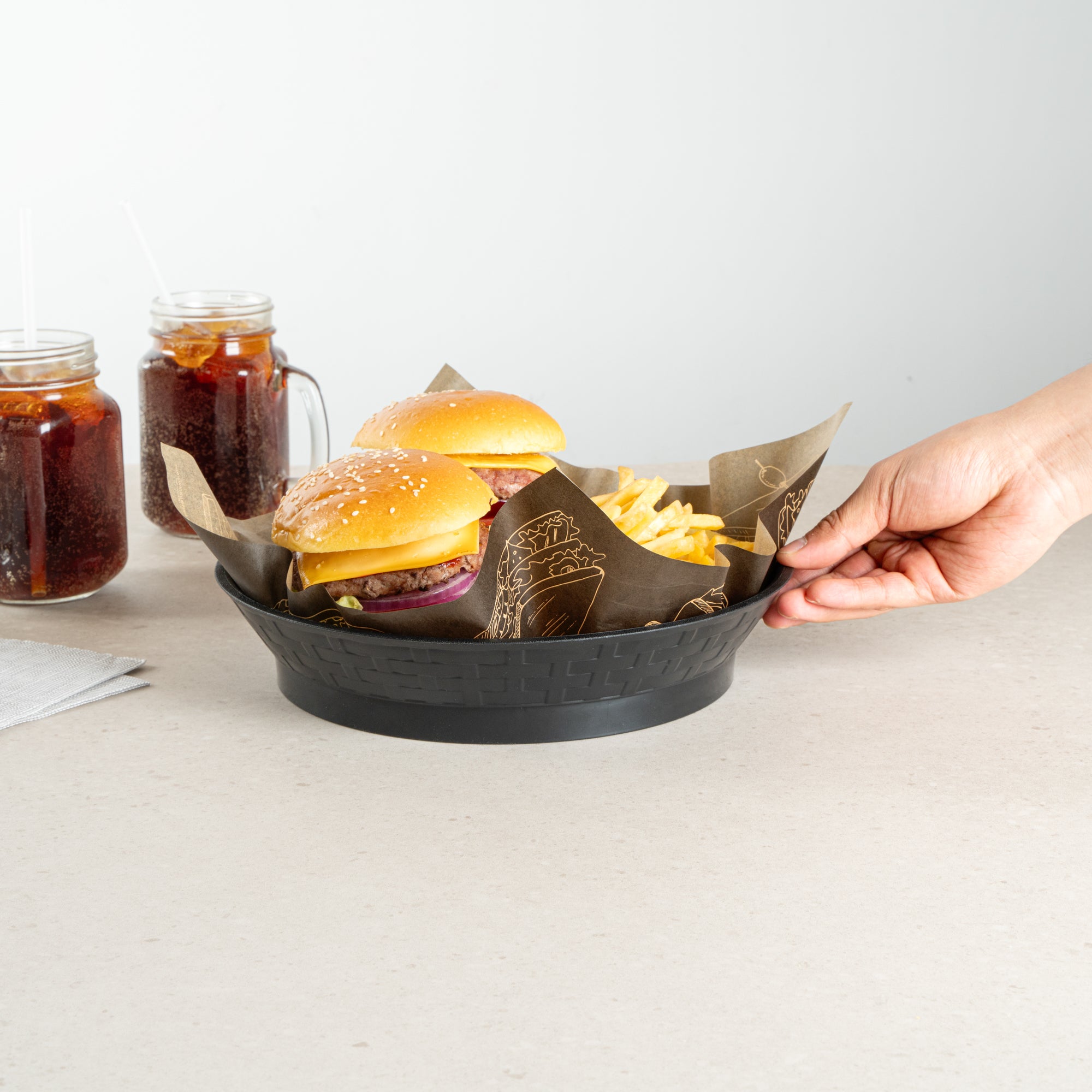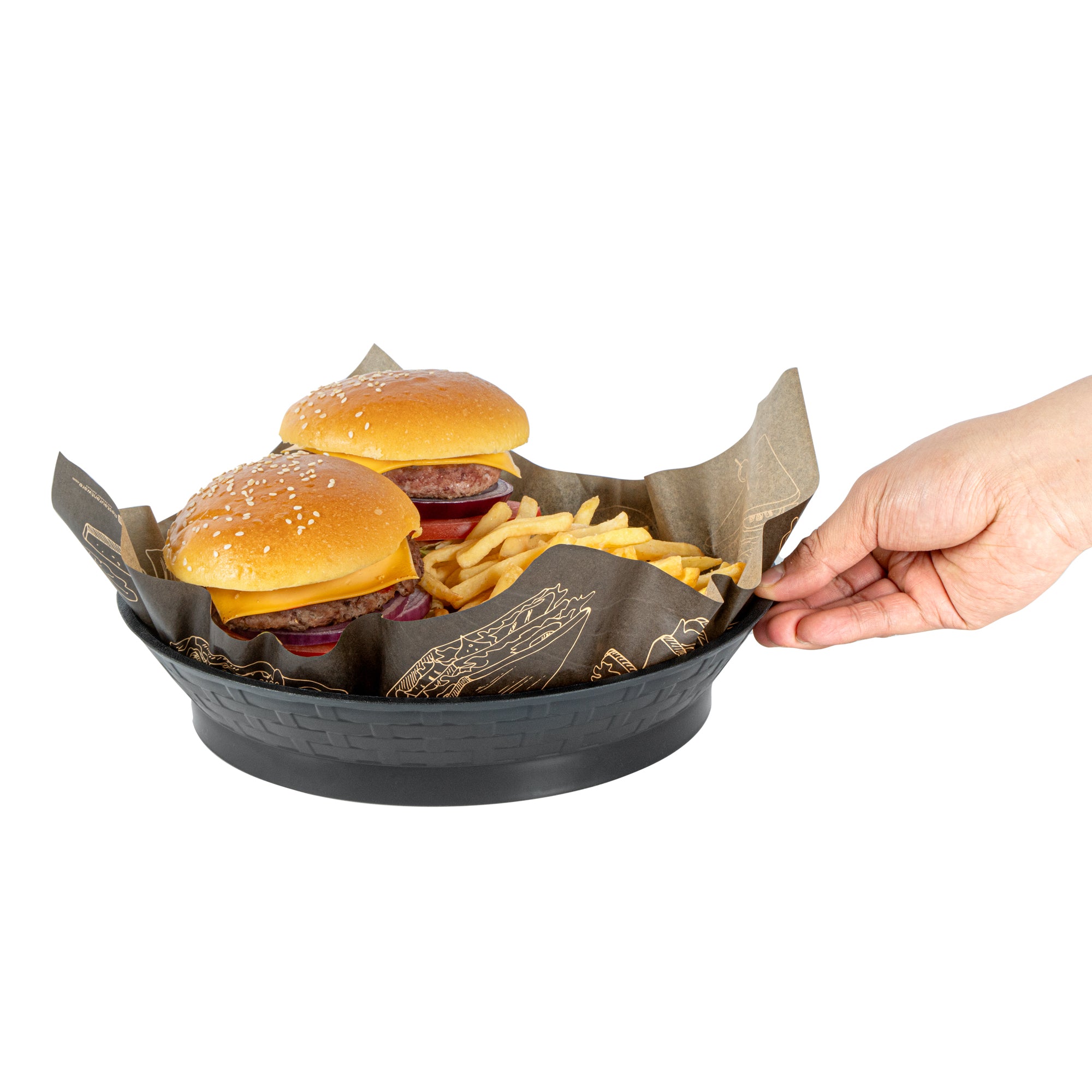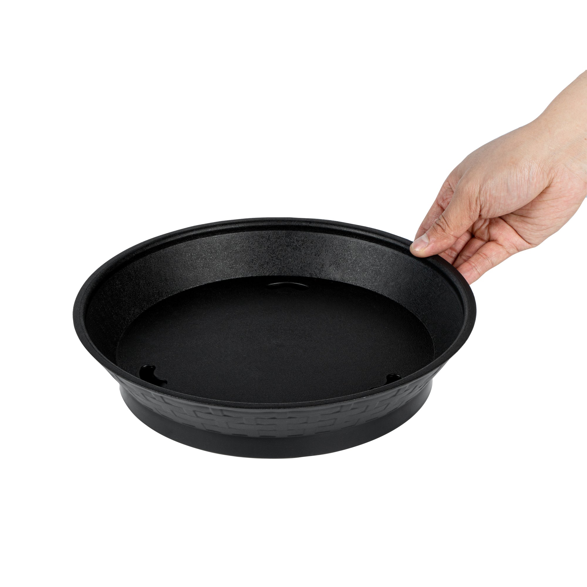 Serve your customers in style with our Chef 101 Round Black Plastic Diner Platters. Made from durable plastic, these lightweight serving trays are suitable for presenting fried foods, wings, sandwiches, or appetizers. These reusable platters feature a raised base that elevates food above the table for added visual appeal. Built-in drain holes aid in post-wash drying to avoid water pooling, ensuring your food platters are always ready for use. The microwave-secure construction of these diner platters allows for quick reheating of meals, making them highly convenient for busy kitchens. With a design that allows for easy cleaning in dishwashers, these serving trays ensure effortless cleanup. These stackable plastic platters offer space-saving storage and easy portability, enhancing your kitchen's efficiency. Measuring 10.47 inches in diameter by 2.17 inches in height, these food platters provide ample space for a variety of dishes. Sold in a 100 count box.