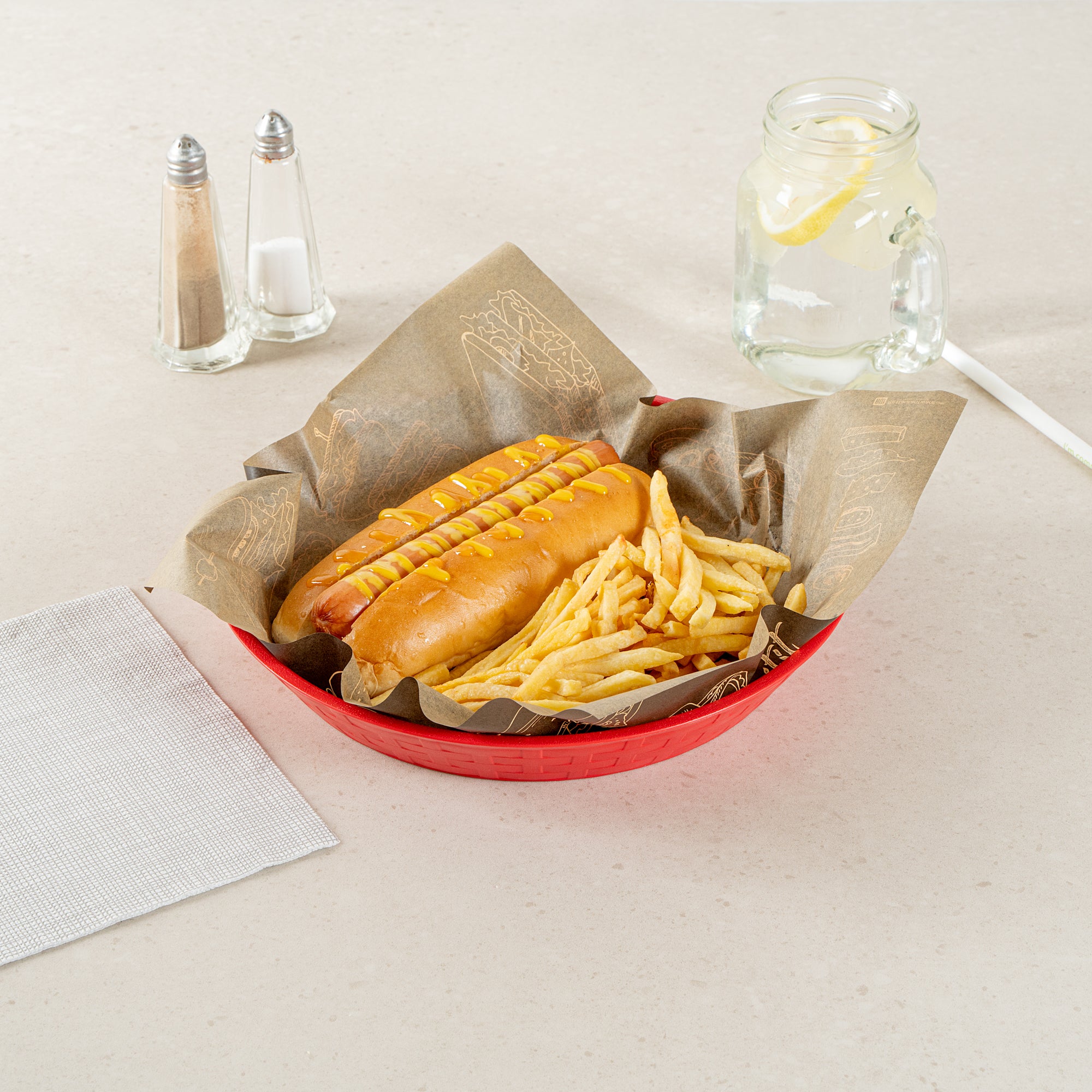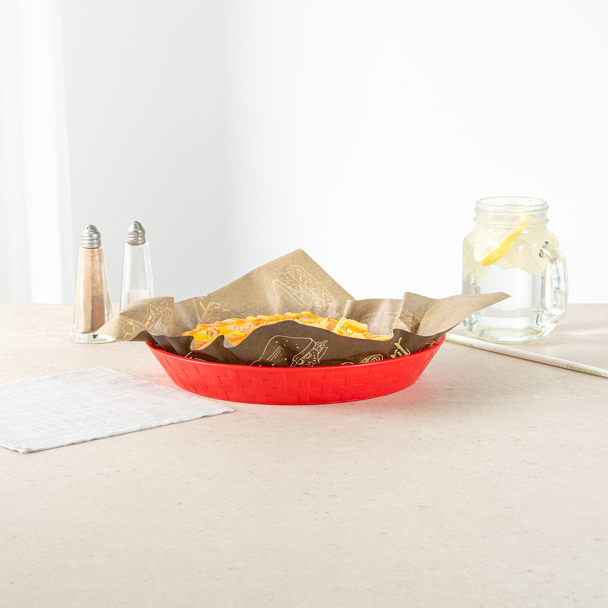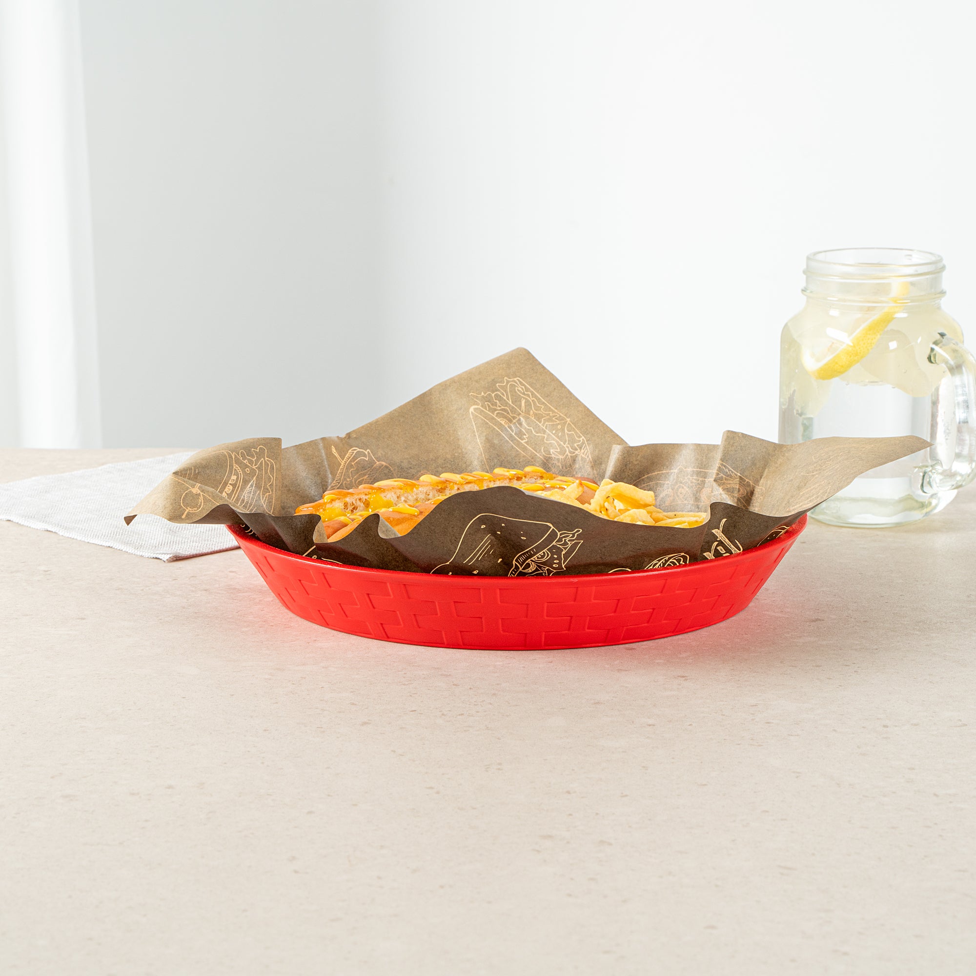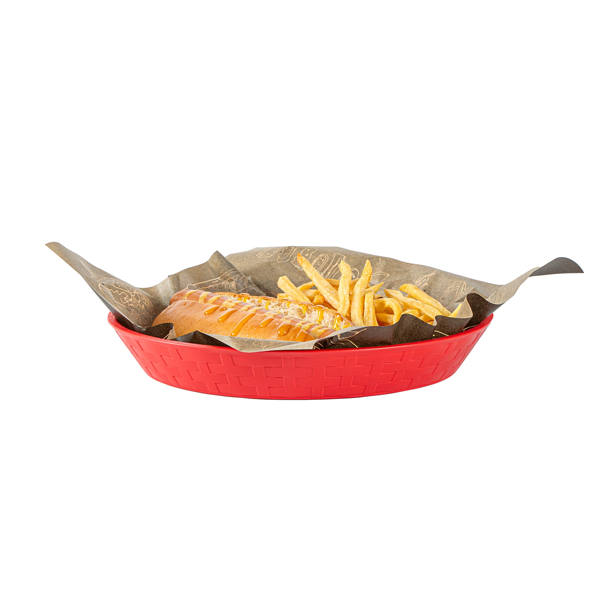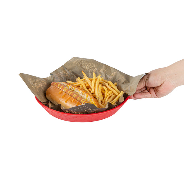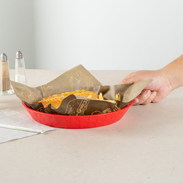 Our Chef 101 Round Red Plastic Diner Platters are the ultimate solution for stylish and practical food presentation. Made from durable plastic, these reusable platters are suitable for serving fried foods, wings, sandwiches, or appetizers. Built-in drain holes on these plastic platters aid in post-wash drying to avoid water pooling, maintaining cleanliness. With a design suitable for microwave use, these serving trays allow for quick reheating of meals, ensuring efficiency in busy kitchens. Their design for easy dishwasher cleaning ensures effortless and time-saving cleanup. Stackable and lightweight, these diner platters offer space-saving storage and easy portability, apt for any bustling diner or cafe. The bold red color of these food platters enhances food presentation, while the lattice sides add a classic, timeless look to any meal. Measuring 10.43 inches in diameter by 1.38 inches in height, these platters provide ample space for any culinary creation. Sold in a 100 count box.