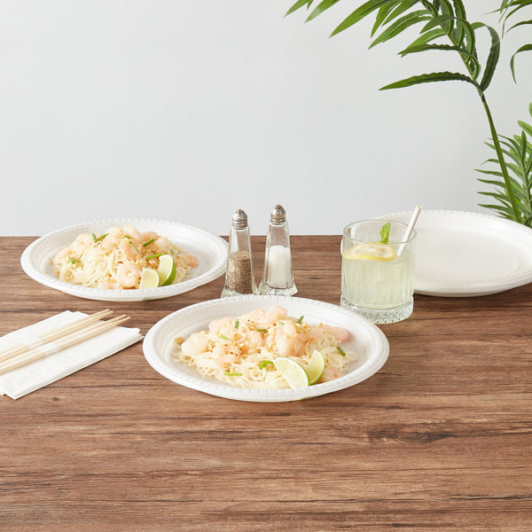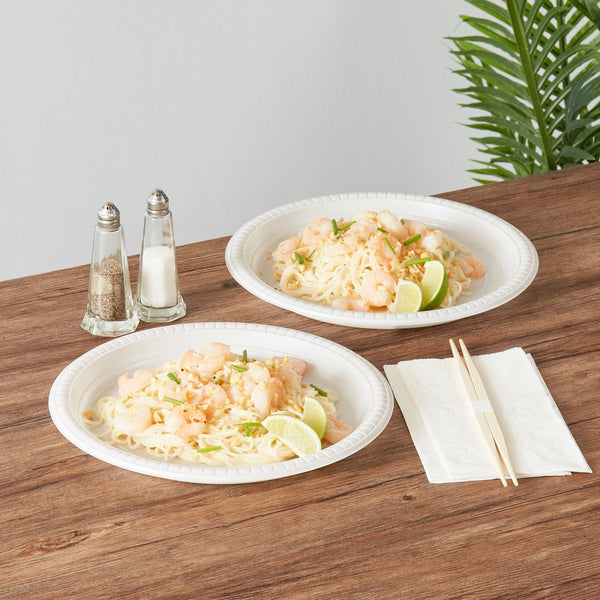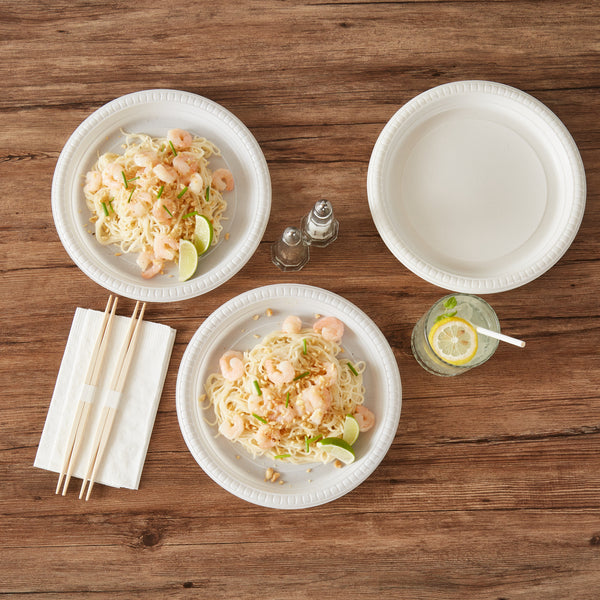 Serve your signature main course with our Chef 101 Round White Plastic Plates. To enjoy hot piping food, these plastic plates are microwave-safe and allow you to easily reheat your meals without hassle. Created from premium plastic, these serving plates are suitable for serving both hot and cold food items, making them ideal for various occasions. The elegant white finish of these dinner plates enhances your food presentation and makes them visually appealing. Perfect for any event, these disposable plates can be discarded after use provide an easy cleanup solution, saving you time and effort. These food plates are recyclable and offer an eco-friendly way to serve meals, perfect for foodservice establishments looking to reduce their carbon footprint. Measuring 10.25 inches in diameter, these white plates are ideal for a variety of dishes. Sold in a 100 count box.