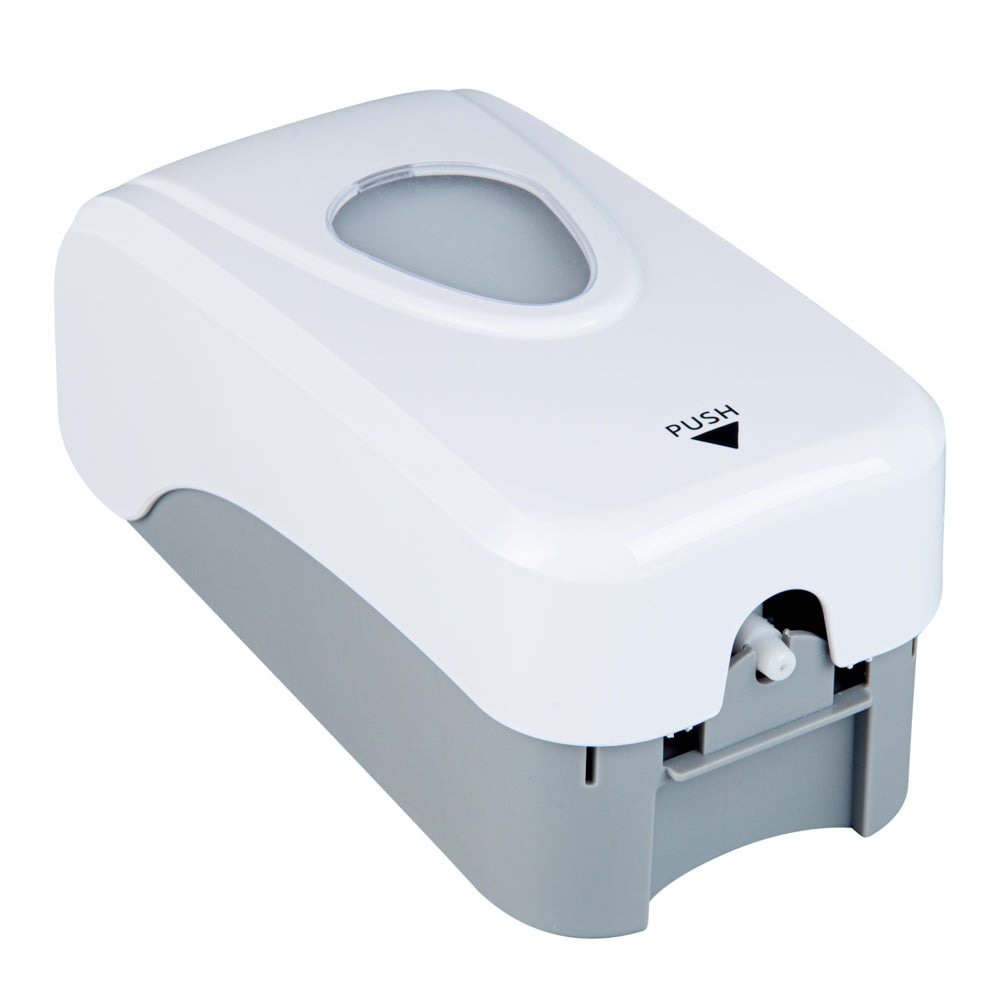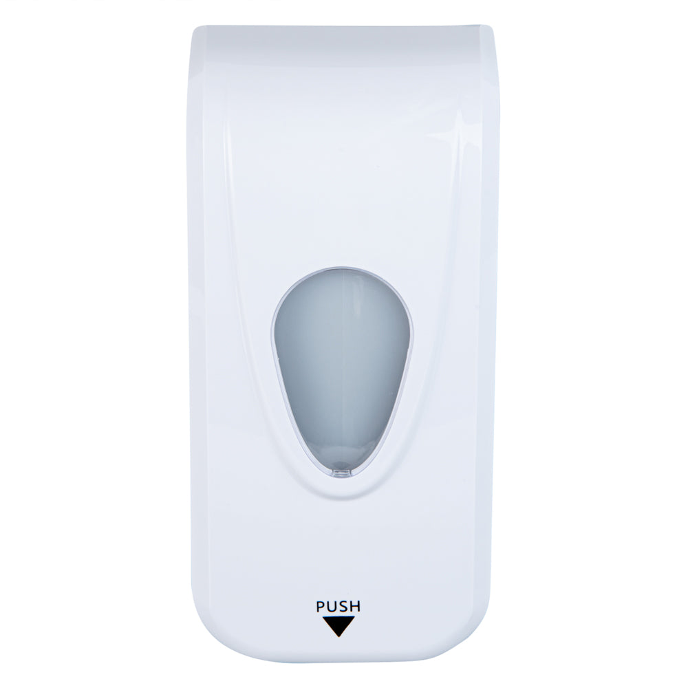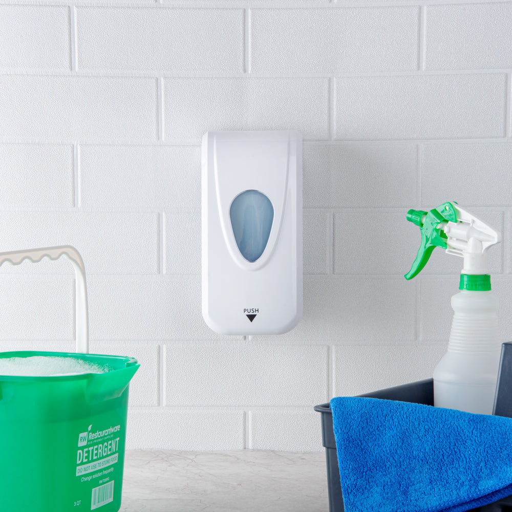 Use our Clean Tek Professional 33 oz White Manual Soap Dispenser to make soap easily accessible. Featuring a push button with an arrow, this manual soap dispenser allows your customers to quickly and easily understand how to operate the dispenser. This hand-press soap dispenser is made from ABS plastic, ensuring it endures everyday use in your kitchen or restroom. With a viewing window, this plastic soap tank allows you to quickly identify when the dispenser needs to be refilled. This 33-ounce dispenser can conveniently contain gel or liquid soap, allowing you to use the type of soap you prefer. With a chic white finish, this liquid soap dispenser complements the aesthetics of your kitchen, restroom, or hand washing station. With a wall-mountable design, this durable soap dispenser will be easy to locate and allows you to strategically place it wherever you want. This hand-press soap tank allows patrons and staff members to control the soap volume and stops dispensing soap when it's pushed to avoid waste. Measuring 9 inches long by 4.5 inches wide by 4.25 inches tall, this wall-mountable soap dispenser contains up to 33 ounces. Shipped in a 1 count box.