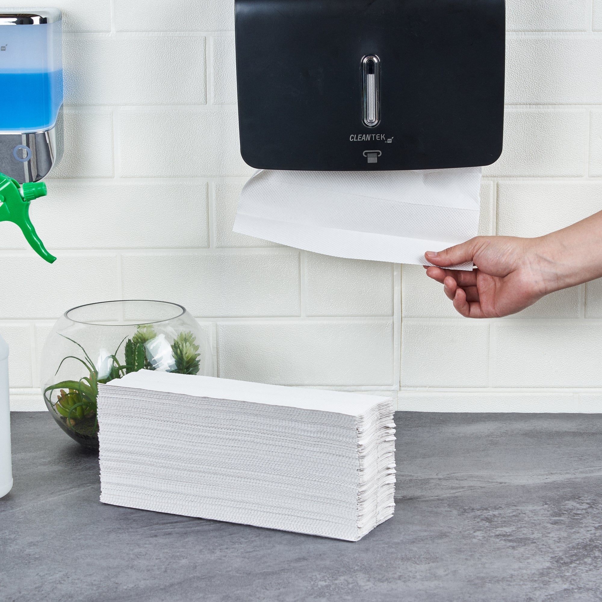 Wipe away huge liquid messes in a jiffy with our Clean Tek Professional White C-Fold Paper Towels. Made using virgin paper pulp, these paper towels are durable and will not tear easily when wiping spills. These 1-ply paper towels with an embossed texture ensure that no drop of water is left behind. The C-fold design of these bathroom paper towels reduces excess consumption since it only allows one napkin to be dispensed at a time. These C-fold paper towels, with their sleek fold, perfectly fit inside our C-fold / M-fold paper towel dispensers (SKU: RWT1189B & SKU: RWT1189W). To make post-event cleanups easier, these embossed paper towels are disposable. These paper napkins are not interlocked and can be used as individual tissues, allowing you to keep them on tables for outdoor events. Measuring 11.5 inches long by 9.5 inches wide when unfolded, and 3.25 inches wide when folded, these white paper towels allow easy placement into dispensers and save space while storing. Shipped in a 200 count box. Dispensers are available and sold separately.