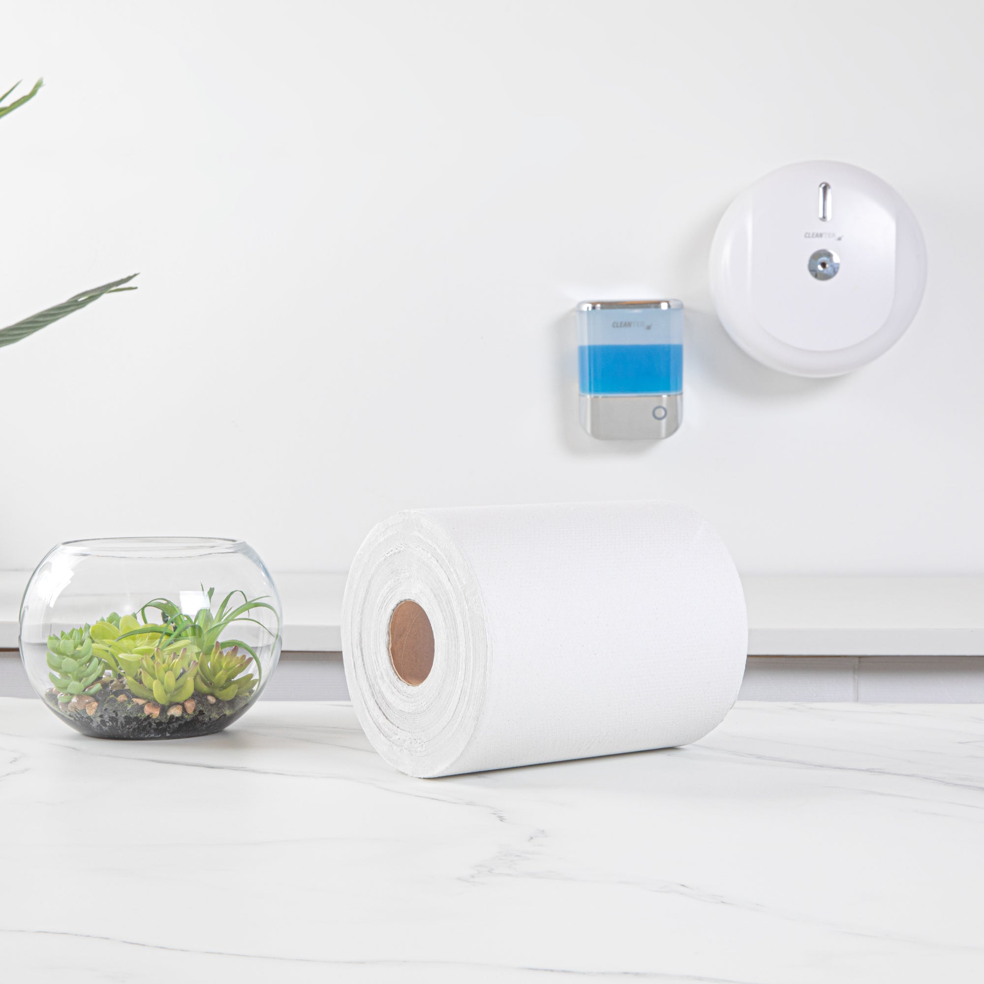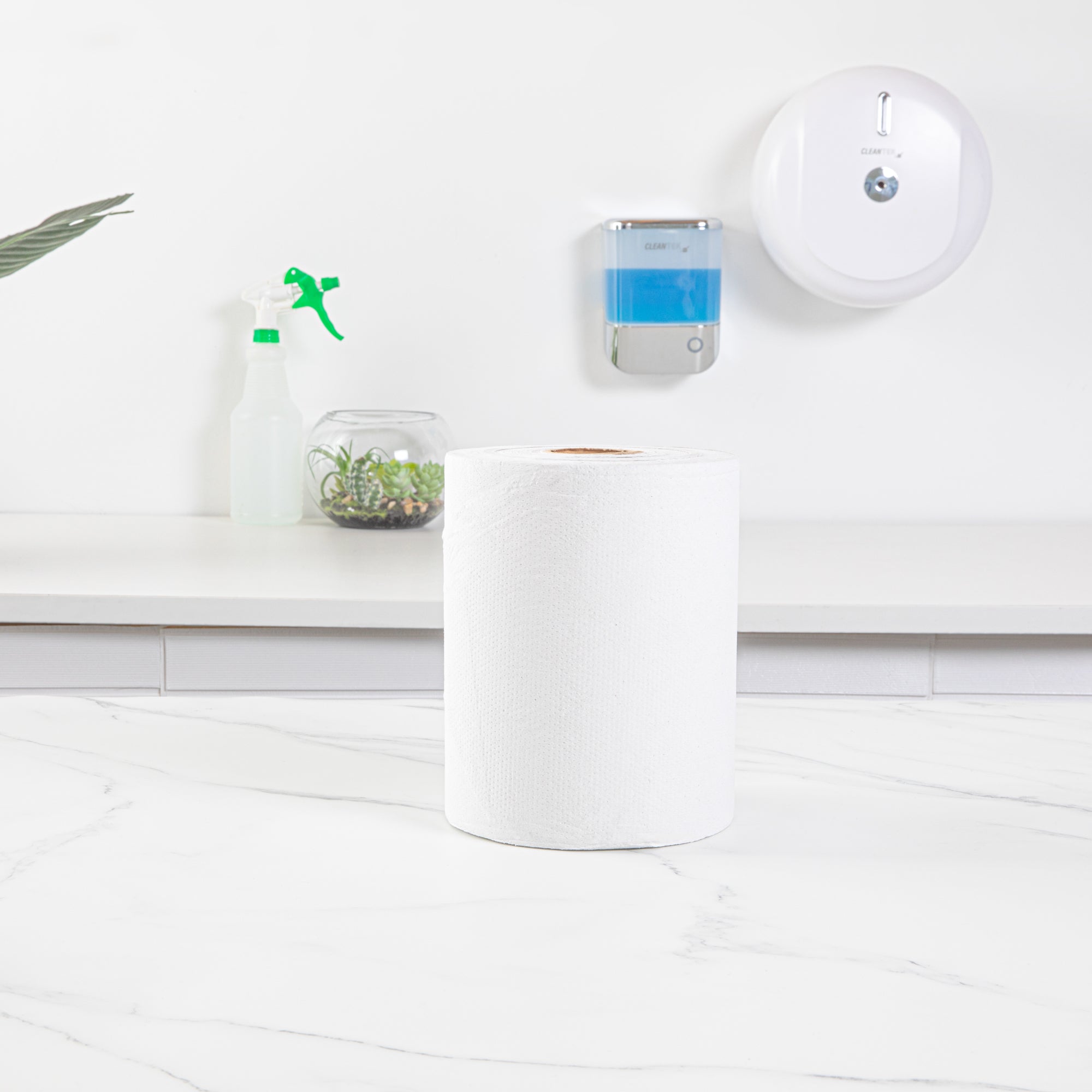 Efficiently wipe hands with our Clean Tek Professional White Paper Towel Roll. Manufactured from hardwound paper, this 1-ply kitchen paper towel is soft yet durable enough not to tear easily when wiping wet hands. The non-perforated design of this kitchen tissue roll allows your guests to tear off only the required amount of tissue instead of a predetermined length to avoid wastage. This hardwound paper towel has an embossed structure for added absorbency to easily wipe off messes and liquid spills. The 600-foot length of this disposable white paper towel is ample for busy places and high-volume businesses. This bathroom paper towel has a 2-inch diameter core, making it compatible with our automatic paper towel dispensers (SKU: RWT1187B & SKU: RWT1188W). Measuring 6.25 inches in diameter by 8 inches in width, this embossed paper towel is perfect to be used in kitchens, restrooms, and hand washing stations. Shipped in a 1 count box. Dispensers are available and sold separately.