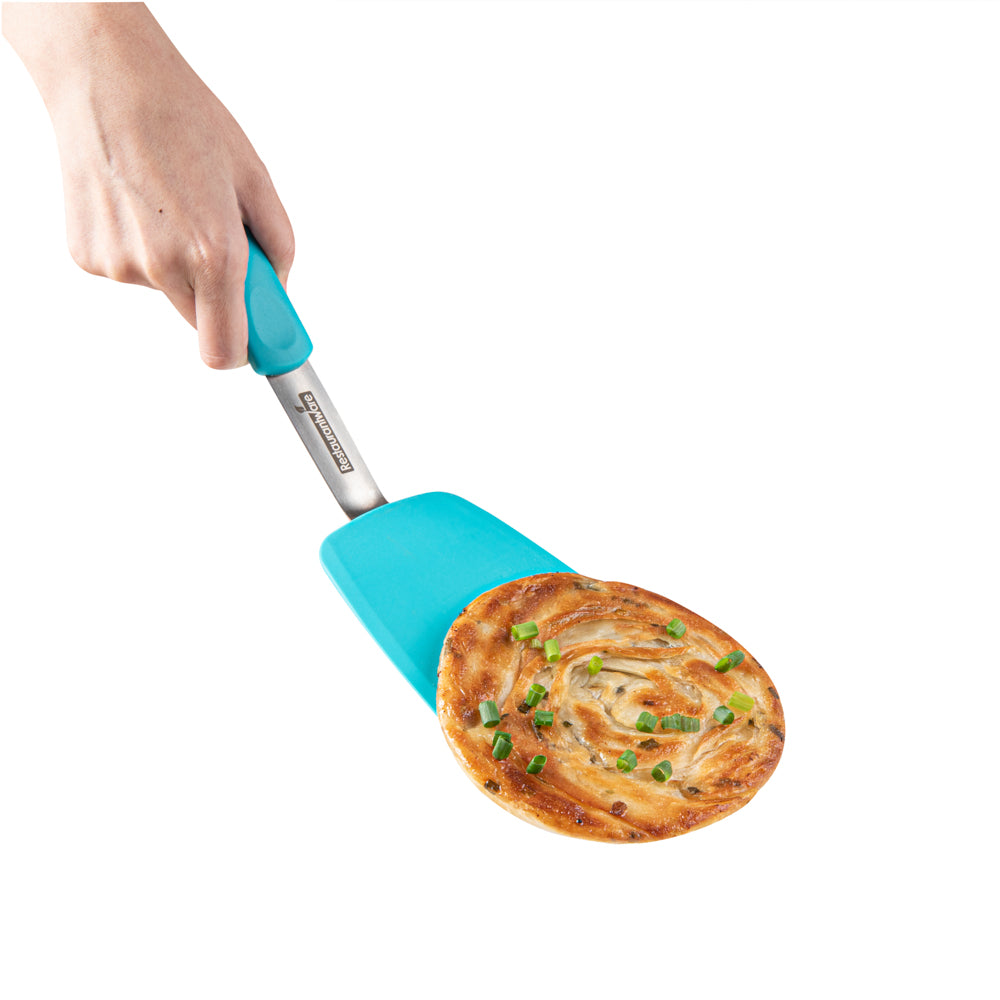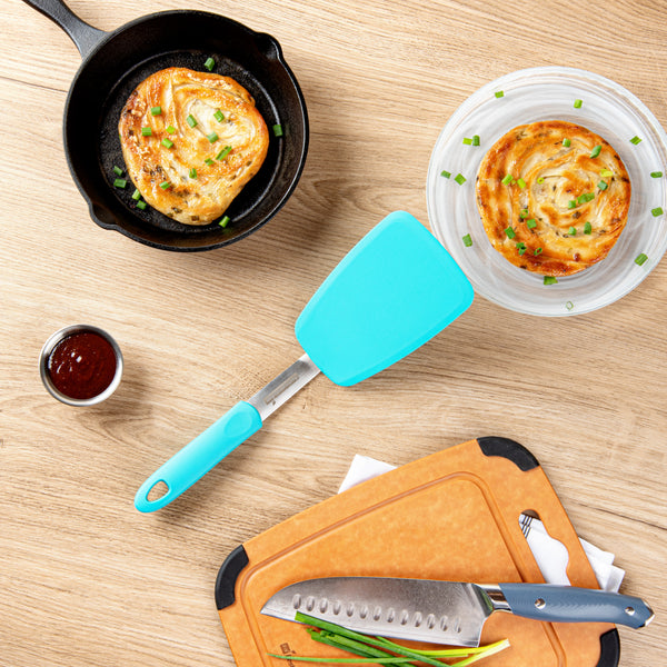 The rubber grip of the handle in these silicone solid turners allows you to maneuver them easily without having to strain yourself. Built-in hanging hole for easy storage and access.