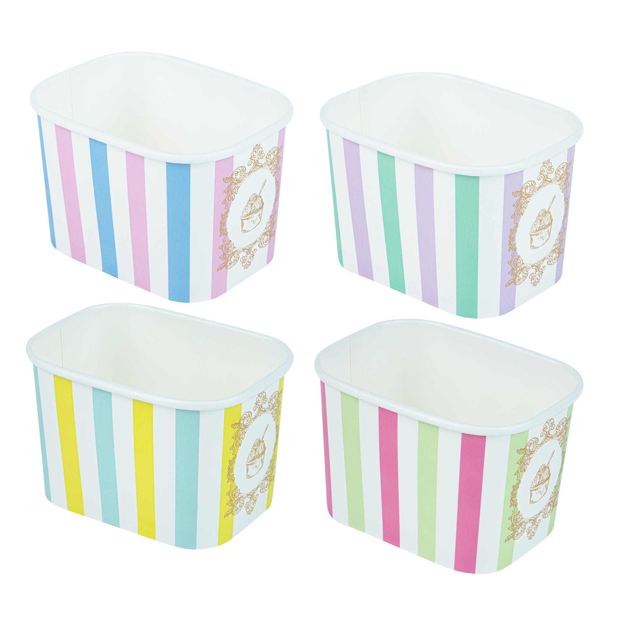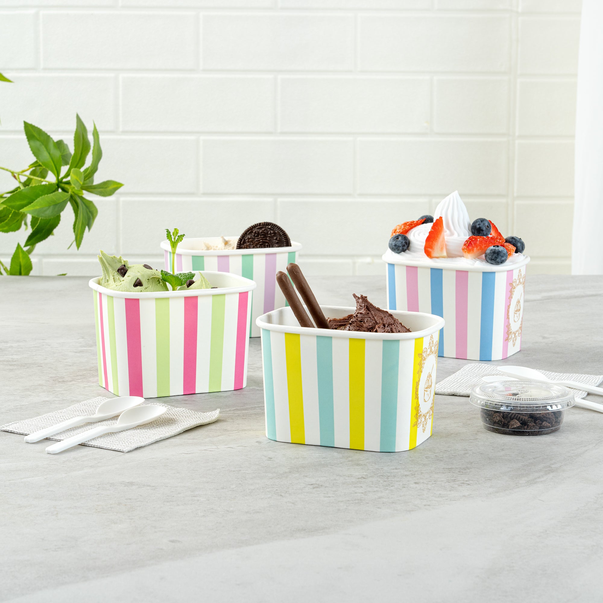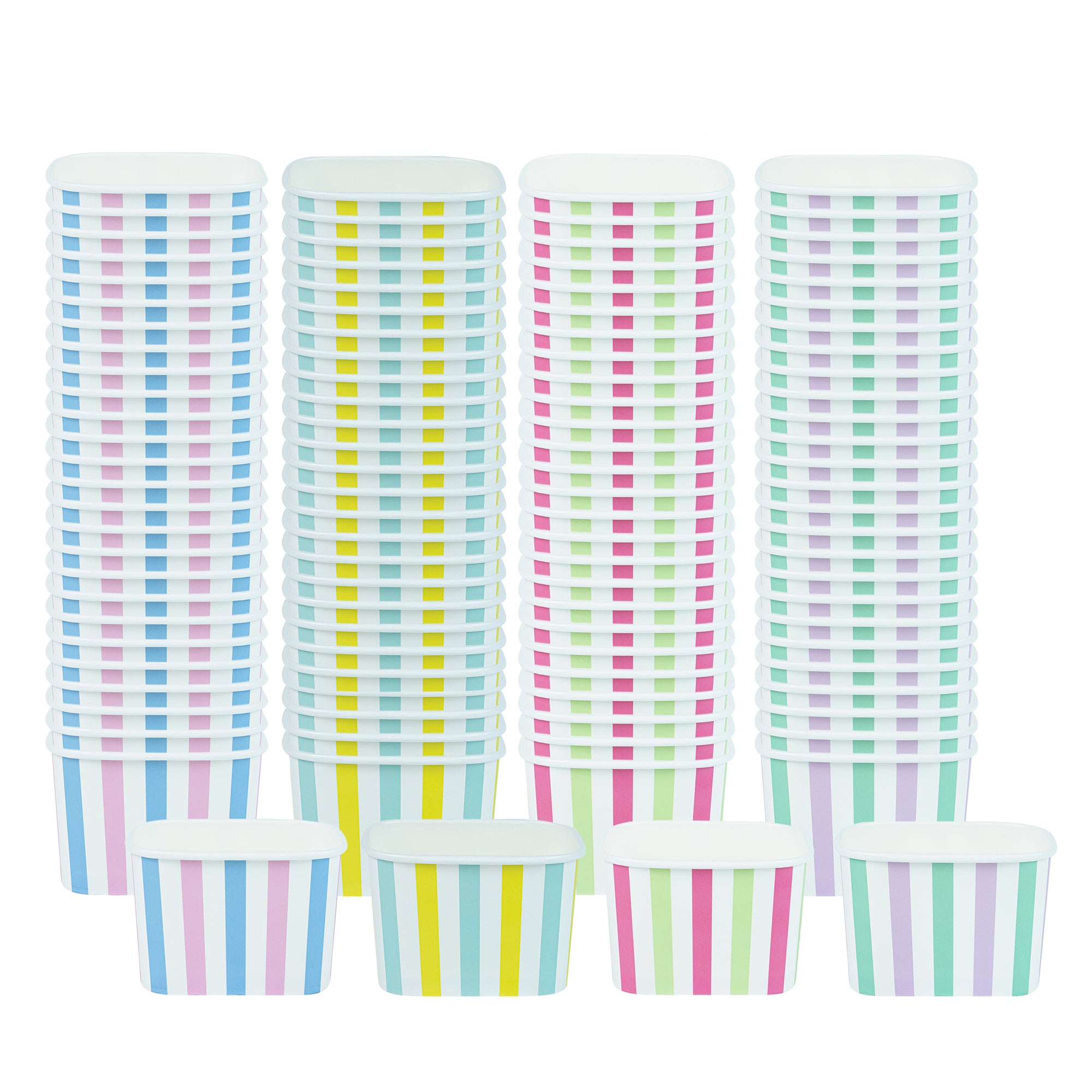 Enhance your dessert presentation with eye-catching designs. Coppetta Leak-Resistant 12 Oz Ice Cream Cup offers assorted stripe designs that elevate visual appeal, making your desserts irresistible to customers. With a 12-ounce capacity, these cups are perfect for serving generous portions of ice cream, frozen yogurt, or other delectable desserts. The square shape provides a modern and unique presentation, setting your offerings apart from those in standard round cups. Crafted from durable paper, these cups ensure sturdiness and reliability, preventing leaks or spills during service. The double-coated design is engineered to prevent liquid leakage, while the multi-purpose functionality allows you to serve both hot and cold dishes, such as soups and snacks. As a recyclable ice cream container, these cups offer an eco-friendly solution with grease-resistant properties for quick cleanup. Each order includes 200 Coppetta Leak-Resistant 12 Oz Ice Cream Cup.