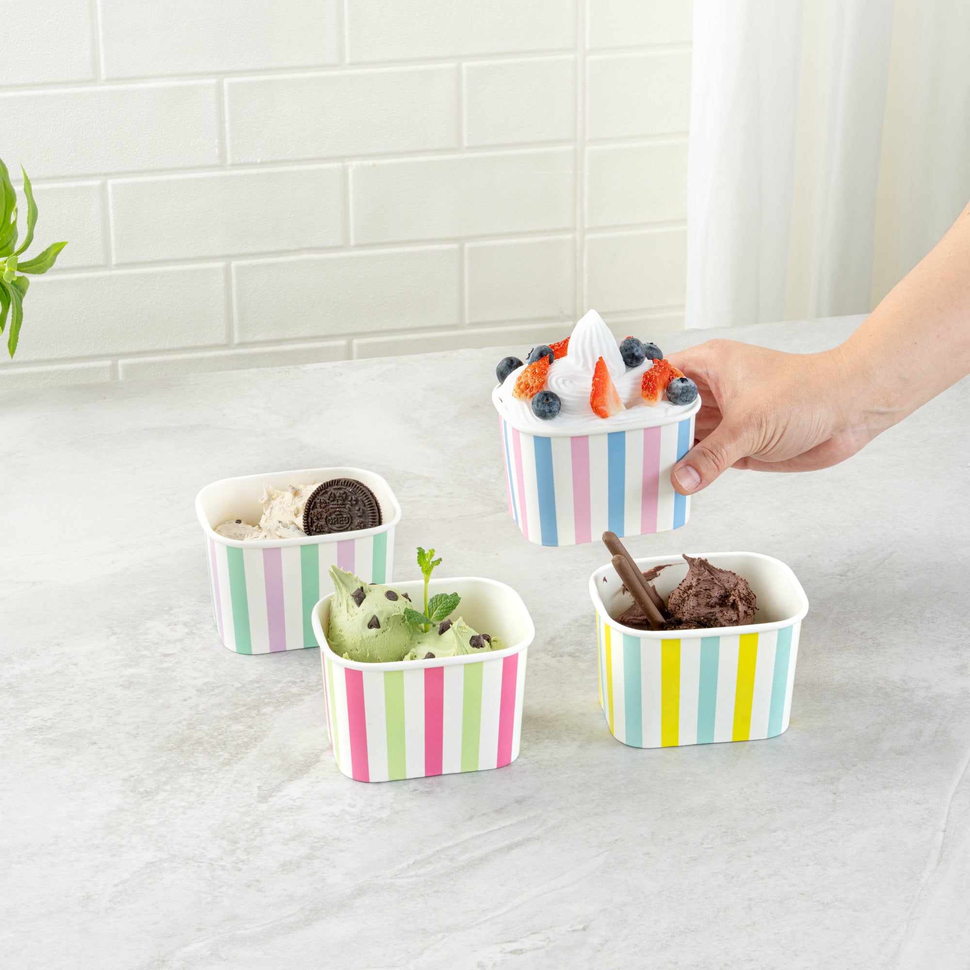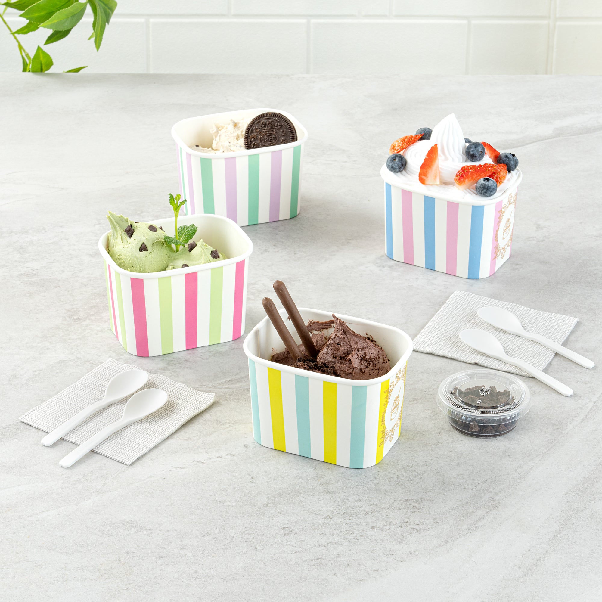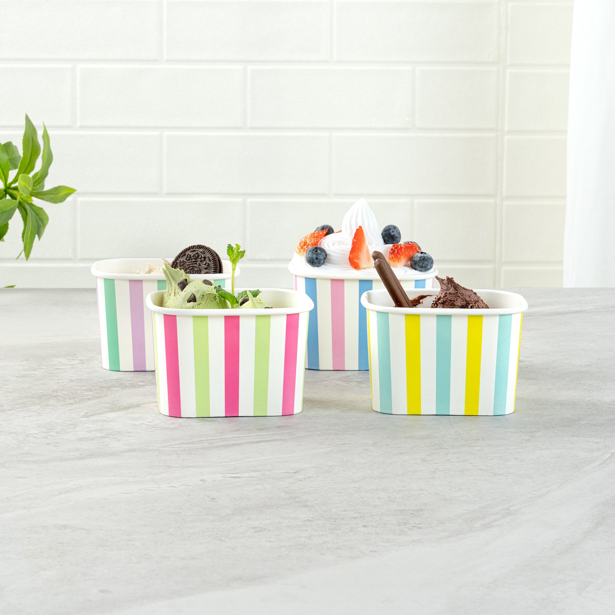 Enhance your dessert presentation with eye-catching designs. Coppetta Leak-Resistant 12 Oz Ice Cream Cup offers assorted stripe designs that elevate visual appeal, making your desserts irresistible to customers. With a 12-ounce capacity, these cups are perfect for serving generous portions of ice cream, frozen yogurt, or other delectable desserts. The square shape provides a modern and unique presentation, setting your offerings apart from those in standard round cups. Crafted from durable paper, these cups ensure sturdiness and reliability, preventing leaks or spills during service. The double-coated design is engineered to prevent liquid leakage, while the multi-purpose functionality allows you to serve both hot and cold dishes, such as soups and snacks. As a recyclable ice cream container, these cups offer an eco-friendly solution with grease-resistant properties for quick cleanup. Each order includes 200 Coppetta Leak-Resistant 12 Oz Ice Cream Cup.