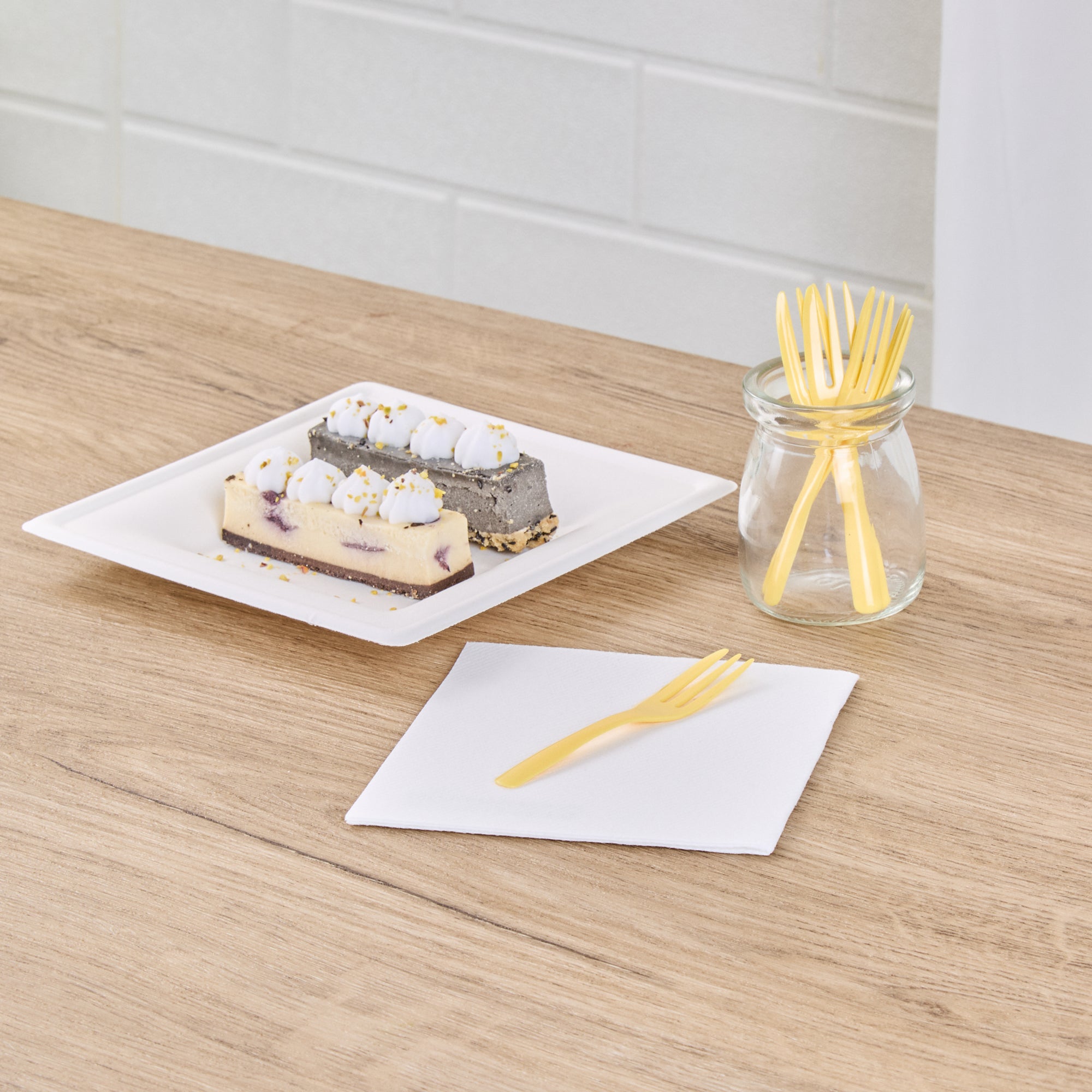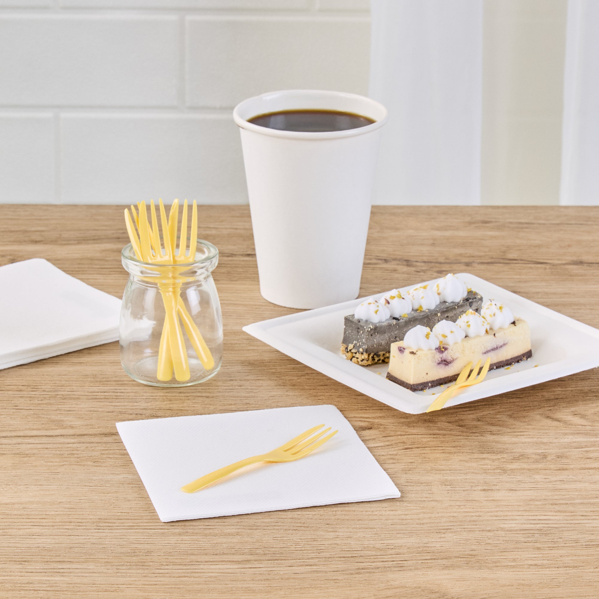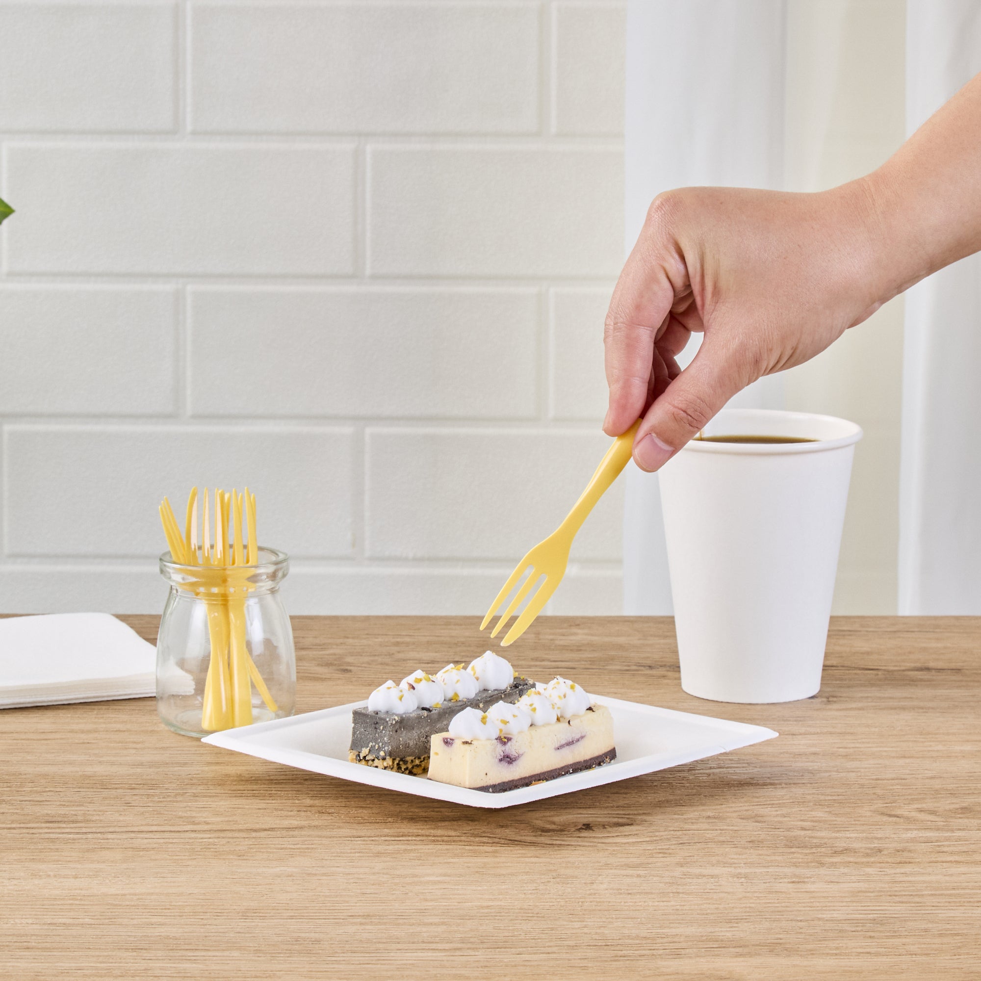 Experience the ultimate convenience and precision with our Coppetta Baby Yellow Plastic Cake Forks with Knife Edge. Made from strong and sturdy plastic, these tasting forks are built to withstand the weight of your delectable treats. These dessert forks combine the functionality of a knife and fork in one innovative utensil. The wide knife-edged tine of these cake forks effortlessly glides through buttery pies and fondants, ensuring each bite is perfectly sliced. These fruit forks are disposable, allowing you to discard them after use. With a bright yellow finish, these plastic forks add vibrance to your table setting. These disposable forks measure 4 inches in length by 0.75 inches in width. Sold in a 500 count box.