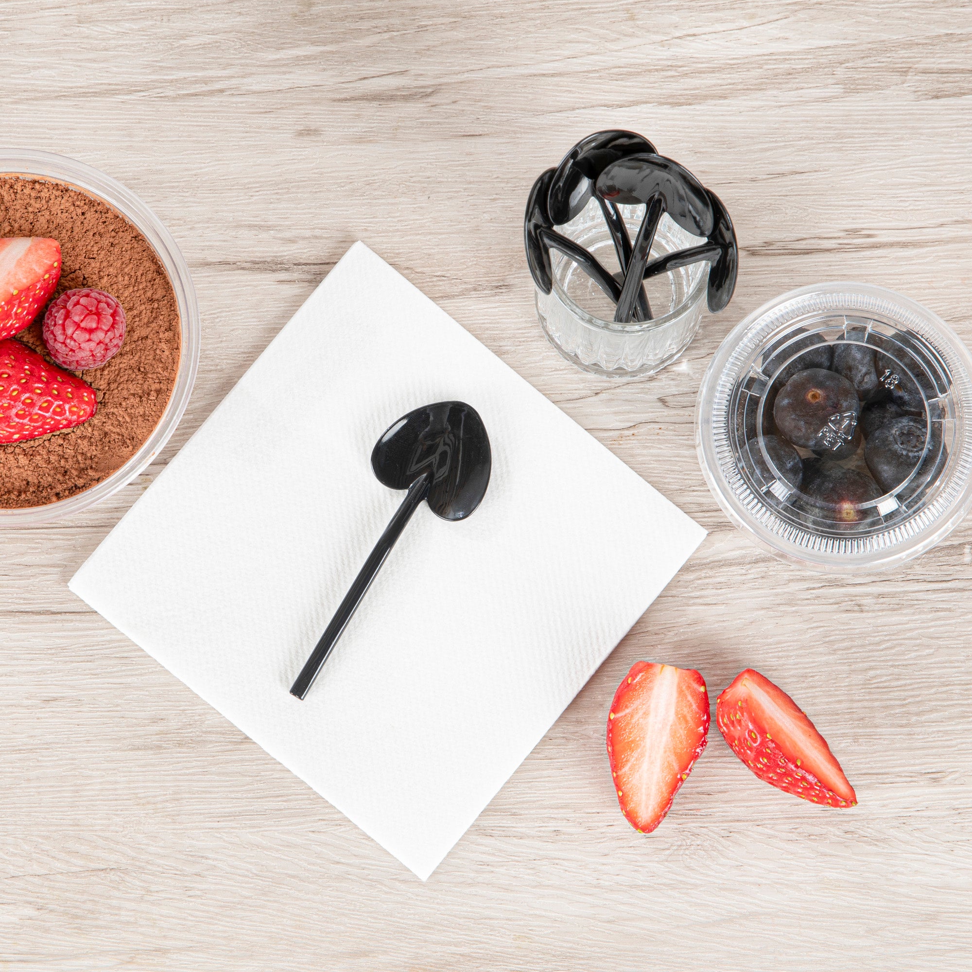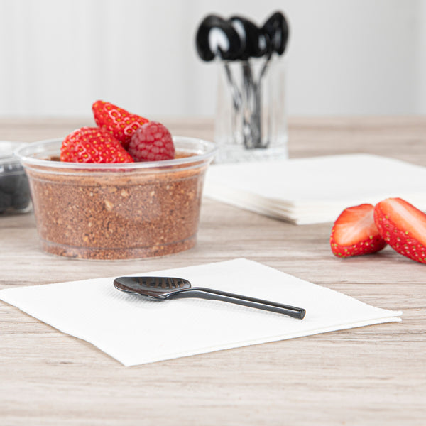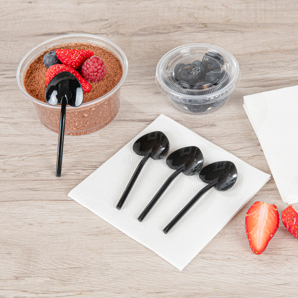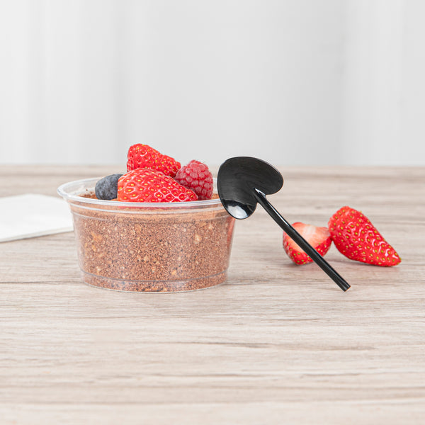 Elevate your fro-yo experience with our Coppetta Black Plastic Love Shovel Spoons. These charming dessert spoons are shaped like tiny hearts for a delightfully charming way to enjoy any frozen or creamy dessert. Ideal for serving samples, these disposable spoons are perfect for Valentine's Day, wedding receptions, or romantic banquets. Constructed from recyclable plastics, these shovel spoons help reduce your carbon footprint. The long and sturdy handle of these mini-tasting spoons makes them convenient to hold and scoop desserts or appetizers from deep bowls. These small ice cream spoons come in a stylish black finish and measure 3.5 inches in length by 1.25 inches in width. Sold in a 500 count box.