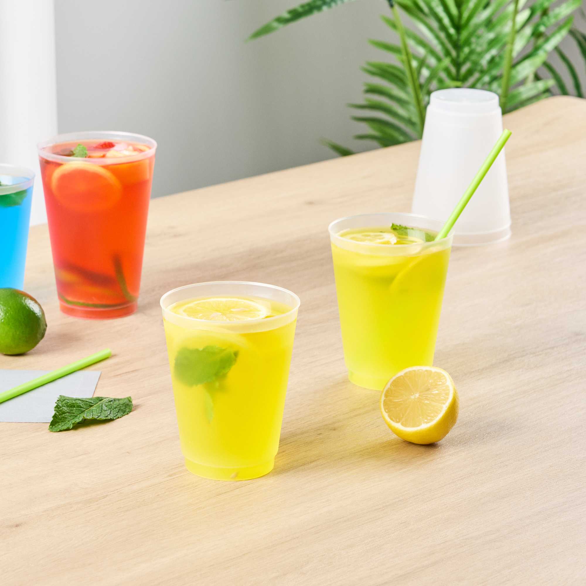 Pour slushed sodas and yummy smoothies into our Flexi Grip 16-ounce Round Frosted Plastic Cups. These plastic cups have a beautifully frosted finish that provides a non-slip grip on beverages. Crafted from premium plastic, these recyclable cups are crack-resistant. The flexible design of these plastic cups creates a comfortable hold while sipping. These disposable drinking cups can be used with hot or cold drinks for endless beverage possibilities. Ideal for restaurants, cafes, or catering events, these eco-friendly plastic cups can be recycled or reused. For a conveniently quick clean up, these disposable drinking cups are also dishwasher-safe. Great for saving space in your kitchen, these plastic cups are easily stackable. Measuring 3.5 inches in diameter and 4.5 inches in height, these recyclable cups hold up to 16 ounces. Shipped in a 500 count box.