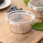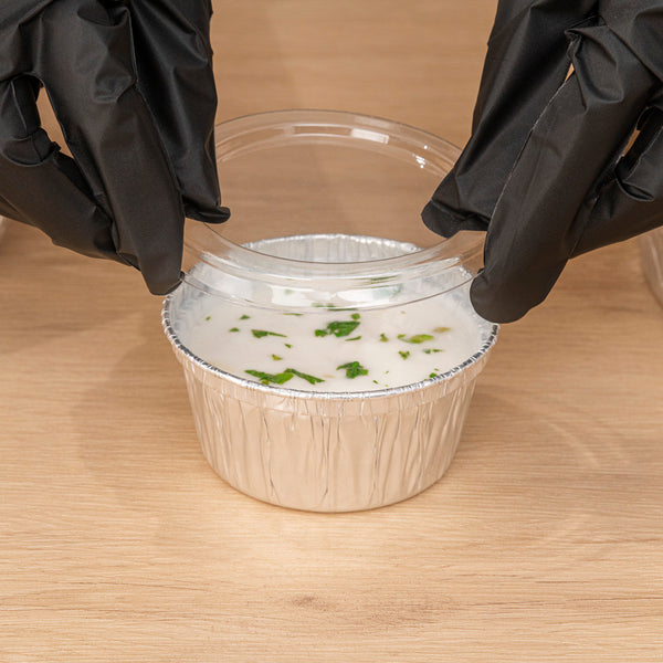Pack up your sauces or baked goods with our Foil Lux Round Clear Plastic Flat Lids. Pair these flat lids with their coordinating 4-ounce aluminum ramekins to seal in orders for take out and delivery services. These plastic lids provide a tight-fitting seal to avoid messy leaks while transporting sauces. Made from PET plastic, these disposable lids are crack-resistant to keep condiments secure. For a simple and easy clean, these portion cup lids are conveniently recyclable. These disposable lids measure 3.6 inches in diameter. Sold in a 100 count box. Ramekins (SKU: RWM0139S) are available and sold separately.