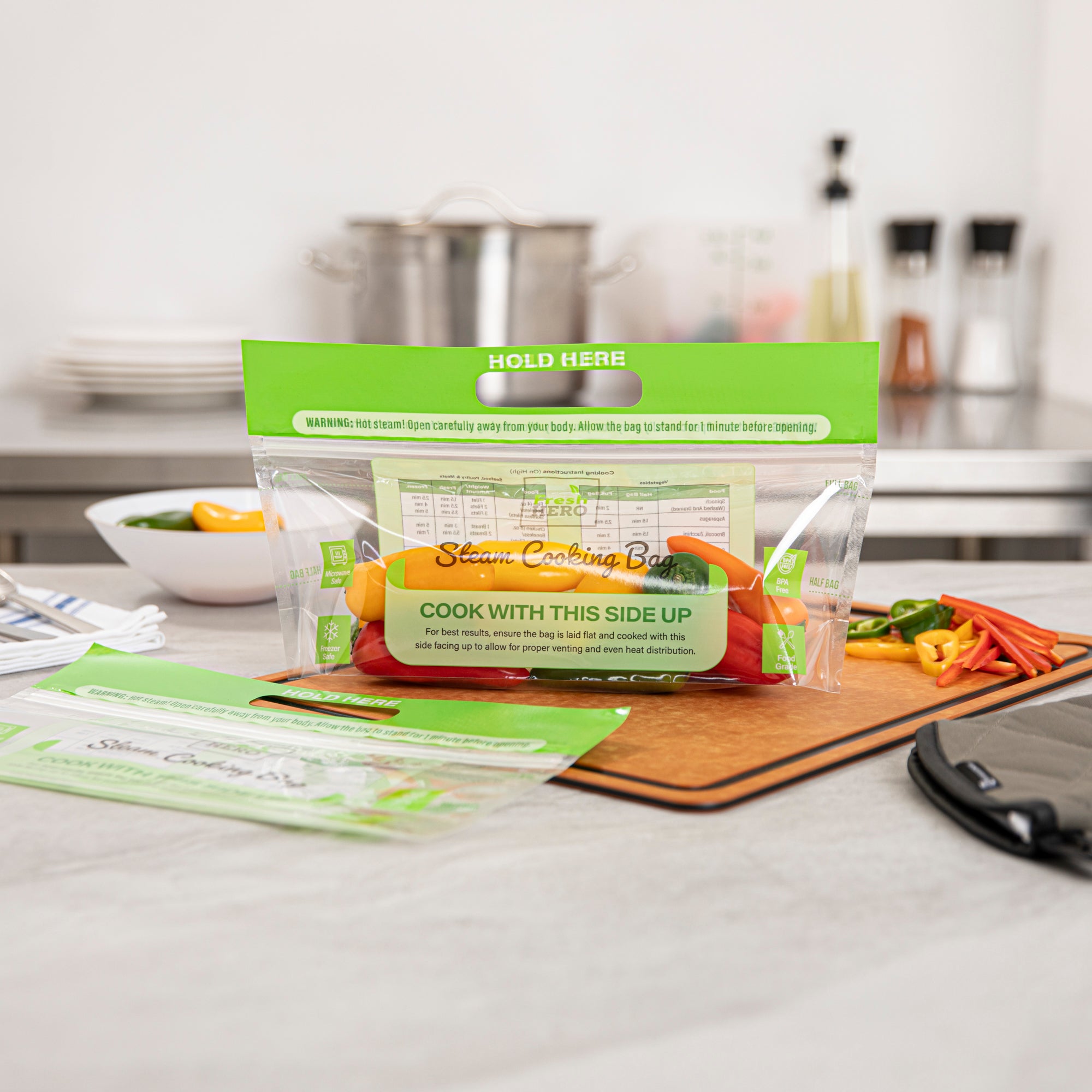 Streamline kitchen operations with versatile microwave steam bags. Fresh Hero Green Plastic Steam Bags are designed with microwave-safe technology, allowing chefs to quickly and efficiently steam food items directly in the bag, significantly reducing preparation time in busy commercial kitchens. These food steaming bags are crafted from BPA-free plastic, ensuring safe food preparation by eliminating harmful chemicals, which aligns perfectly with health-conscious foodservice practices. With generous dimensions of 12.8 inches by 7.5 inches, these disposable cooking bags can accommodate a variety of food portions, making them ideal for both individual and bulk preparations. Their recyclable and disposable nature offers an eco-friendly cleanup, while their durable construction withstands the rigors of commercial kitchen use, ensuring reliability during food preparation. Each order includes 500 Fresh Hero Green Plastic Steam Bags.