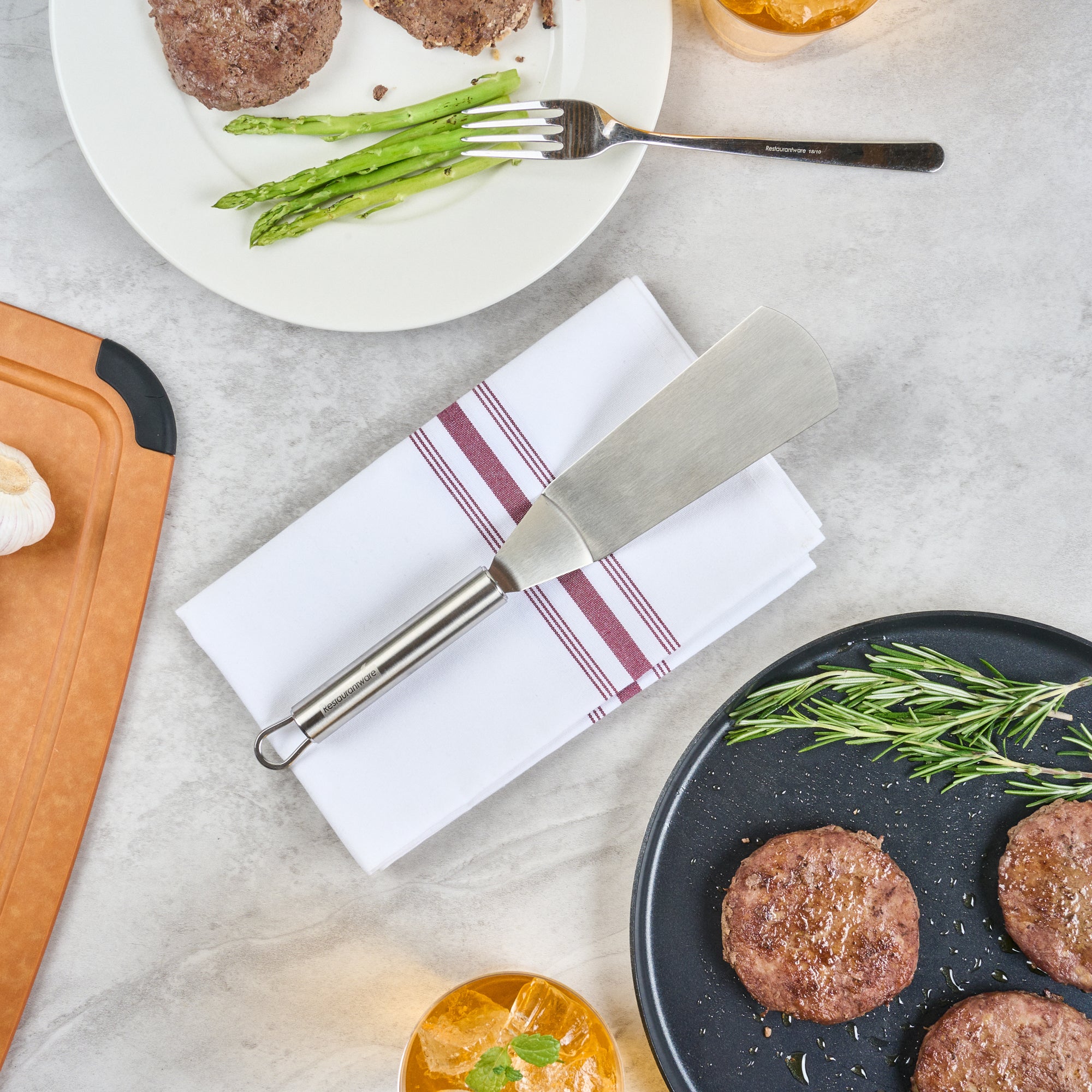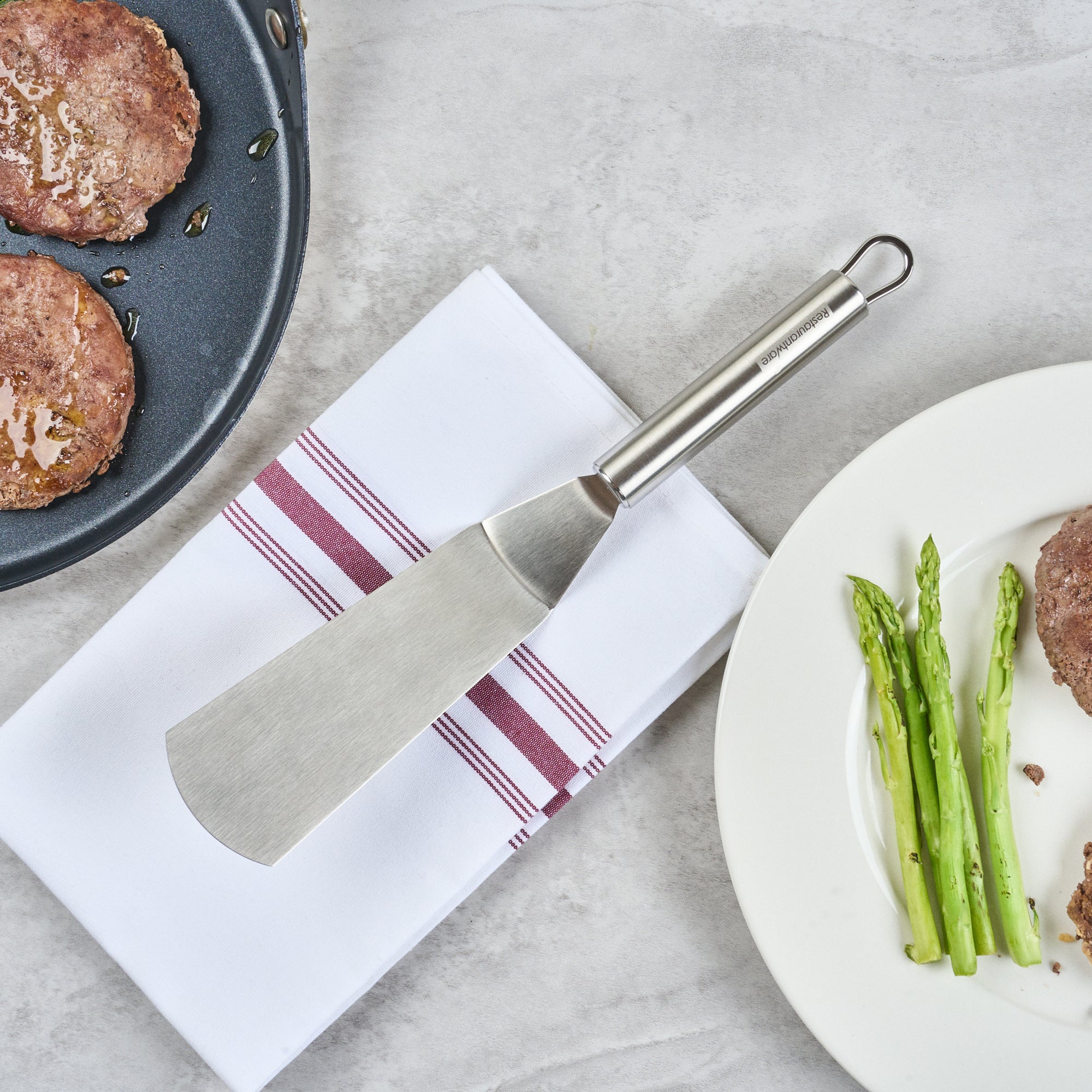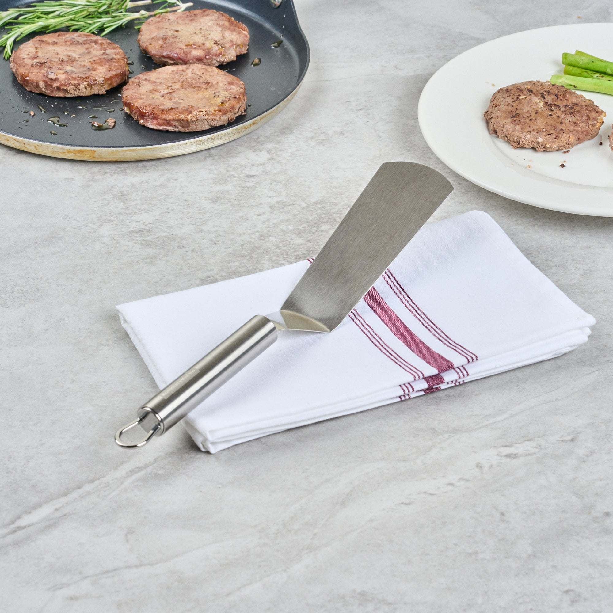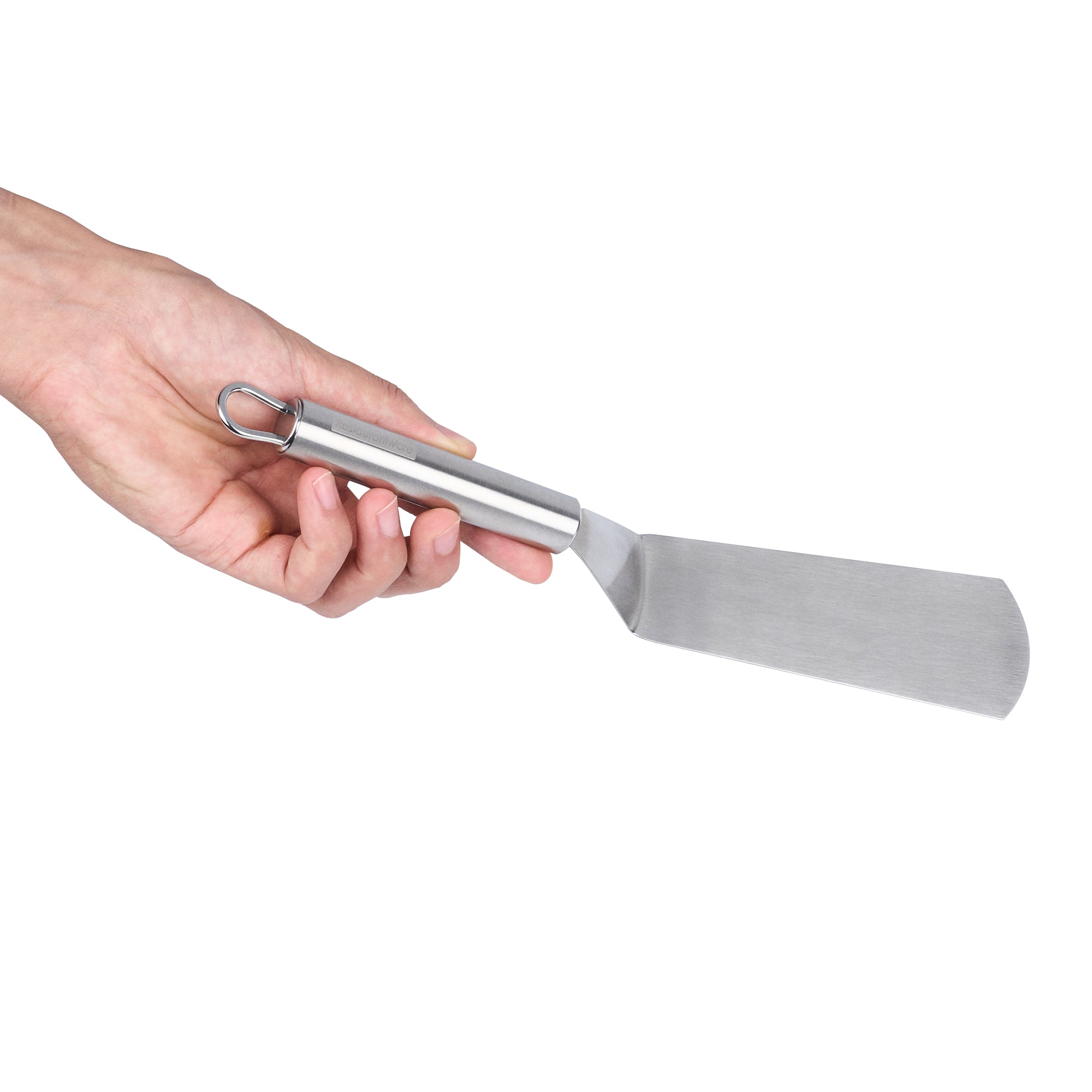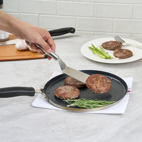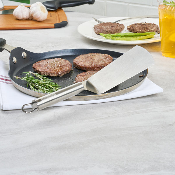 Enhance your kitchen efficiency with ergonomic precision. The German Standard Ergonomic Grip Turner features a flat, wide blade designed for effortless flips, impressing clients with your culinary skills. Crafted from stainless steel, this 11-inch utensil withstands the rigors of frequent use. Its ergonomically designed handle provides a comfortable grip, significantly reducing hand fatigue during extended use, a crucial advantage for busy chefs handling food serving plates. Additionally, this turner is dishwasher safe, offering a convenient post-service cleanup, so you can focus more on preparing delectable dishes and less on washing up. Its sleek, silver finish complements any kitchen setup, seamlessly integrating with rectangular angle plates for a cohesive dining experience. Elevate your kitchen's functionality and style with this indispensable tool. Each order includes 1 German Standard Ergonomic Grip Turner.