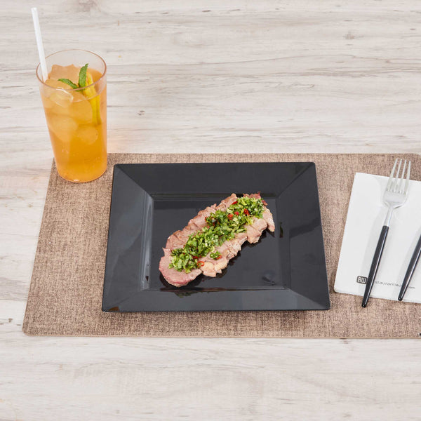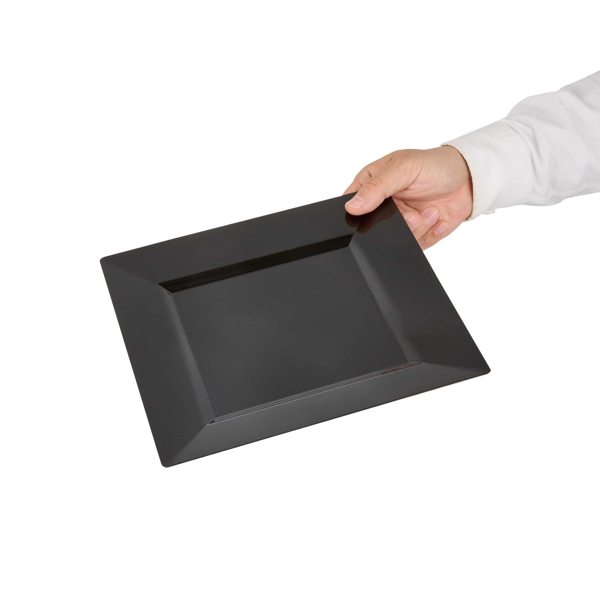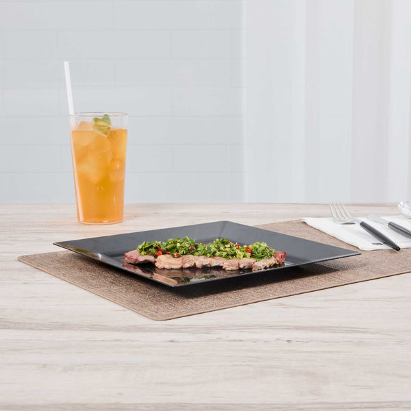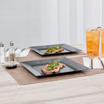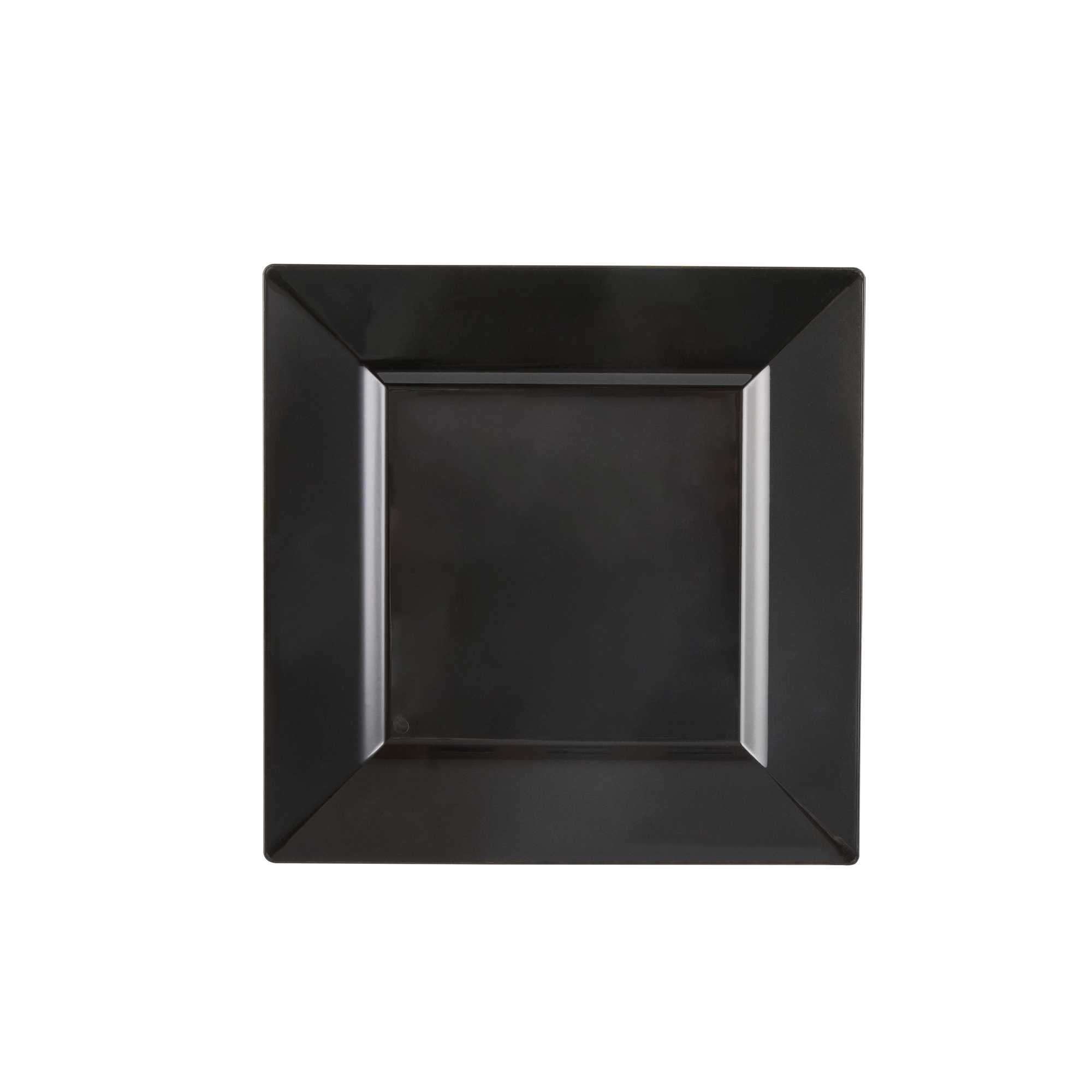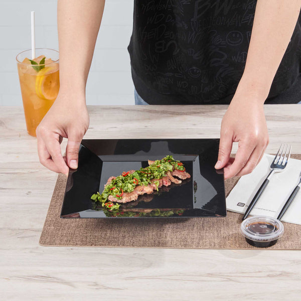 Revamp your dining experience with our Maxi Serve Square Black Plastic Modern Plates. Made out of premium plastic, these dinner plates assure durability and resistance to breaks. These environment-friendly plastic plates are detailed with a geometric square design, adding an arresting element to your culinary displays with their chic style. Designed with raised edges on the sides, these disposable dinner plates ensure a secure holding of food. The feature of disposability of these elegant dinner plates ensures an efficient foodservice process and effortless cleanup. The sophisticated black finish of these elegant dinner plates delivers a refined touch to any event setting. Measuring dimensions of 9.5 inches in length by 9.5 inches in width, these stylish appetizer plates are indeed a great asset. Sold in a 100 count box.