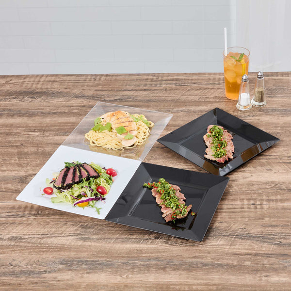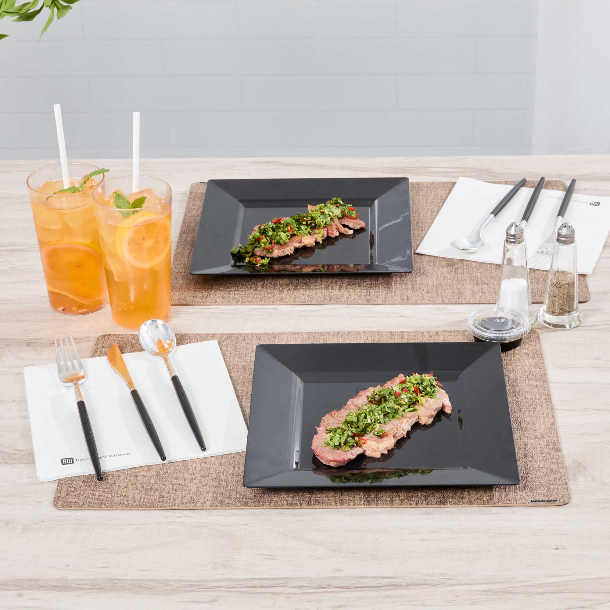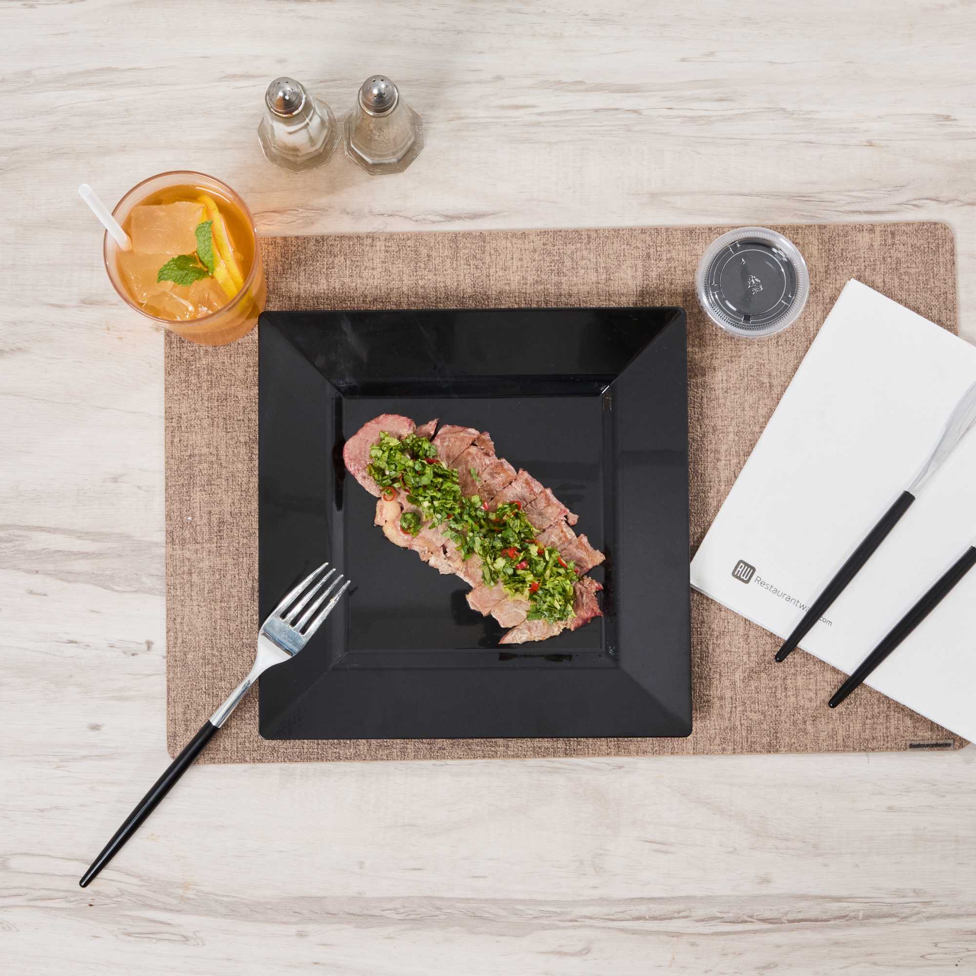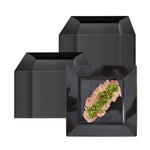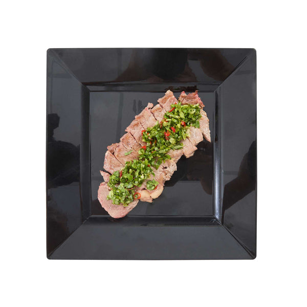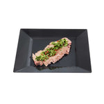 Revamp your dining experience with our Maxi Serve Square Black Plastic Modern Plates. Made out of premium plastic, these dinner plates assure durability and resistance to breaks. These environment-friendly plastic plates are detailed with a geometric square design, adding an arresting element to your culinary displays with their chic style. Designed with raised edges on the sides, these disposable dinner plates ensure a secure holding of food. The feature of disposability of these elegant dinner plates ensures an efficient foodservice process and effortless cleanup. The sophisticated black finish of these elegant dinner plates delivers a refined touch to any event setting. Measuring dimensions of 9.5 inches in length by 9.5 inches in width, these stylish appetizer plates are indeed a great asset. Sold in a 100 count box.