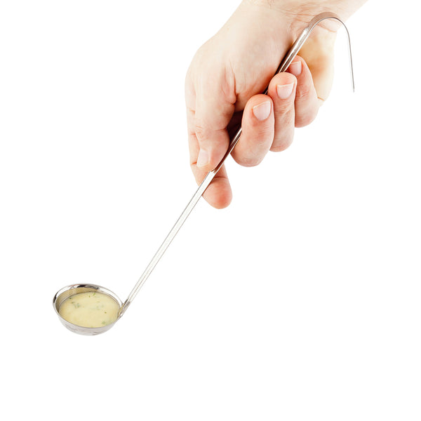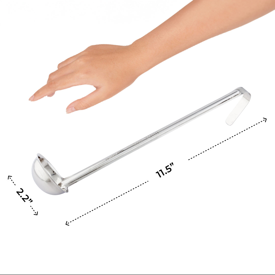 Serve sauces or glazes with our Met Lux 1-Ounce Stainless Steel Serving Ladle. This serving spoon is crafted from stainless steel and is suitable for long-lasting use as it won't corrode or rust easily. Engraved with a capacity marker, this stainless steel spoon contains up to 1 ounce and is the ideal tool for precise and elegant serving, ensuring your dishes are beautifully presented with just the right amount of garnish or sauce. The long handle of this serving ladle has a slight curved at the end offers a more comfortable grip and better control when scooping and pouring liquids, such as soups, stews, or sauces. This sauce spoon is dishwasher-safe to simplify your cleaning process after meals. Measuring 11.5 inches long by 2.25 inches wide by 1 inch tall, this soup spoon can hold up to 1 ounce. Sold in a 1 count box.