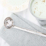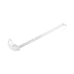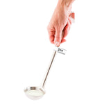 Serve gravies with our Met Lux 2-Ounce Stainless Steel Serving Ladle. Crafted from premium stainless steel, this serving spoon boasts a durable construction suitable for heavy-duty use as it won't corrode or rust. This stainless steel spoon is engraved with a capacity marker that it can hold 2 ounces, perfect for serving consistent portions. The long handle of this soup spoon has a curved end to provide a comfortable grip to facilitate a controlled pouring of liquids. Dishwasher-safe, this sauce spoon simplifies your cleanup routine. This serving ladle measures 11.75 inches long by 2.75 inches wide by 1 inch tall and can hold up to 2 ounces. Sold in a 1 count box.