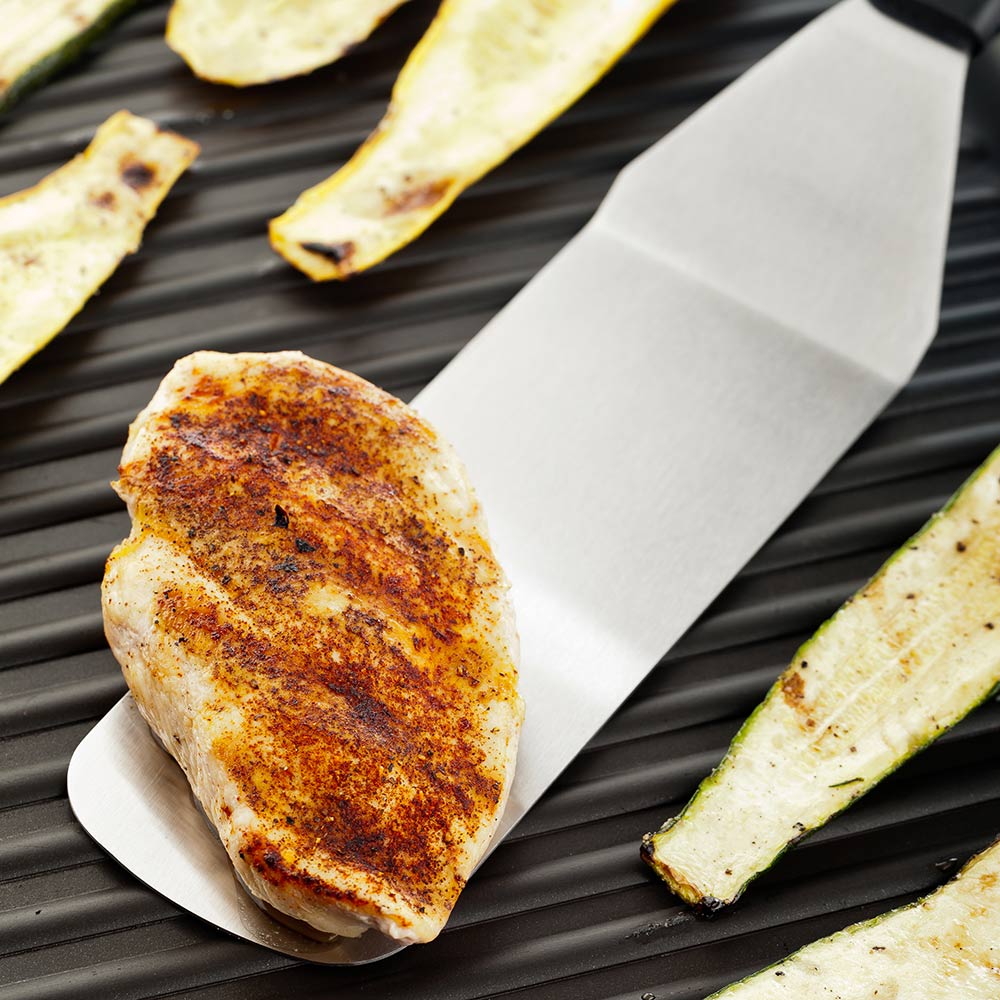 - Solid design slides underneath the food for effortless flipping, turning or serving