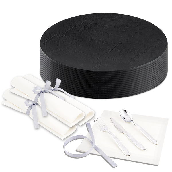 Elevate your next catered event with our Bundle: Mini Serve Round Black Plastic Medium Plates with Moderna Silver Plastic Cutlery Sets for an elegant and practical dining experience. This bundle includes 100 premium black plastic plates and 100 modern silver plastic cutlery sets, providing you with a complete tableware solution. The chic round design of the black plates mimics the look of slate, enhancing the presentation of your culinary creations while remaining lightweight and portable for easy handling. These disposable plates are robustly crafted from premium plastic, ideal for serving wet, dry, and cold food items with their elegant black finish suitable for all types of table settings. Complementing the plates are the silver cutlery sets, each featuring a spoon, fork, and knife tied with an elegant silver ribbon, adding a modern touch to your café, restaurant, or catered event. Built from premium plastic, these disposable cutlery sets are wrapped in white napkins, allowing customers to enjoy their meals without messes. The plates measure 8.7 inches in diameter, providing ample space for portions of your signature dishes. Each order includes 100 plastic plates and 100 cutlery sets.
