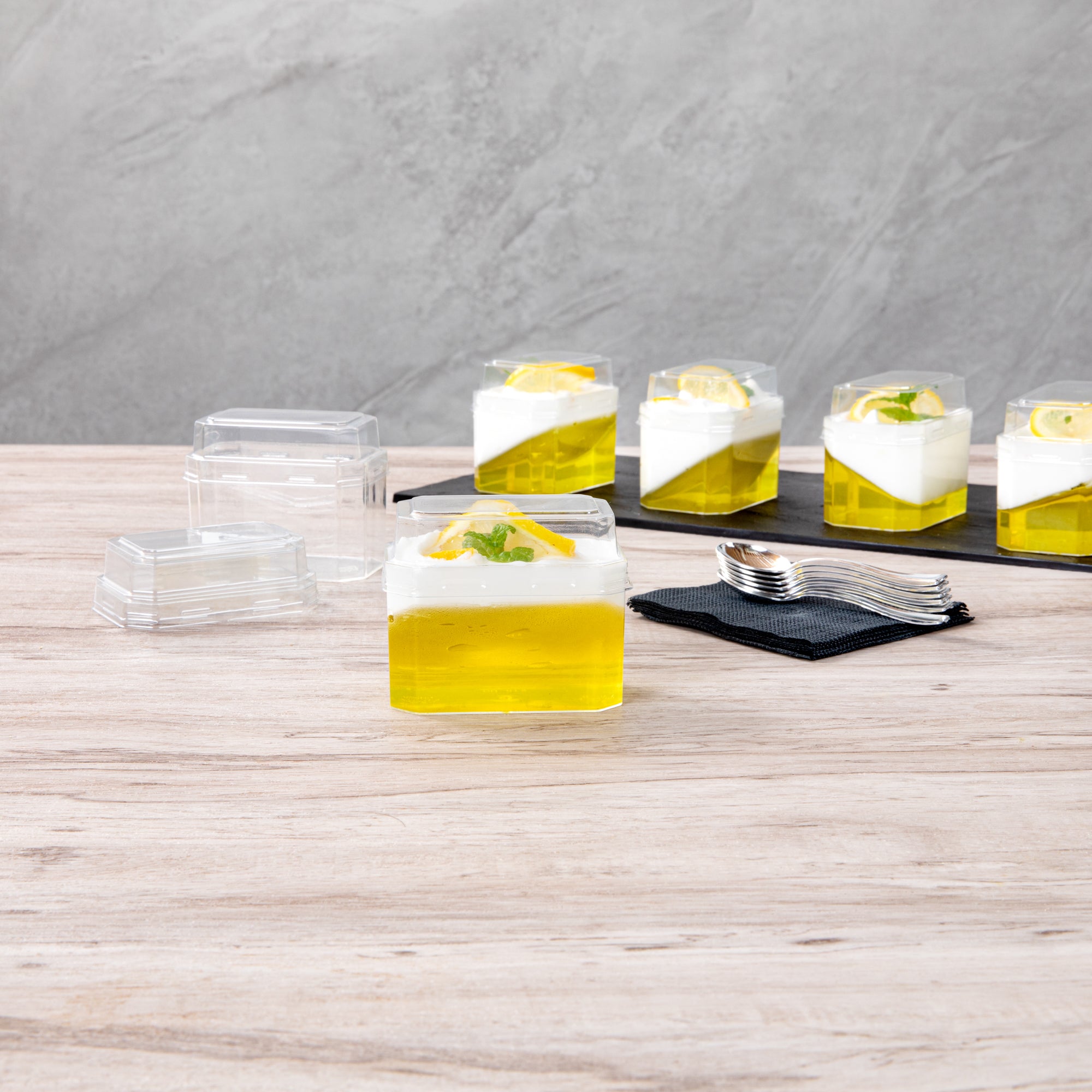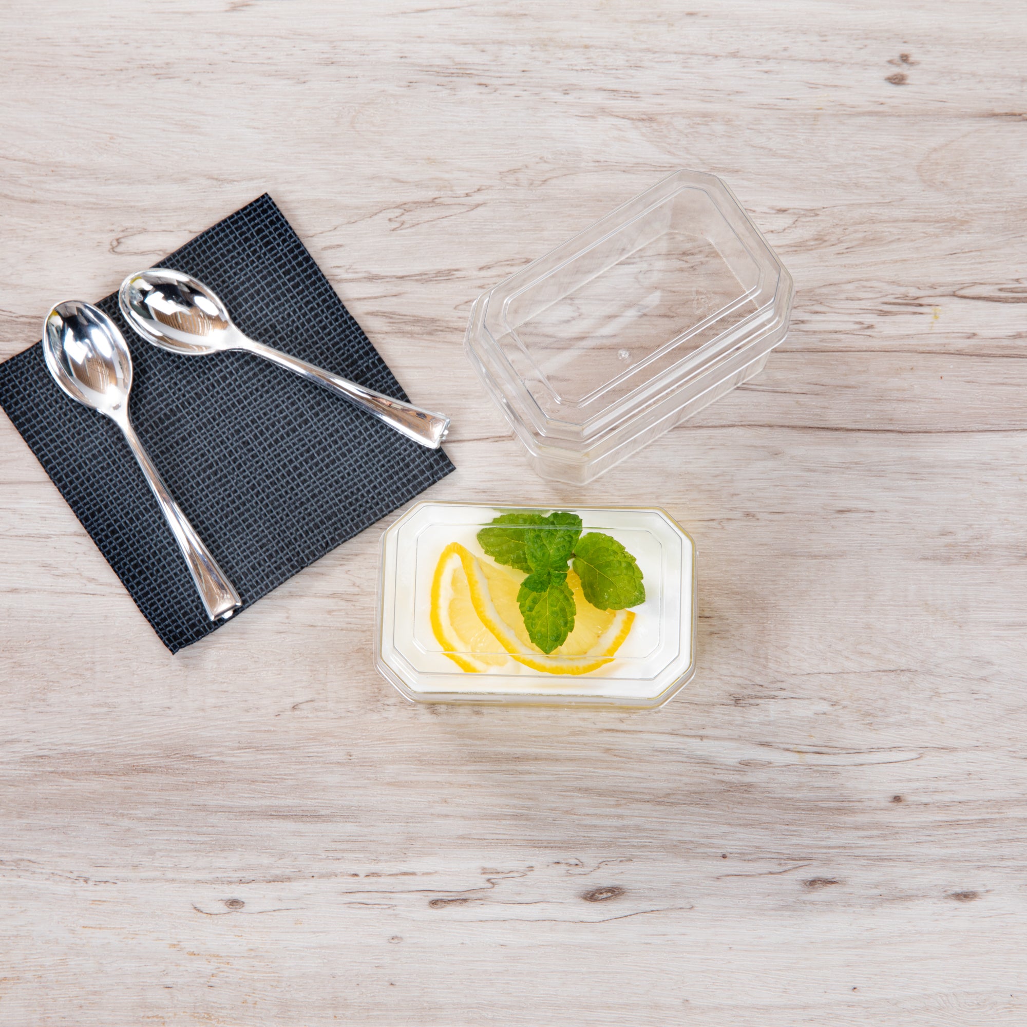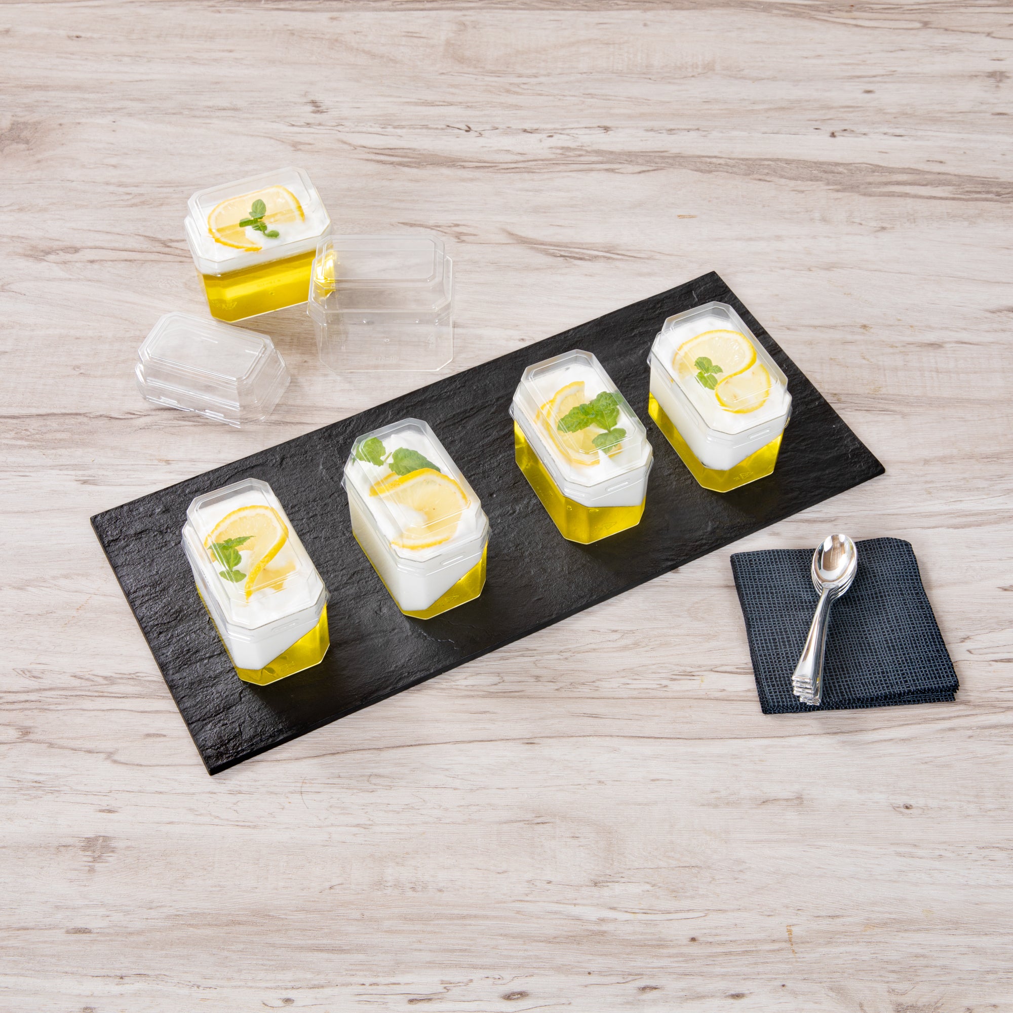 Make your dessert presentation unforgettable with our Mini Serve 3-ounce Rectangle Clear Plastic Dessert Cups. Crafted from durable PS plastic, these plastic dessert glasses are designed to withstand even the most decadent of desserts. With their clear finish, these clear dessert cups effortlessly showcase the enticing layers of your culinary creations, making them perfect for individual servings of tiramisu, fruit parfaits, or chocolate mousse. These stackable dessert cups save valuable storage space in your kitchen or dessert station. Ideal for any catered event or restaurant, these disposable clear recyclable plastic dessert cups come with matching lids, making them an ideal option for takeaway treats or pre-portioned servings. With a capacity of 3 ounces, these dessert cups with lids are perfect for serving just the right amount of sweet delight. Measuring 3.25 inches in length by 2 inches in width by 2 inches in height, these clear dessert cups with lids are compact yet spacious enough to hold a variety of desserts. Sold in a 100 count box.