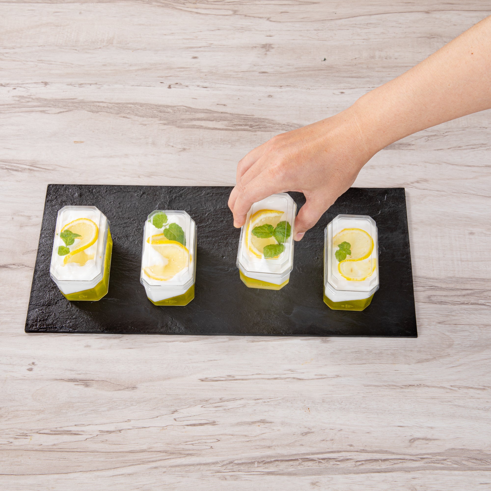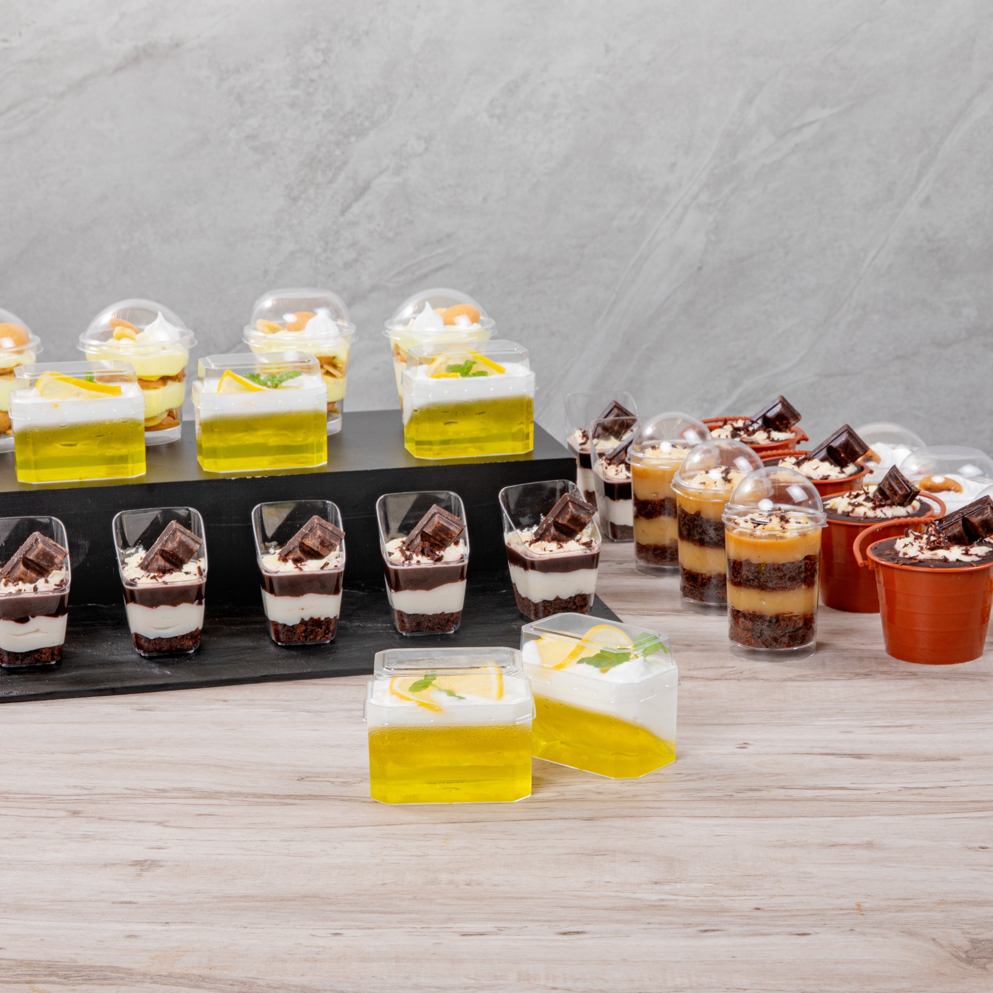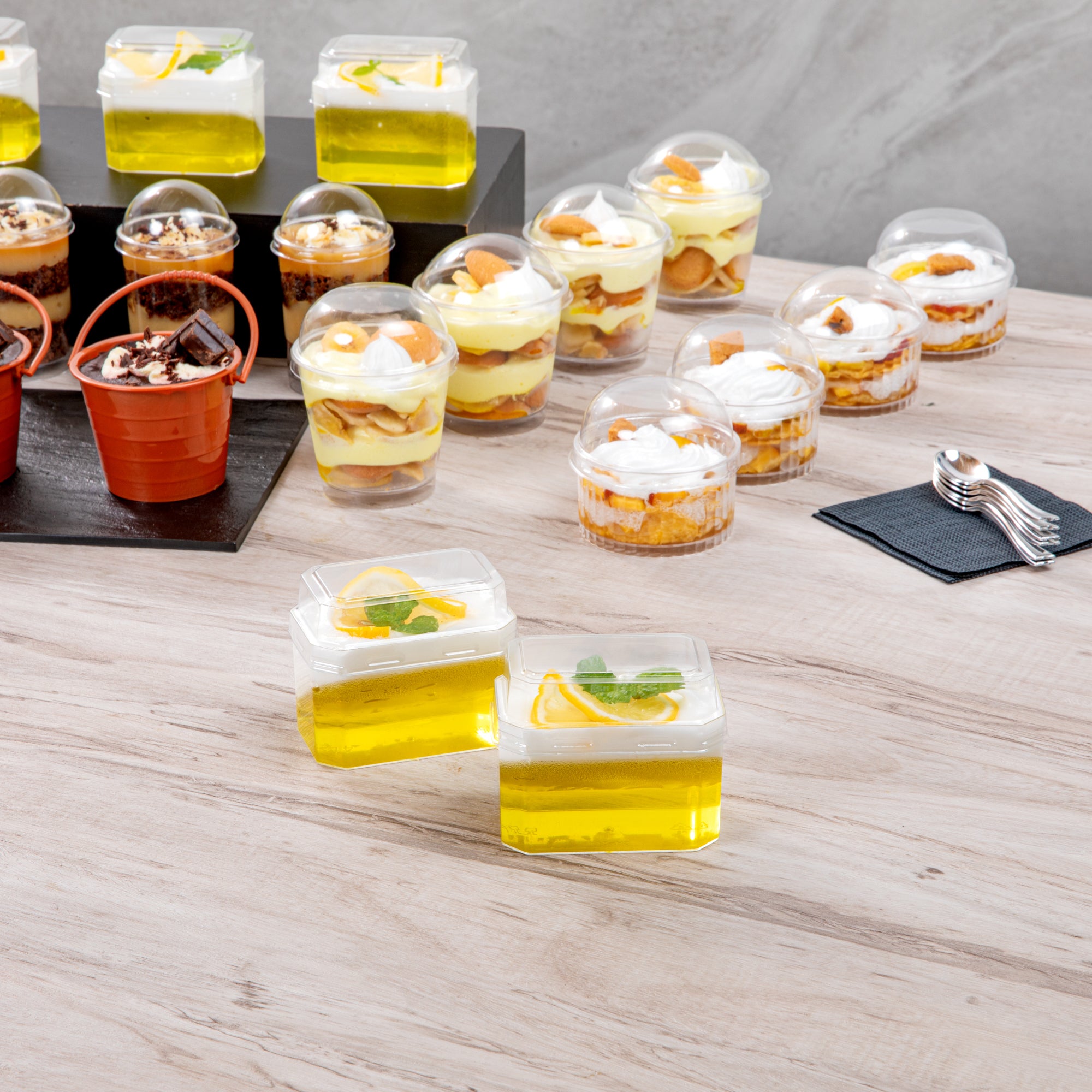Make your dessert presentation unforgettable with our Mini Serve 3-ounce Rectangle Clear Plastic Dessert Cups. Crafted from durable PS plastic, these plastic dessert glasses are designed to withstand even the most decadent of desserts. With their clear finish, these clear dessert cups effortlessly showcase the enticing layers of your culinary creations, making them perfect for individual servings of tiramisu, fruit parfaits, or chocolate mousse. These stackable dessert cups save valuable storage space in your kitchen or dessert station. Ideal for any catered event or restaurant, these disposable clear recyclable plastic dessert cups come with matching lids, making them an ideal option for takeaway treats or pre-portioned servings. With a capacity of 3 ounces, these dessert cups with lids are perfect for serving just the right amount of sweet delight. Measuring 3.25 inches in length by 2 inches in width by 2 inches in height, these clear dessert cups with lids are compact yet spacious enough to hold a variety of desserts. Sold in a 100 count box.