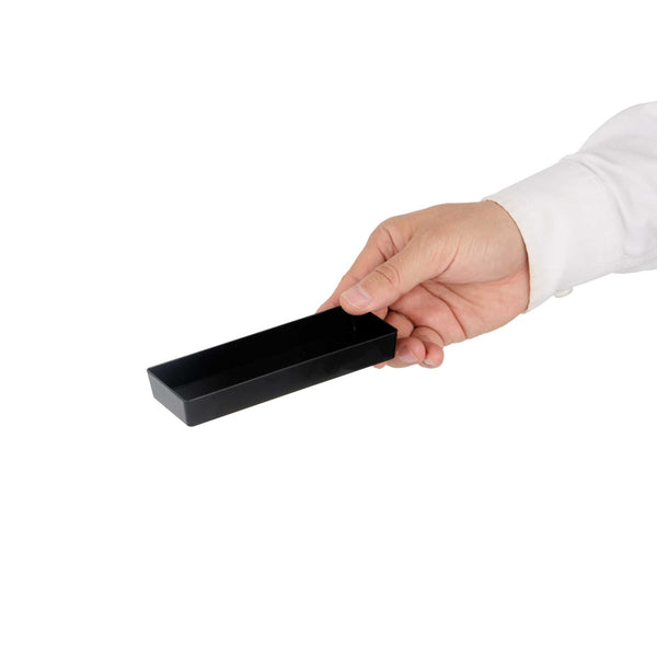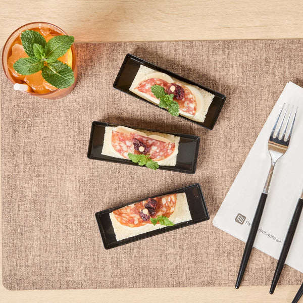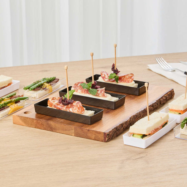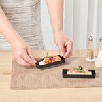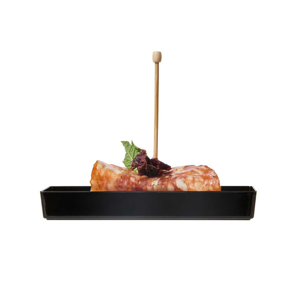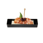 Elevate your food presentation with our Mini Serve Rectangle Black Plastic Modern Plates. Constructed from recyclable plastic, these rectangular appetizer plates provide strength and sturdiness, ensuring reliability while offering an eco-friendly choice. Designed for convenient disposal, these appetizer dinnerware plates simplify post-event cleanup. The raised edges of these disposable plates ensure secure food containment. Flaunting an elegant black finish and a sleek rectangular shape, these plastic plates will enhance the aesthetic of your dishes, making for a stylish presentation. Measuring 5.25 inches in length by 1.75 inches in width, these rectangular entree plates elegantly hold your food items. Sold in a 100 count box.