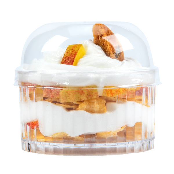 Elevate your dessert presentations with our Mini Serve Round Clear Plastic Dome Lids. These plastic dome lids, crafted from durable PS plastic, are built to withstand the rigors of any bustling kitchen or event. The clear dome lid's unique design not only showcases the appealing aesthetics of your cold food offerings but also provides extra space for dessert toppings. With a clear finish, these recyclable dessert cup lids allow for easy identification and display of your sweet treats, making them perfect for buffets, catering events, or dessert shops. The stackable design of these clear plastic lids ensures efficient storage, saving valuable space in your kitchen. These disposable plastic dome lids provide an easy cleanup after use. Measuring 3 inches in diameter by 1.25 inches in height, these clear dome lids are designed to pair perfectly with our 4-ounce fluted dessert cups (RWP1416C), creating a uniform and professional look. Sold in a 100 count box. Dessert cups are available and sold separately.
