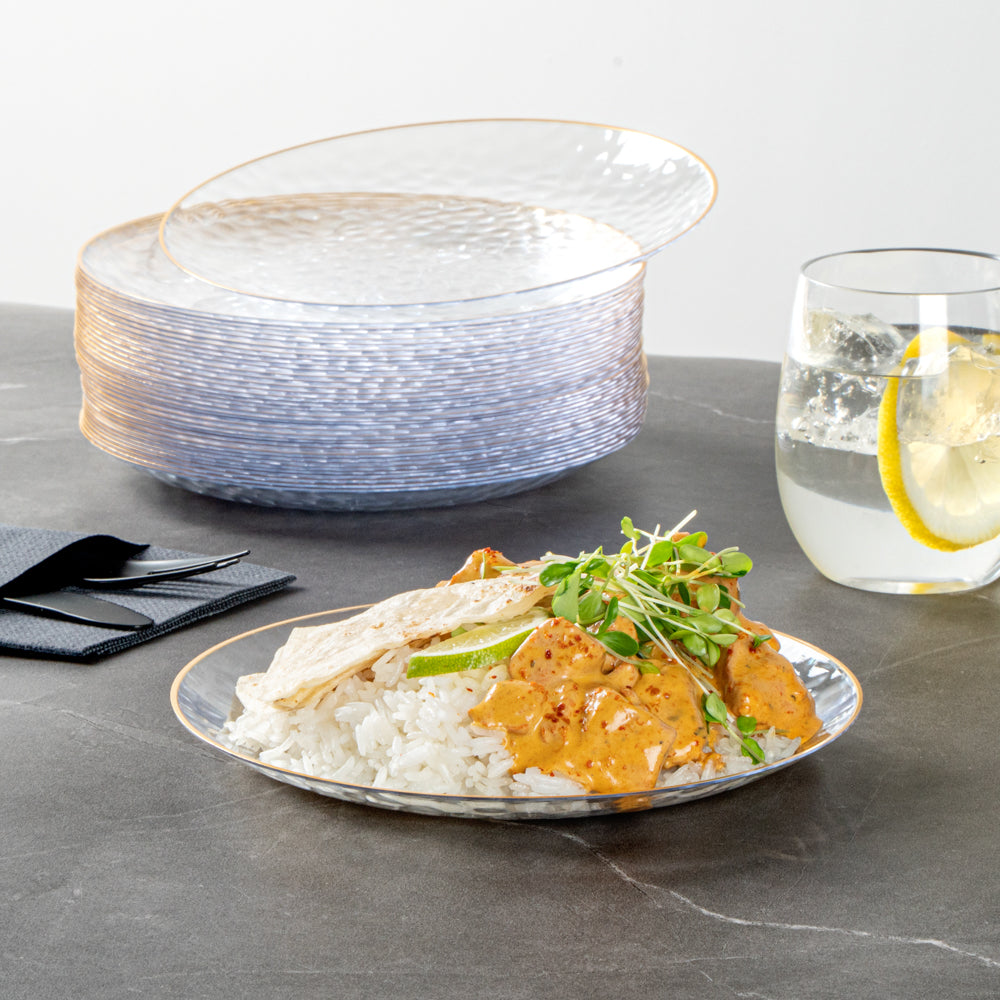 ROUND CLEAR PLASTIC GOLD-RIMMED PLATE - HAMMERED