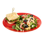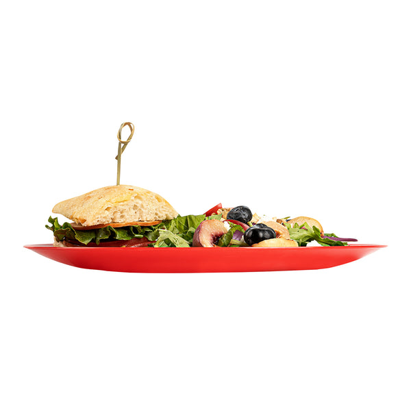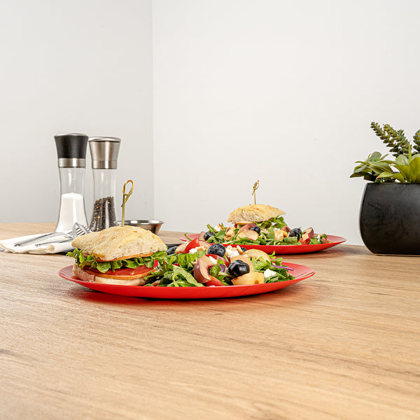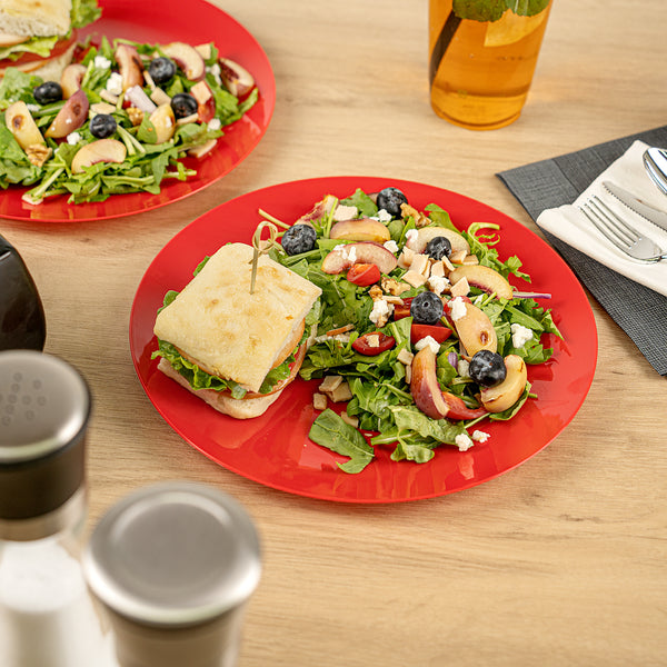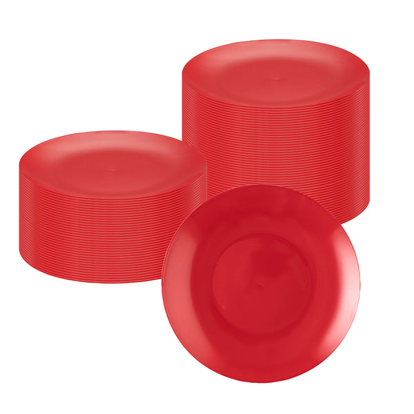 Upgrade your dinnerware collection with our Moderna Round Red Plastic Plates. Crafted from sturdy PS plastic, these fancy dinner plates boast heavy-duty construction. These premium plastic plates can be recycled, reducing the environmental impact of your event. With a temperature resistance of up to 150F, these red dinner plates ensure you can confidently serve warm and cold foods. These dinner plates exhibit resistance to grease, providing a clean dining experience. For your convenience, these unique plastic plates are disposable, saving you from the hassle of washing them after events. With their vibrant red finish, these greaseproof party plastic plates bring a festive element to your tableware. Measuring 10.25 inches in diameter, these plastic plates are ideal for serving all kinds of starters, entrees, and desserts. Shipped in a 200 count box.