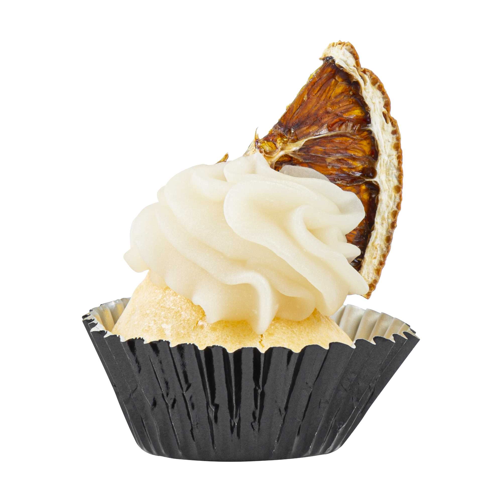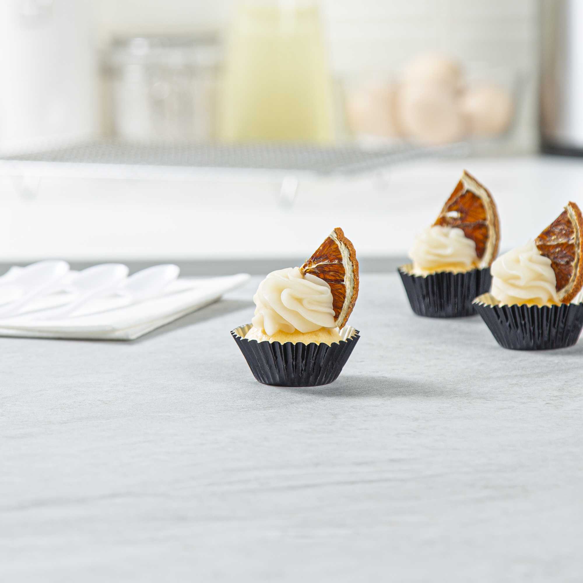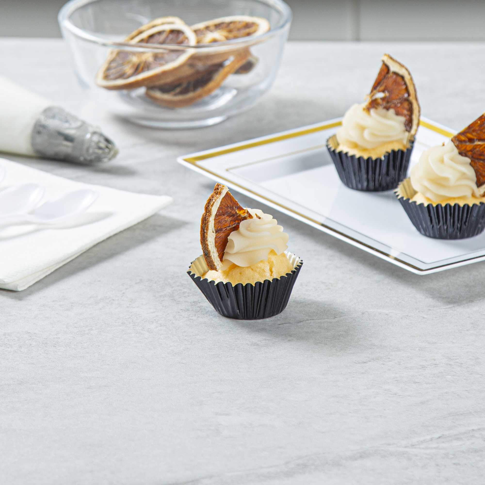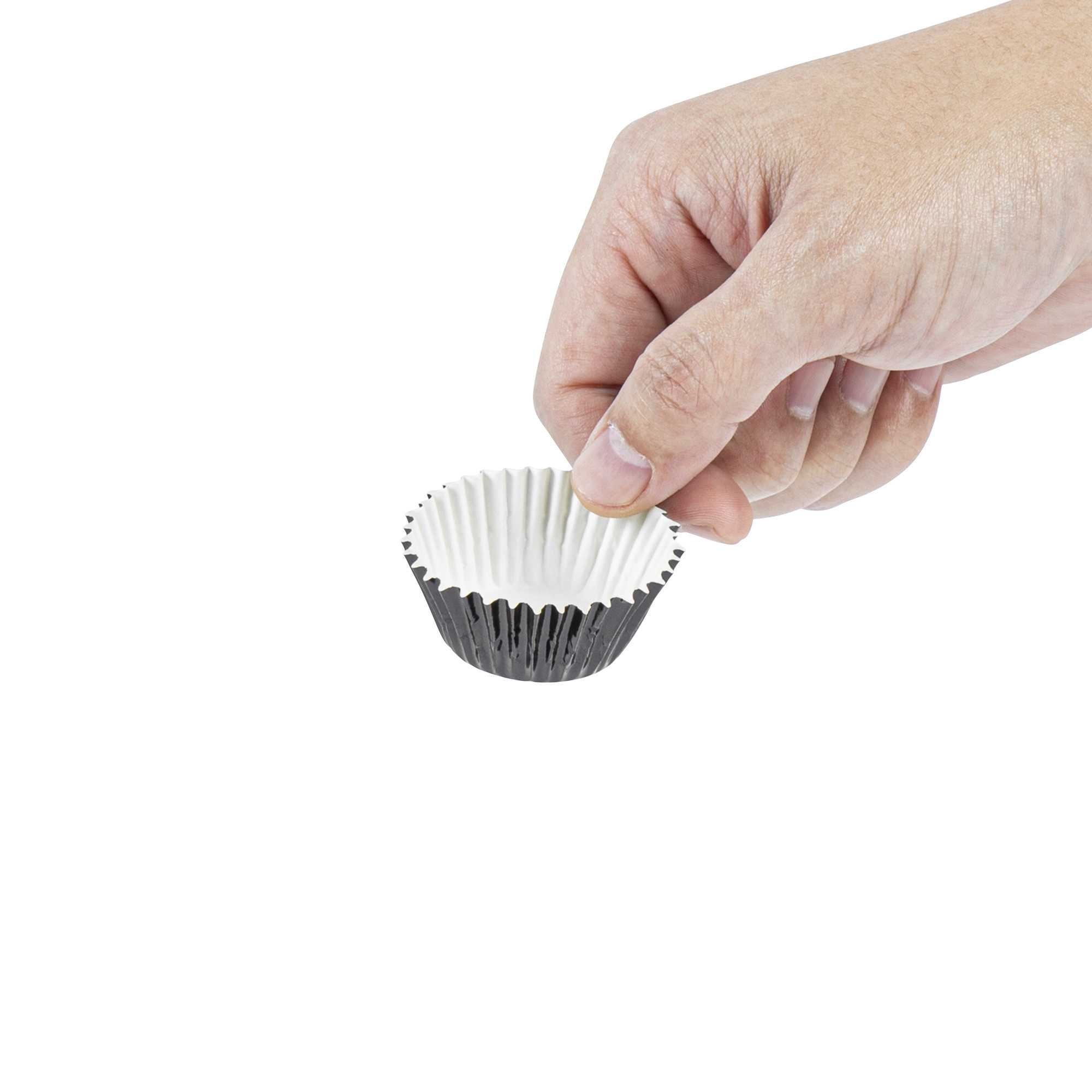 Perfectly prepare miniature buttermilk muffins and bite-sized buttercream cupcakes in our Panificio 0.4-ounce Metallic Black Foil-Coated Paper Baking Cups. Conveniently oven-safe and freezer-safe, you can use these versatile mini baking cups to prepare decadent bite-sized desserts -- or to stylishly serve miniature appetizers! Their grease-resistant paper construction expertly stands up to oily foods and buttery batters, while their black foil-coated exterior provides additional protection against messes. Each of these sturdy foil cupcake liners has a diameter of 1.2 inches, with a total capacity of 0.4 ounces. These 0.4-ounce black metallic mini cupcake wrappers are sold in a bulk 200 count box.