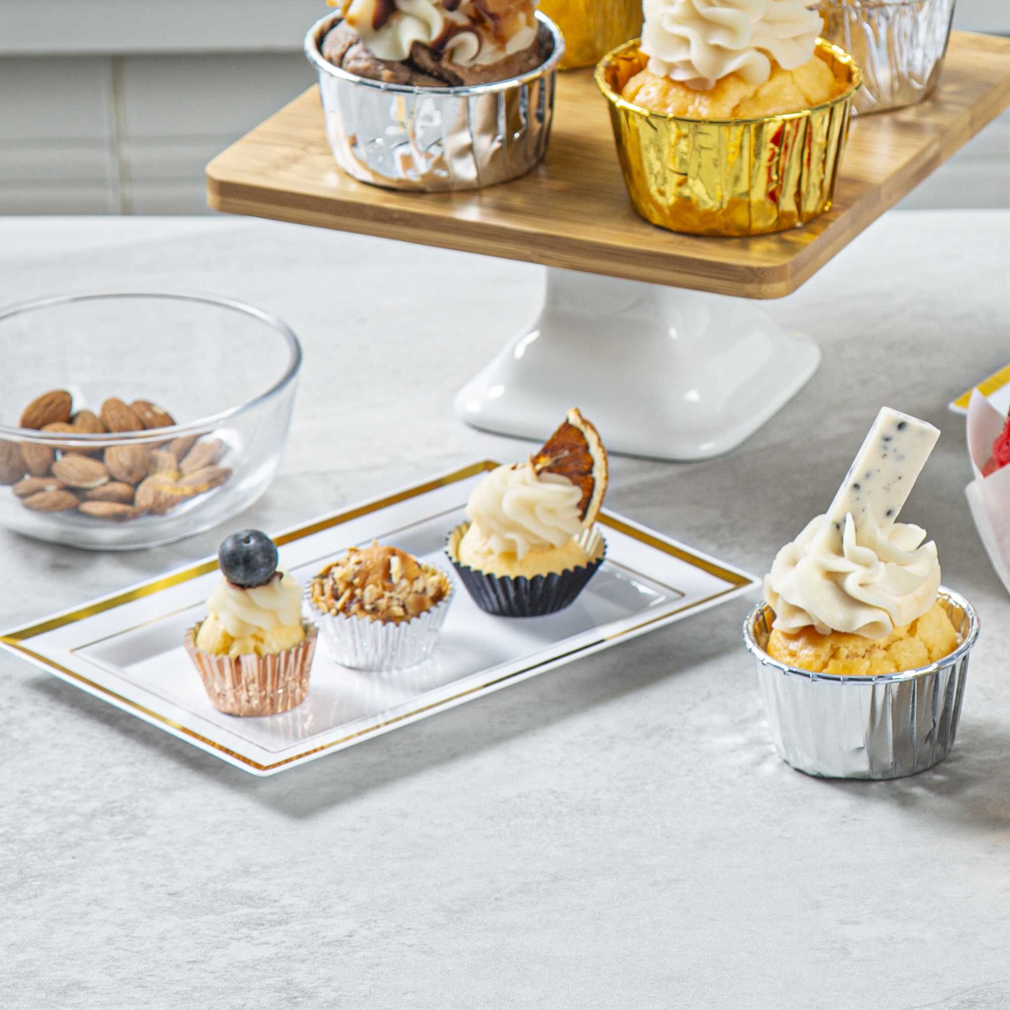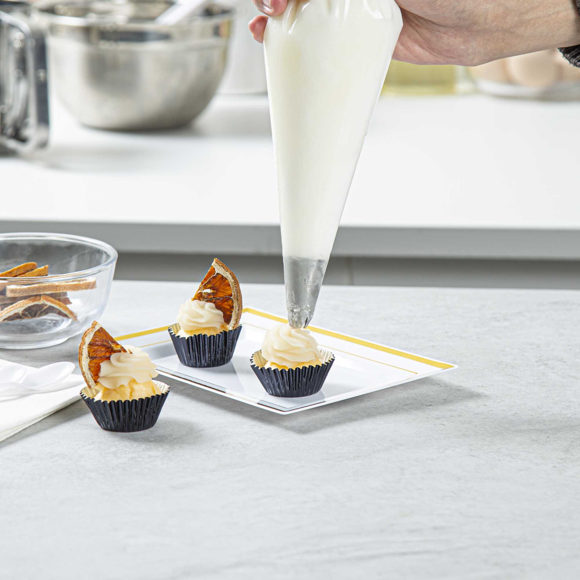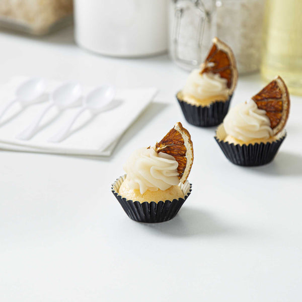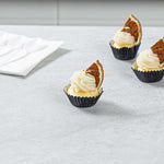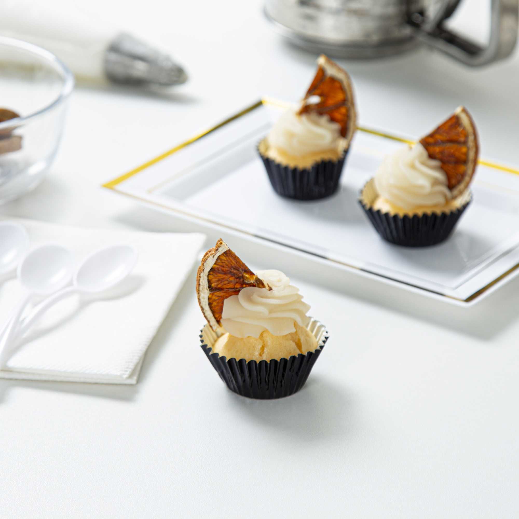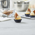 Perfectly prepare miniature buttermilk muffins and bite-sized buttercream cupcakes in our Panificio 0.4-ounce Metallic Black Foil-Coated Paper Baking Cups. Conveniently oven-safe and freezer-safe, you can use these versatile mini baking cups to prepare decadent bite-sized desserts -- or to stylishly serve miniature appetizers! Their grease-resistant paper construction expertly stands up to oily foods and buttery batters, while their black foil-coated exterior provides additional protection against messes. Each of these sturdy foil cupcake liners has a diameter of 1.2 inches, with a total capacity of 0.4 ounces. These 0.4-ounce black metallic mini cupcake wrappers are sold in a bulk 200 count box.