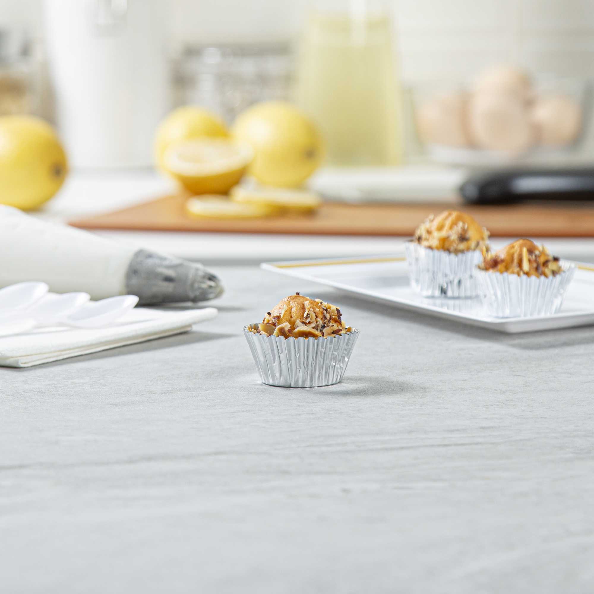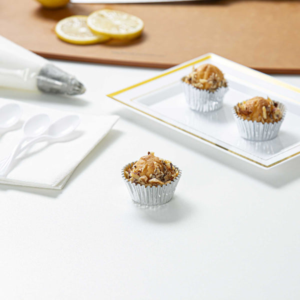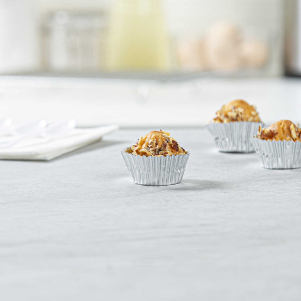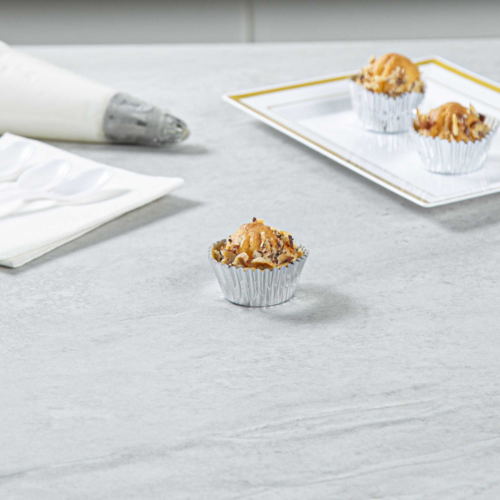 Present your bite-sized confections with our Panificio 0.4 oz Round Metallic Silver Paper Baking Cups. The external foil coat of these baking cups exudes ultra-chic vibes for your confectionary presentation. Crafted from grease-resistant paper, these mini cupcake wrappers offer extra protection against spills and stains. These mini cupcake liners are oven-safe to easily bake your confections. Plus, these paper baking cups are freezable to make cold desserts. These silver baking cups are conveniently disposable after events. Measuring 1.25 inches in diameter by 0.75 inches in height, these round cupcake cups contain up to 0.4 ounces, making them ideal for bakeries, cake shops, and catered events. Shipped in a 200 count box.