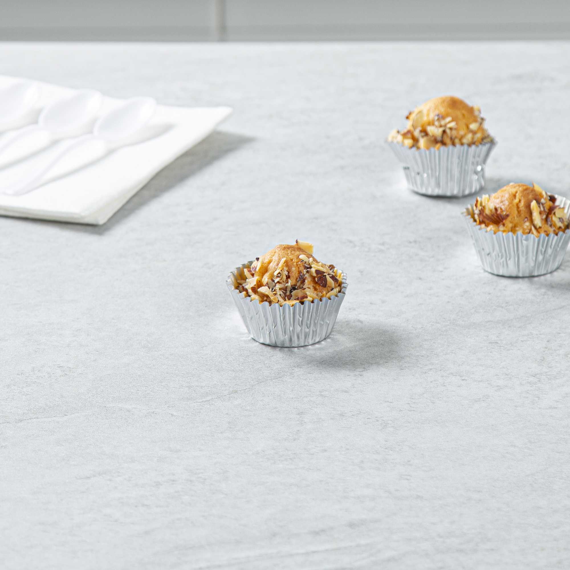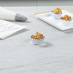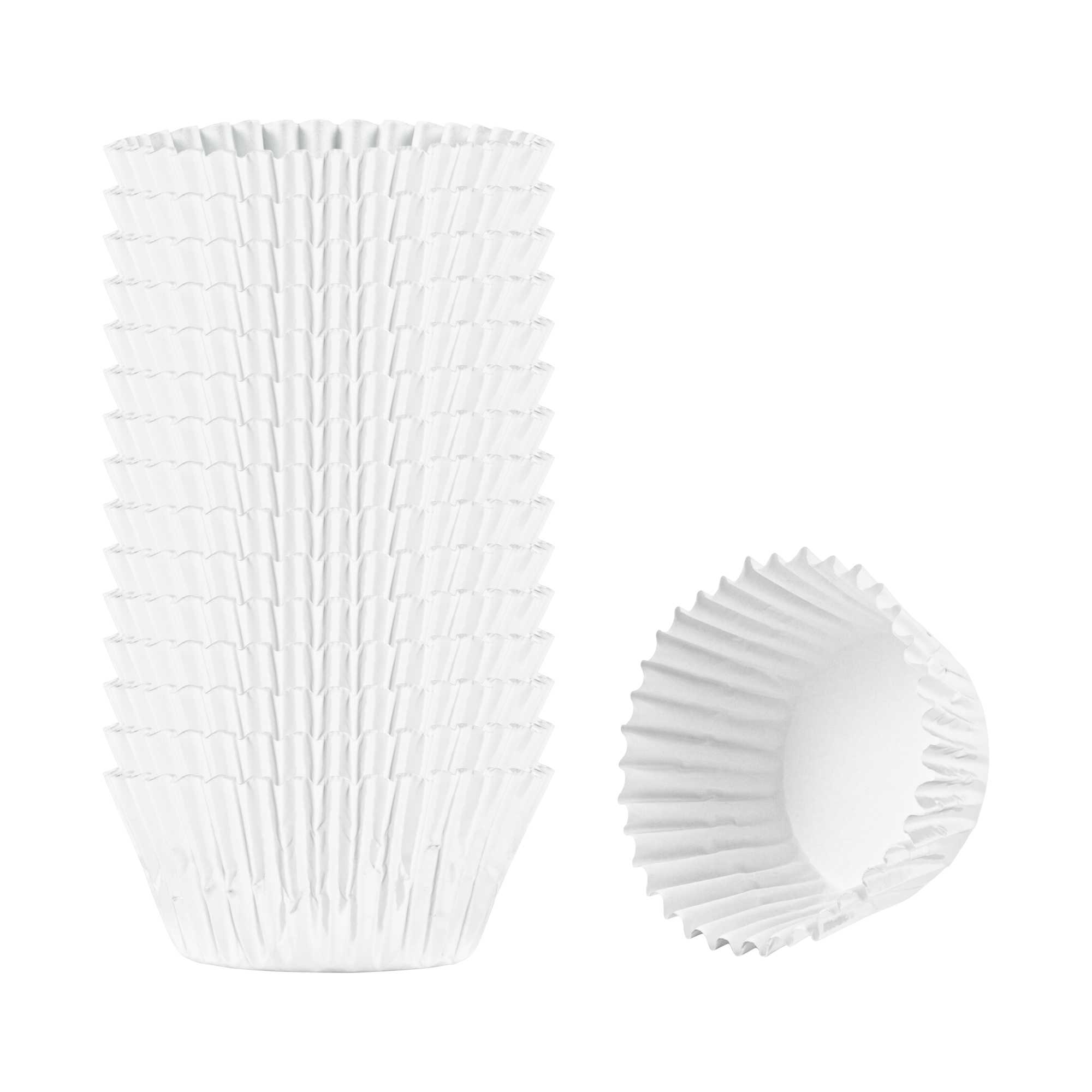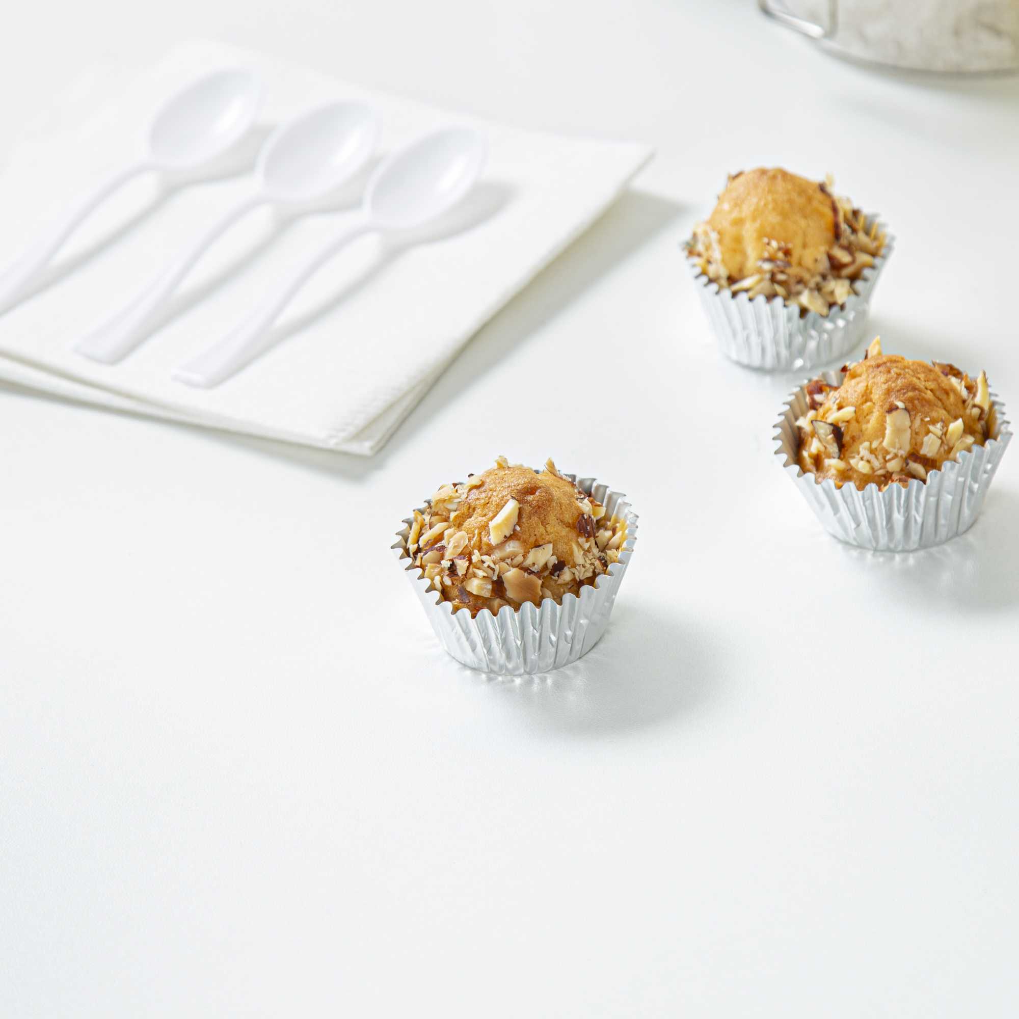 Present your bite-sized confections with our Panificio 0.4 oz Round Metallic Silver Paper Baking Cups. The external foil coat of these baking cups exudes ultra-chic vibes for your confectionary presentation. Crafted from grease-resistant paper, these mini cupcake wrappers offer extra protection against spills and stains. These mini cupcake liners are oven-safe to easily bake your confections. Plus, these paper baking cups are freezable to make cold desserts. These silver baking cups are conveniently disposable after events. Measuring 1.25 inches in diameter by 0.75 inches in height, these round cupcake cups contain up to 0.4 ounces, making them ideal for bakeries, cake shops, and catered events. Shipped in a 200 count box.