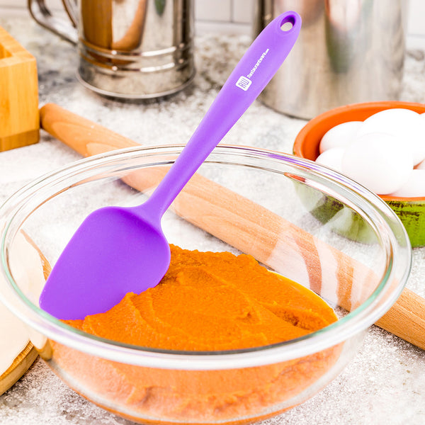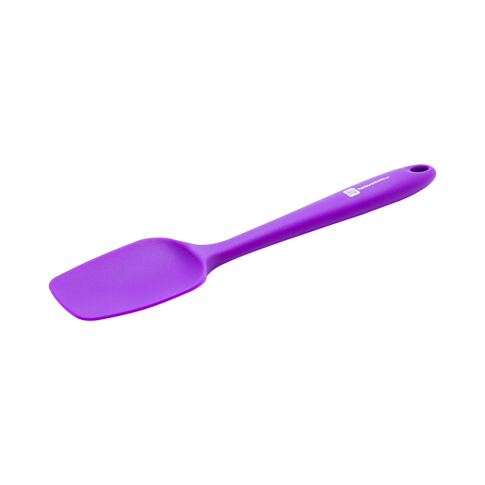 Cooking has never been easier than with our Pastry Tek Purple Spoon-Shaped Silicone Spatula. Heat-resistant up to 570°F, you can saute onions, flip pancakes, and cook and serve your eggs all with the same spatula. This heat-resistant spatula is designed with an easy-grip handle and a reinforced nylon core to easily mix thick batters without the risk of slips. For extra protection, this spatula has a flat base that raises the blade away from surfaces to avoid messes in your kitchen. The blade on this purple silicone spatula also has blunted edges, keeping your precious bowls, pans, or plates scratch-free! Conveniently dishwasher-safe, this sturdy silicone spatula is great for an effortless cleanup after use. After you're done, store this spatula using the hole at the tip of the handle for easy hanging on hooks. The vibrant purple finish on this silicone spatula makes it easy to identify your allergen-free cookware. This purple spatula is 10.5 inches long and its blade is 2.25 inches wide. Each order brings 1 silicone spatula.
