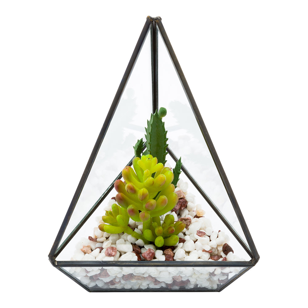 FAUX SUCCULENT ARRANGEMENT - TRIANGULAR GLASS TERRARIUM, BLACK