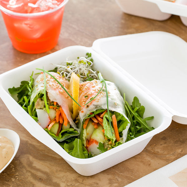 Made from sugarcane fibers, also known as bagasse, these containers are sustainable. Choose from a natural brown finish or a sleek white finish to complement your to-go orders.